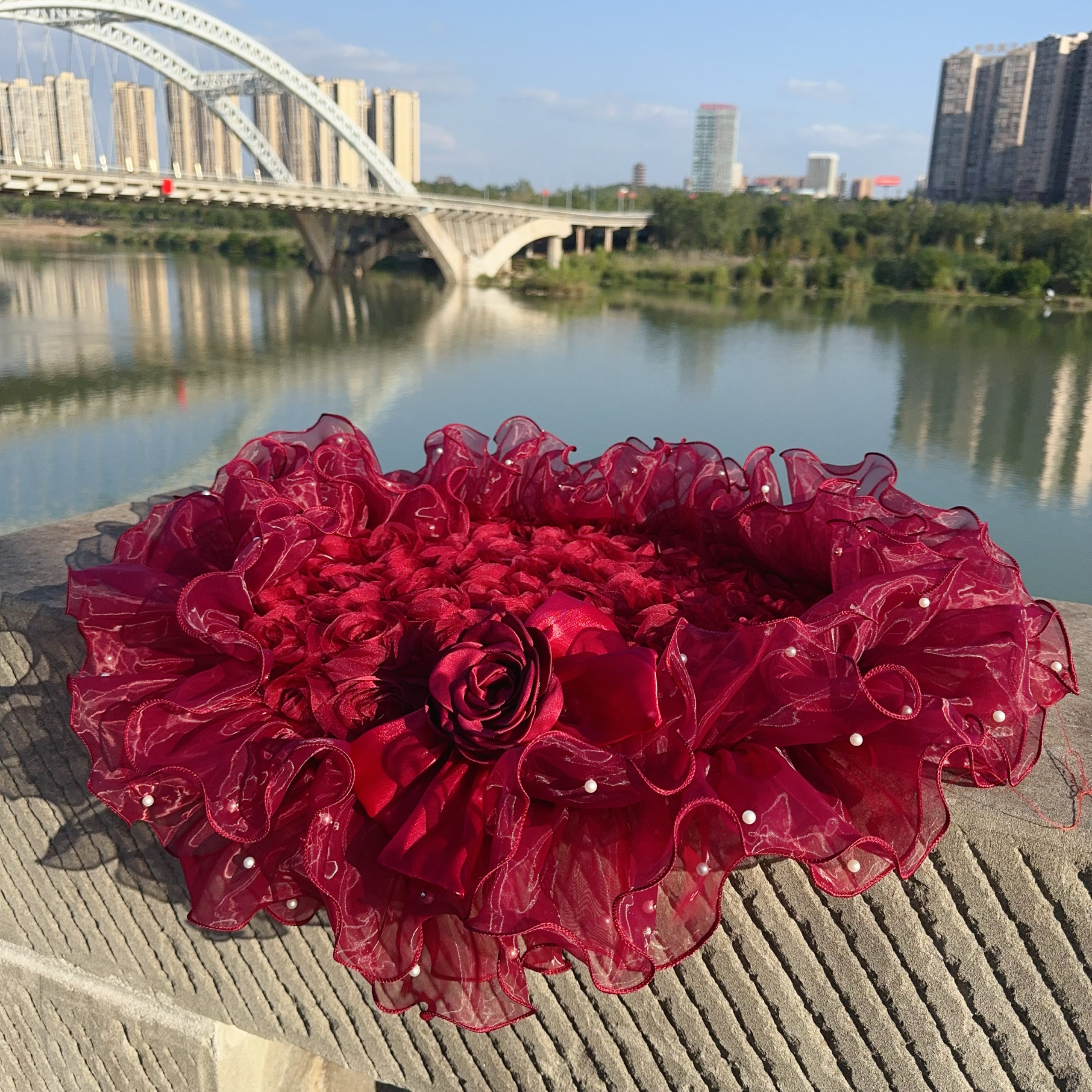 深紅のフリルにはパールがあしらわれ、光を受けて優しくきらめくデザイン。