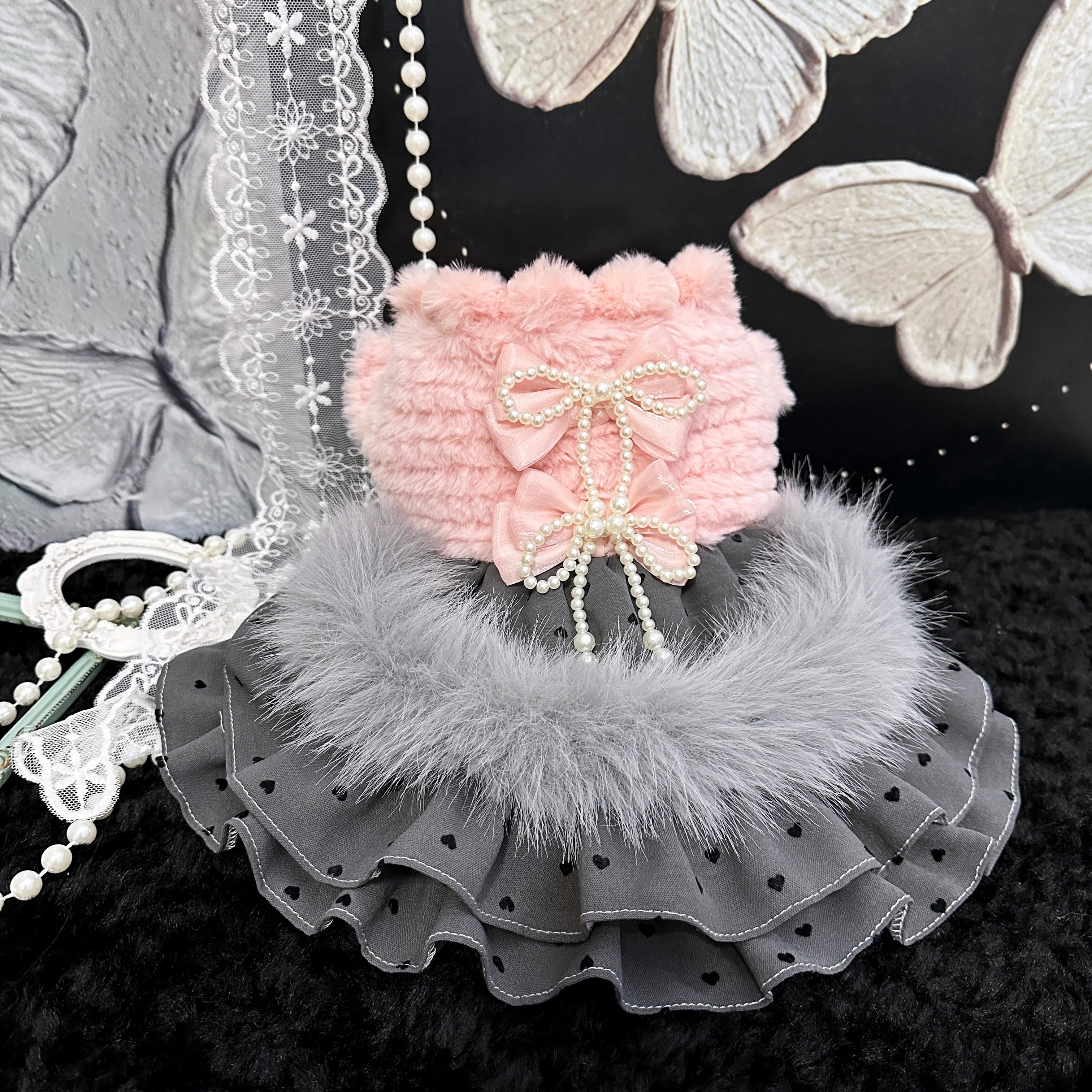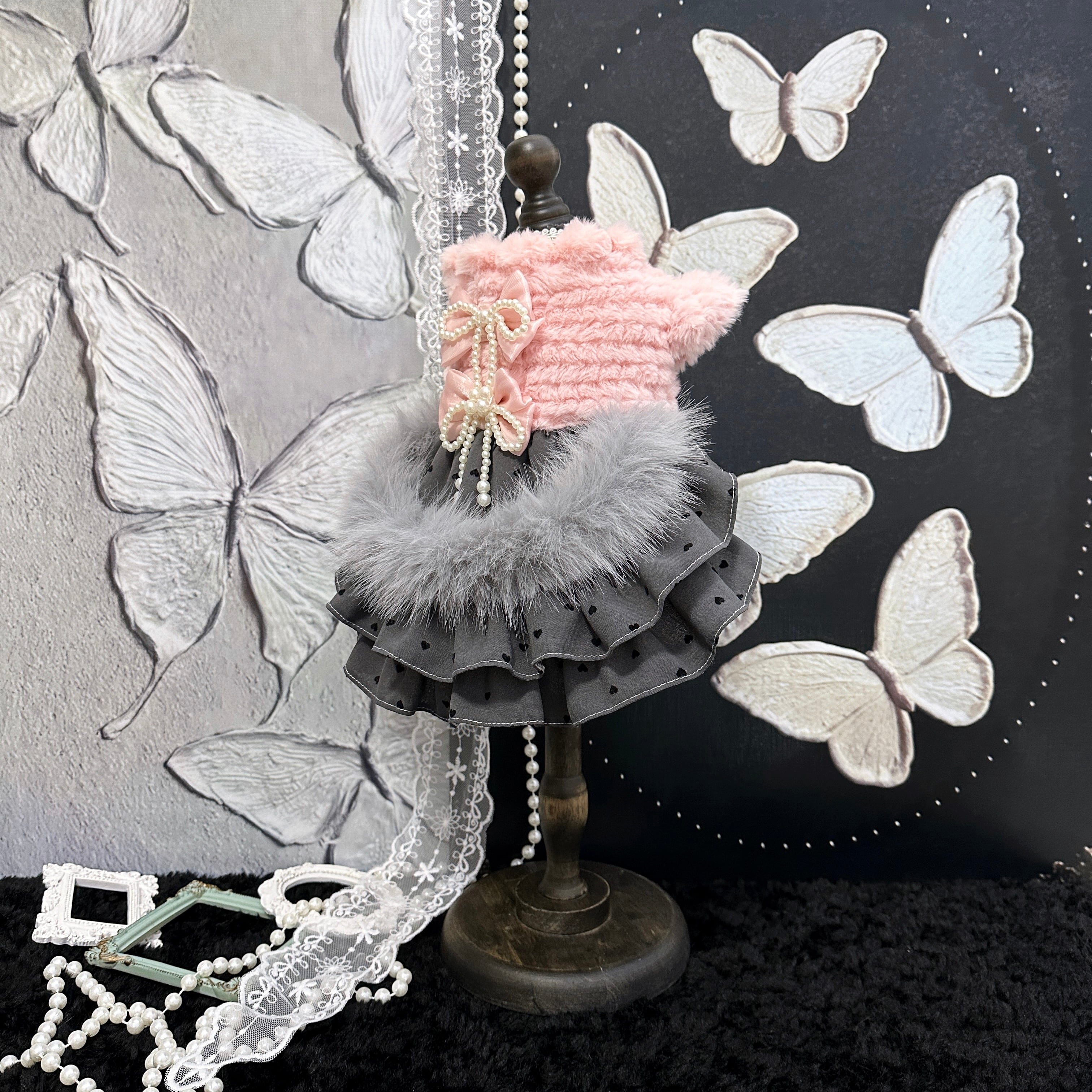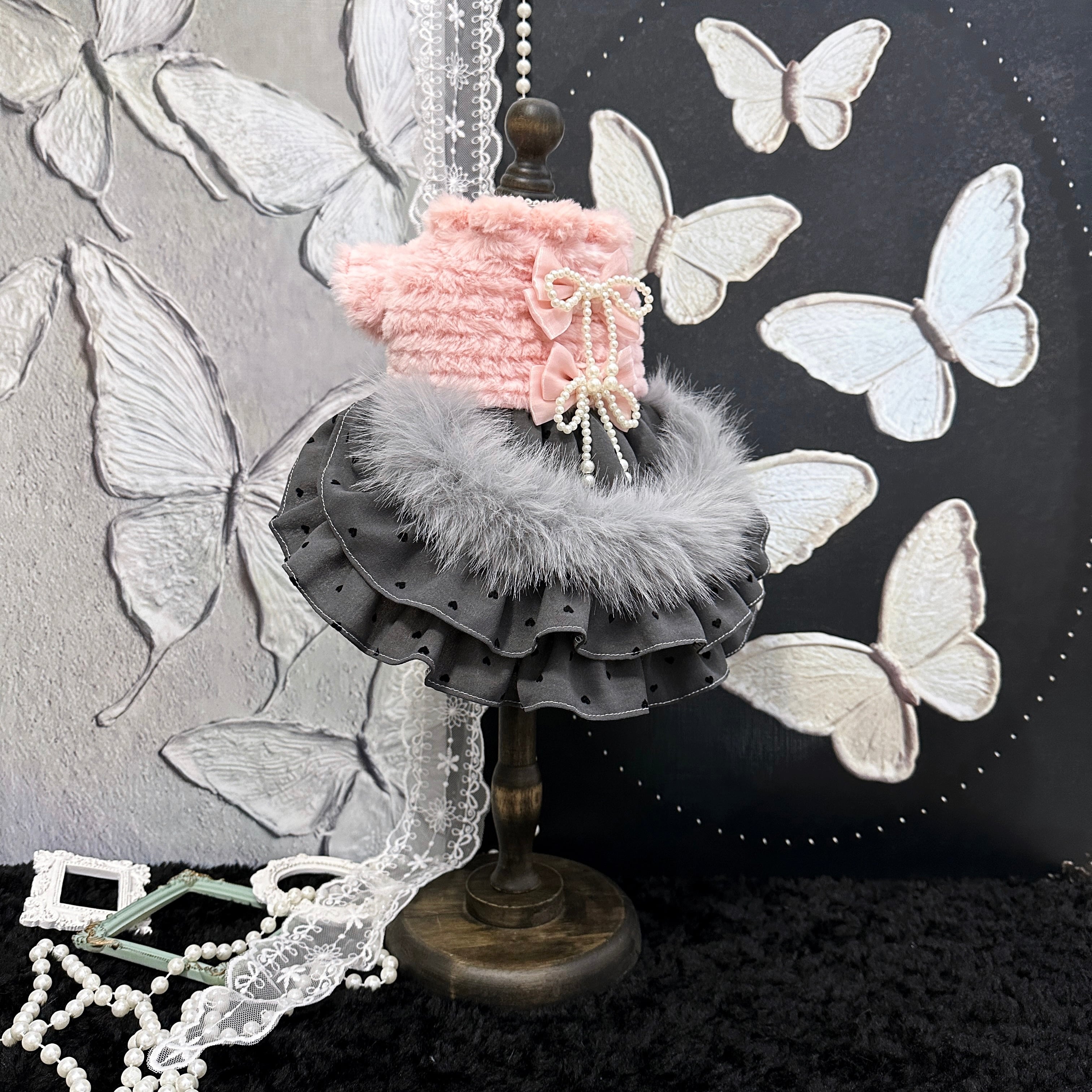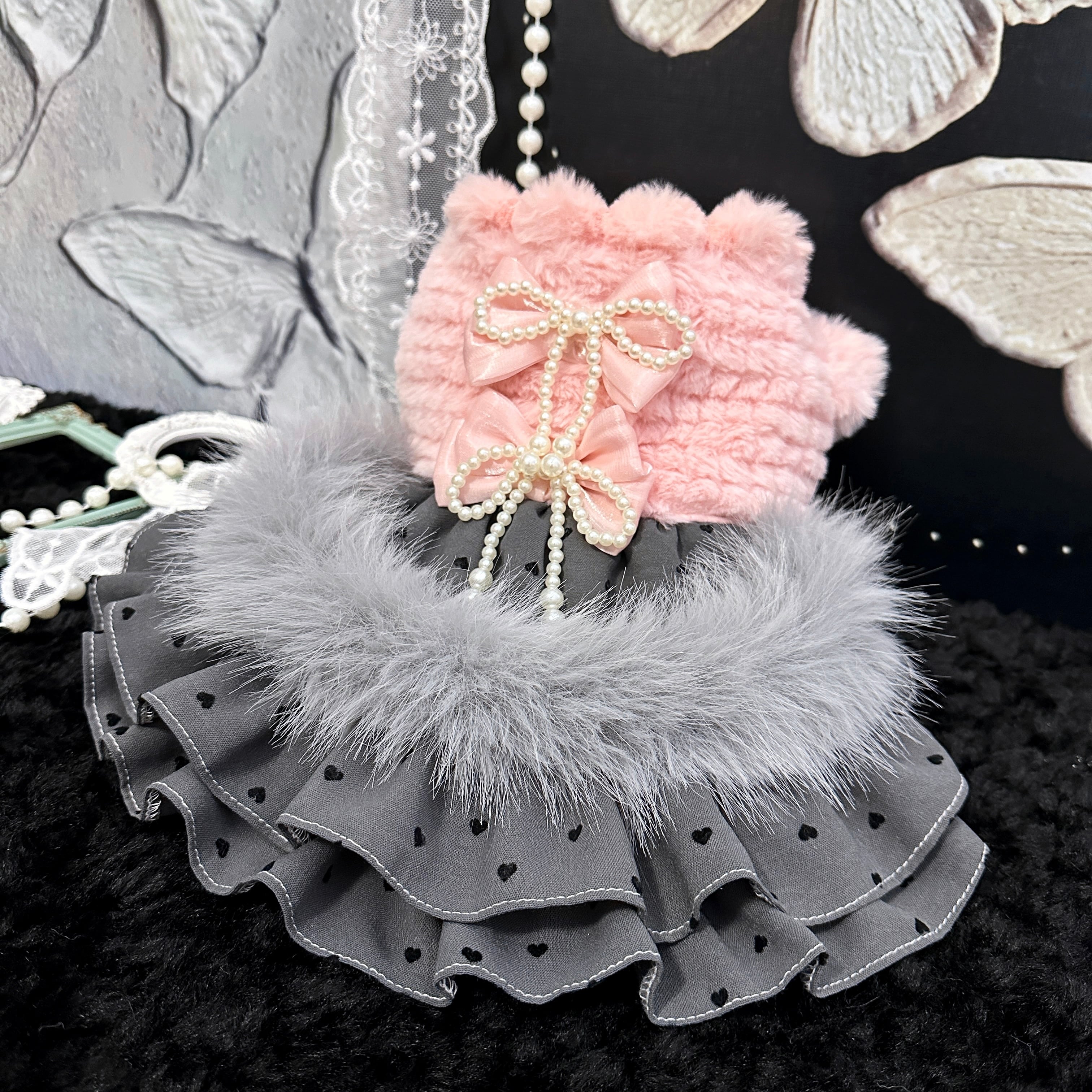 ふんわりピンクのボアトップスに、シックなグレードットスカートを合わせたロマンティックなドレスです。