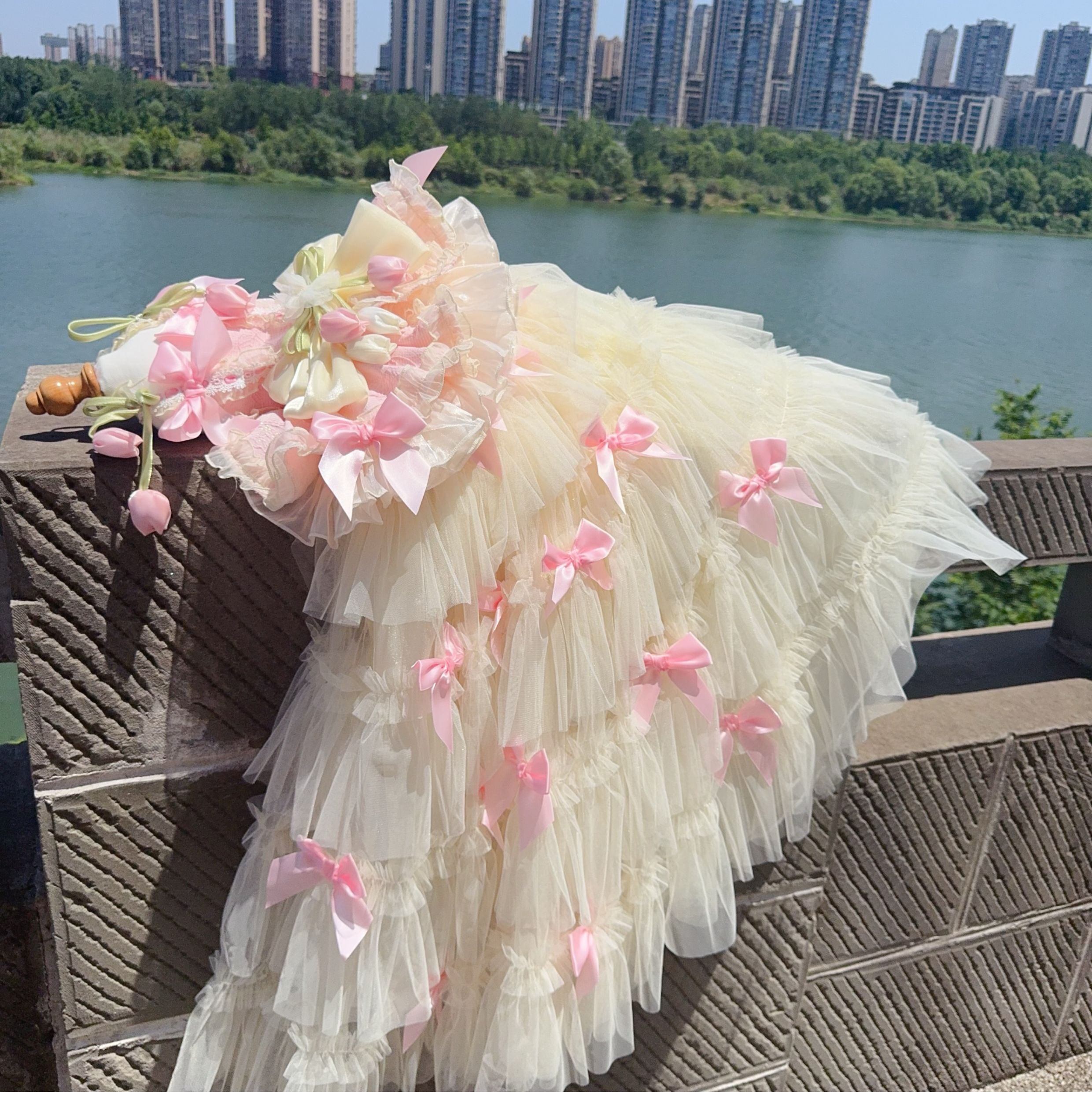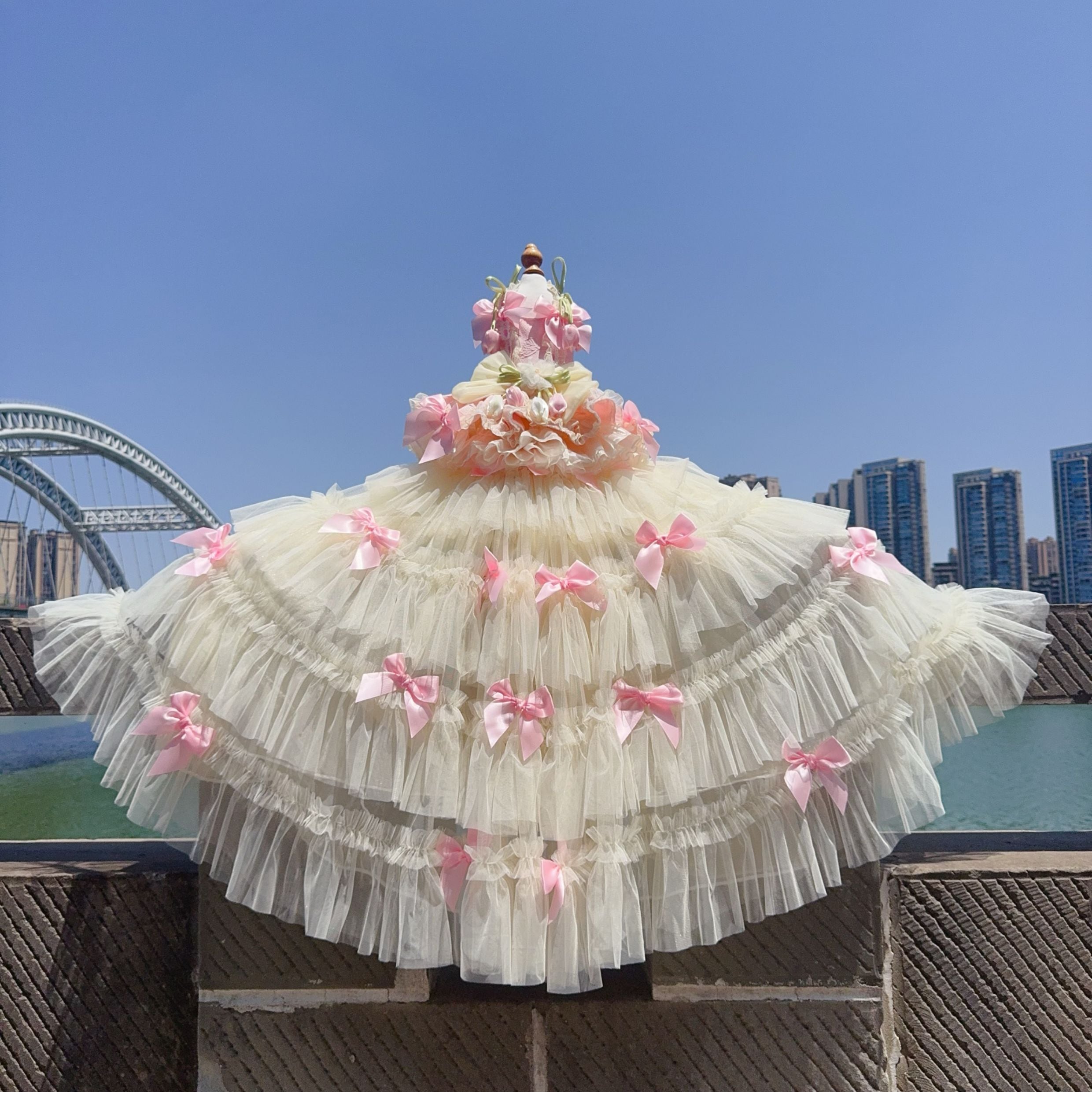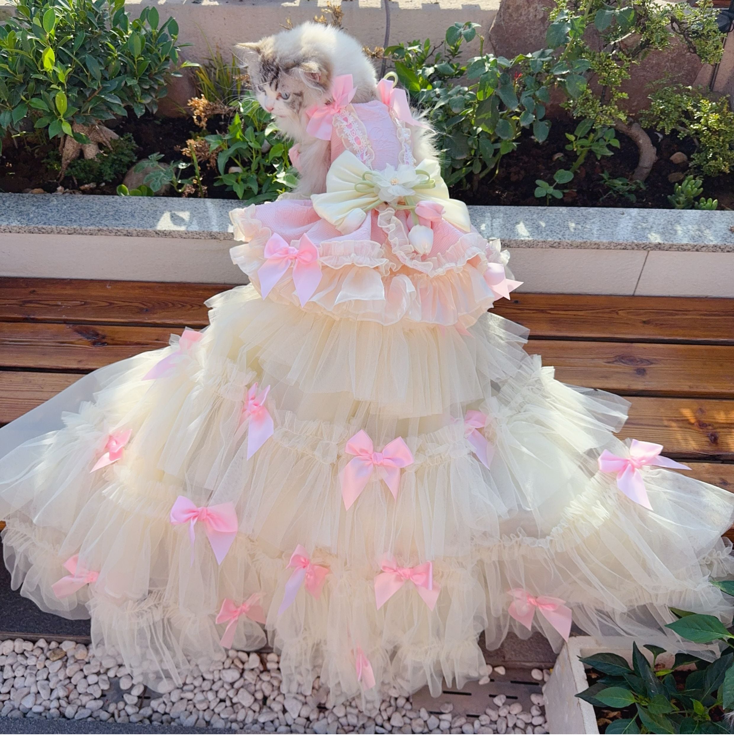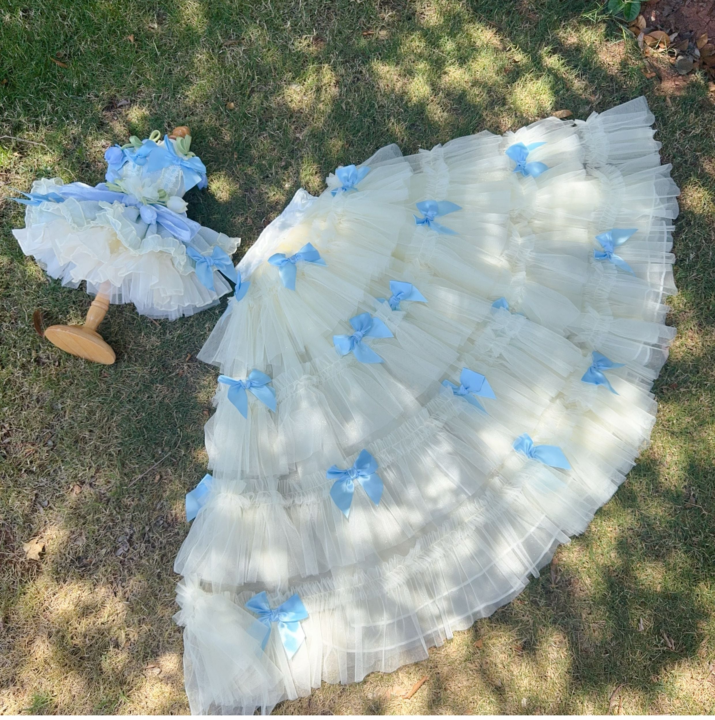 たっぷり重ねたチュールとサテンリボンが優雅に流れ、動くたびに光を受けて輝きます。