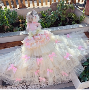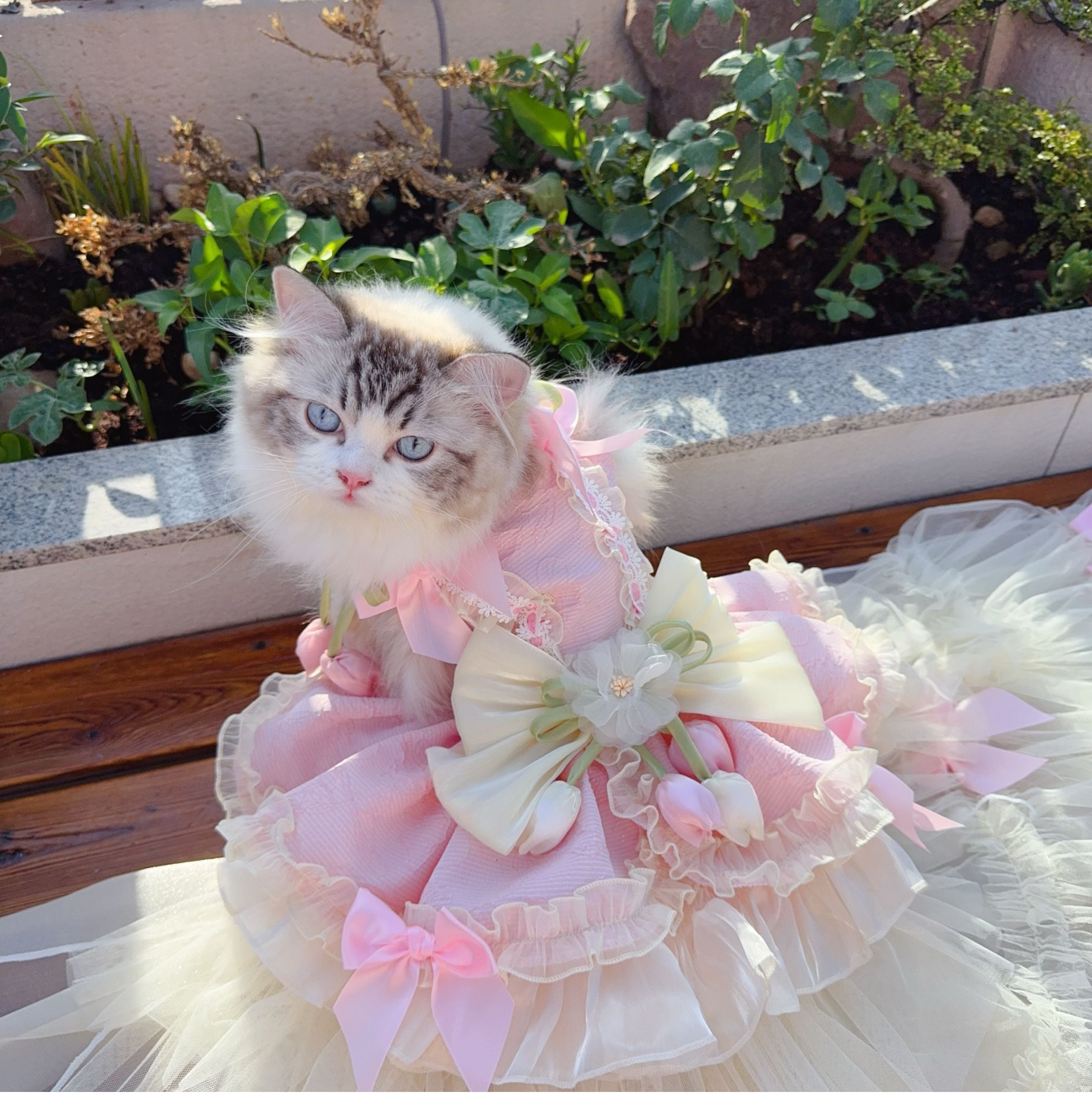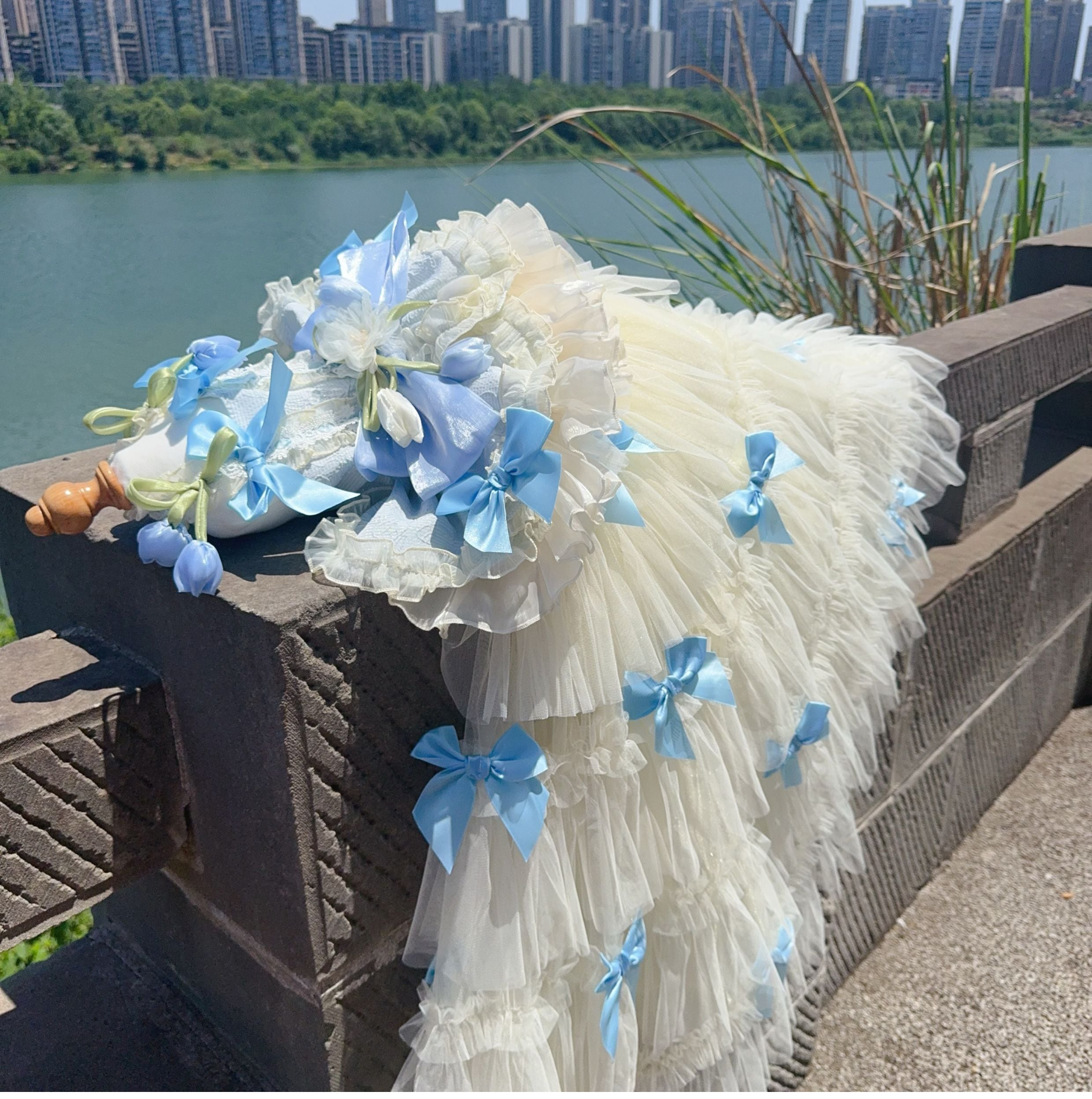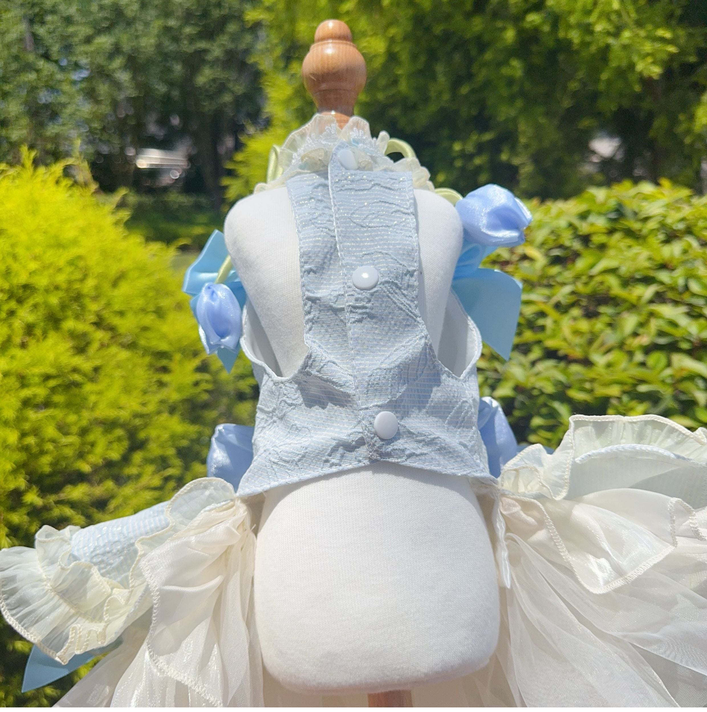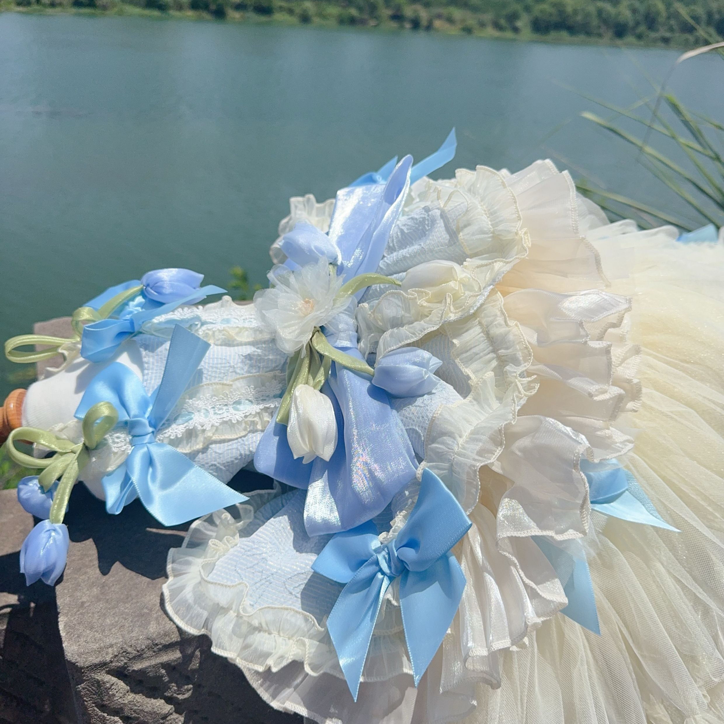 たっぷり重ねたチュールとサテンリボンが優雅に流れ、動くたびに光を受けて輝きます。
