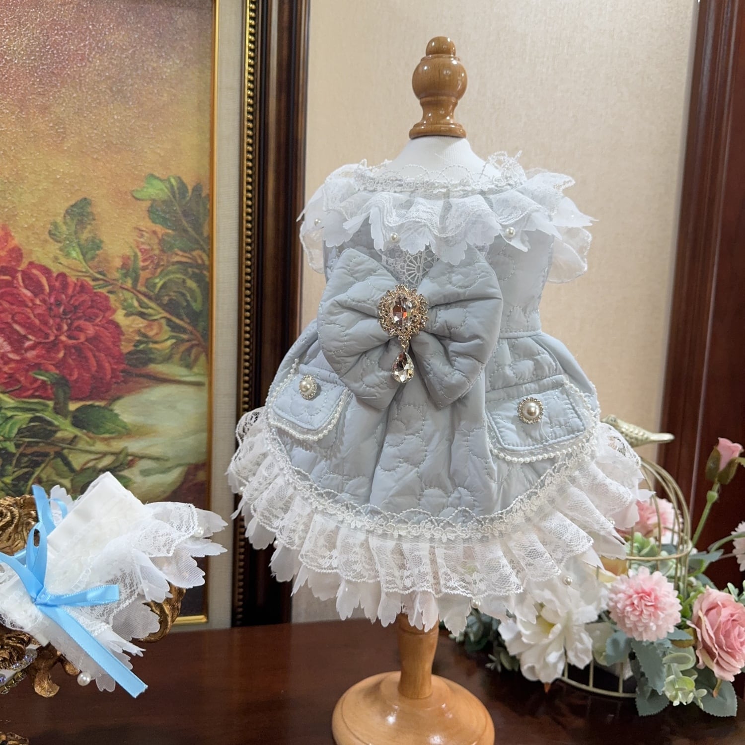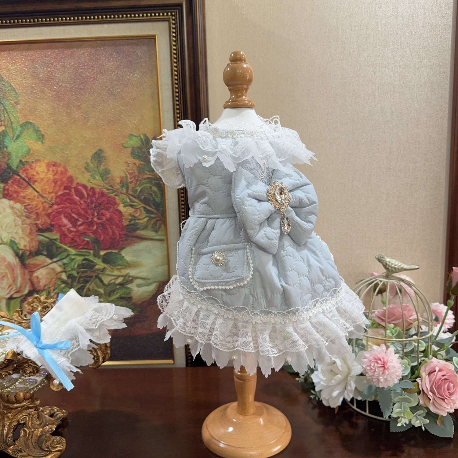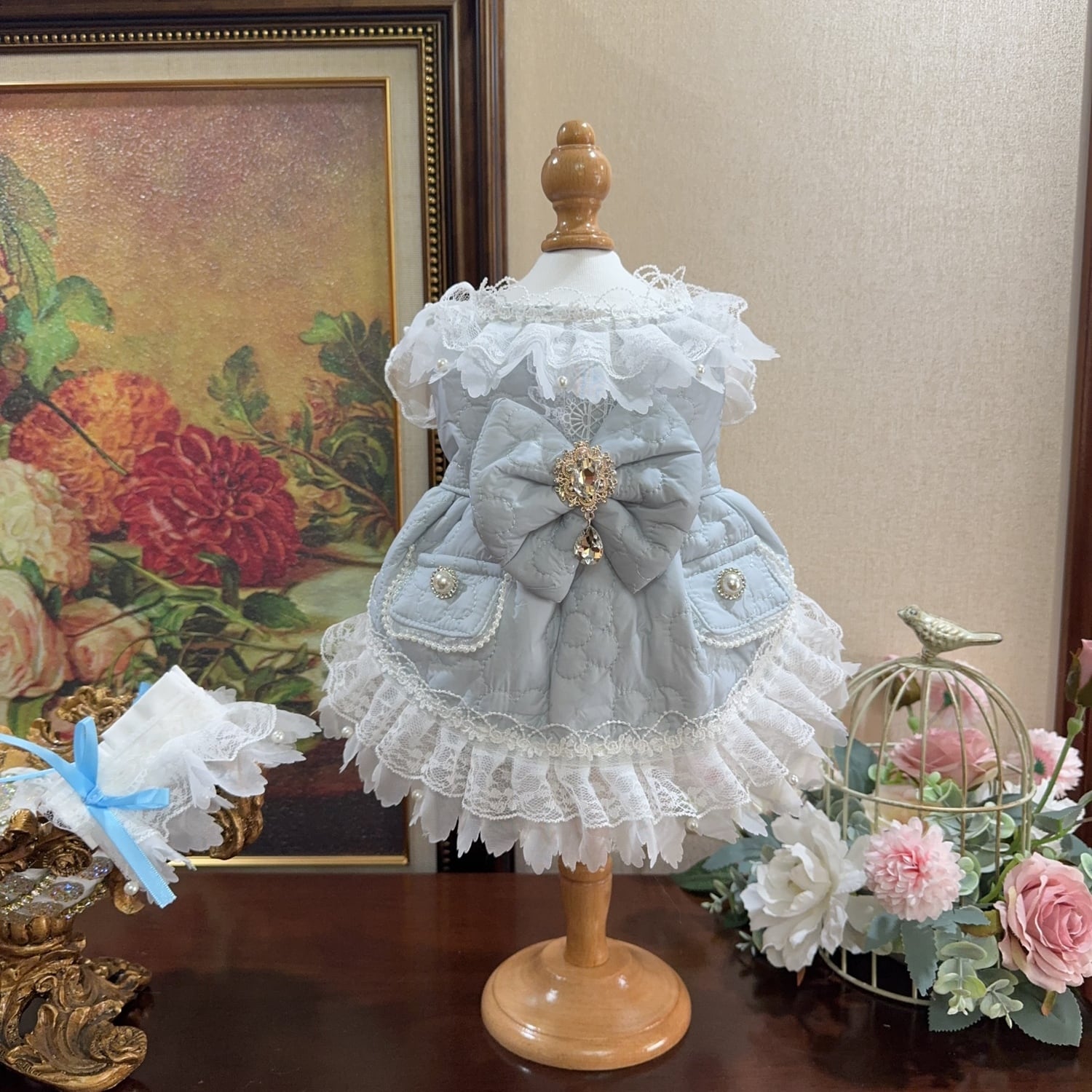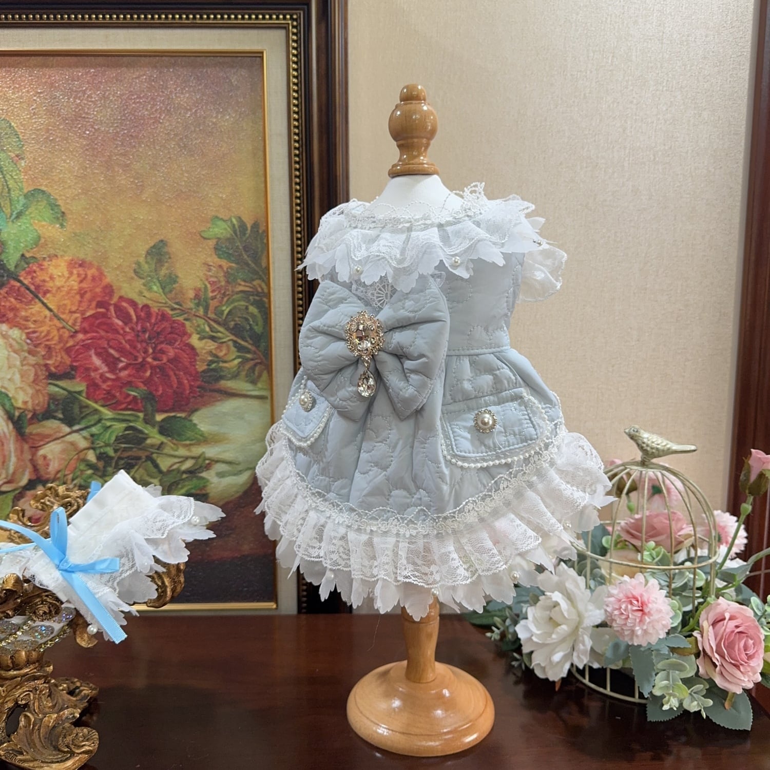 胸元にはきらめくビジューが飾られ、上品でクラシカルな雰囲気を演出します。