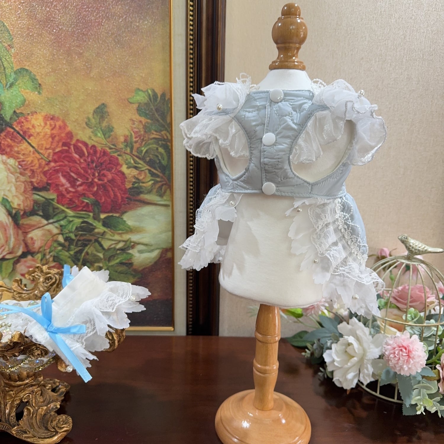 裾にたっぷり重ねたレースフリルがふんわりと広がり、まるで絵本から飛び出したような一着です。