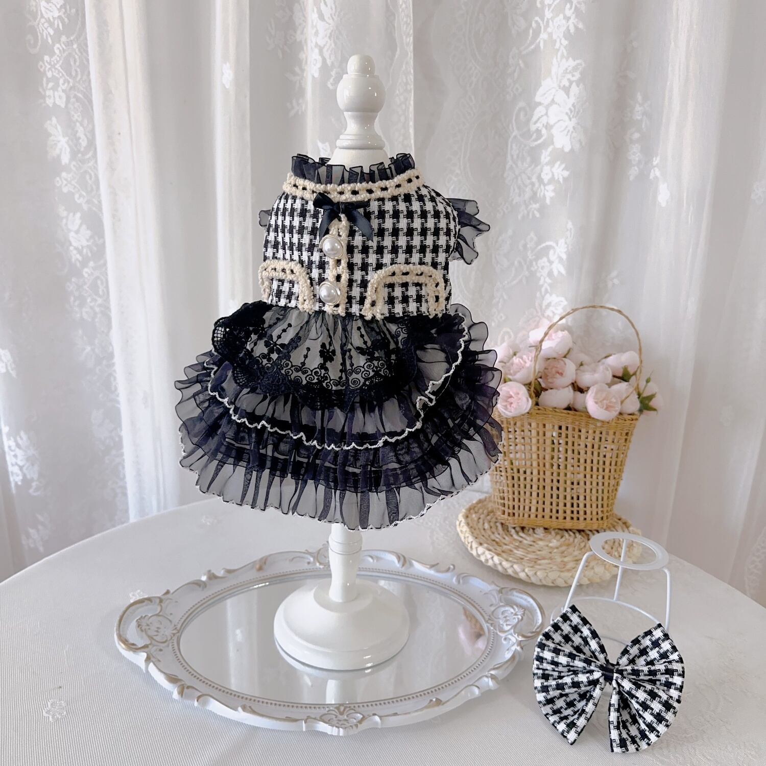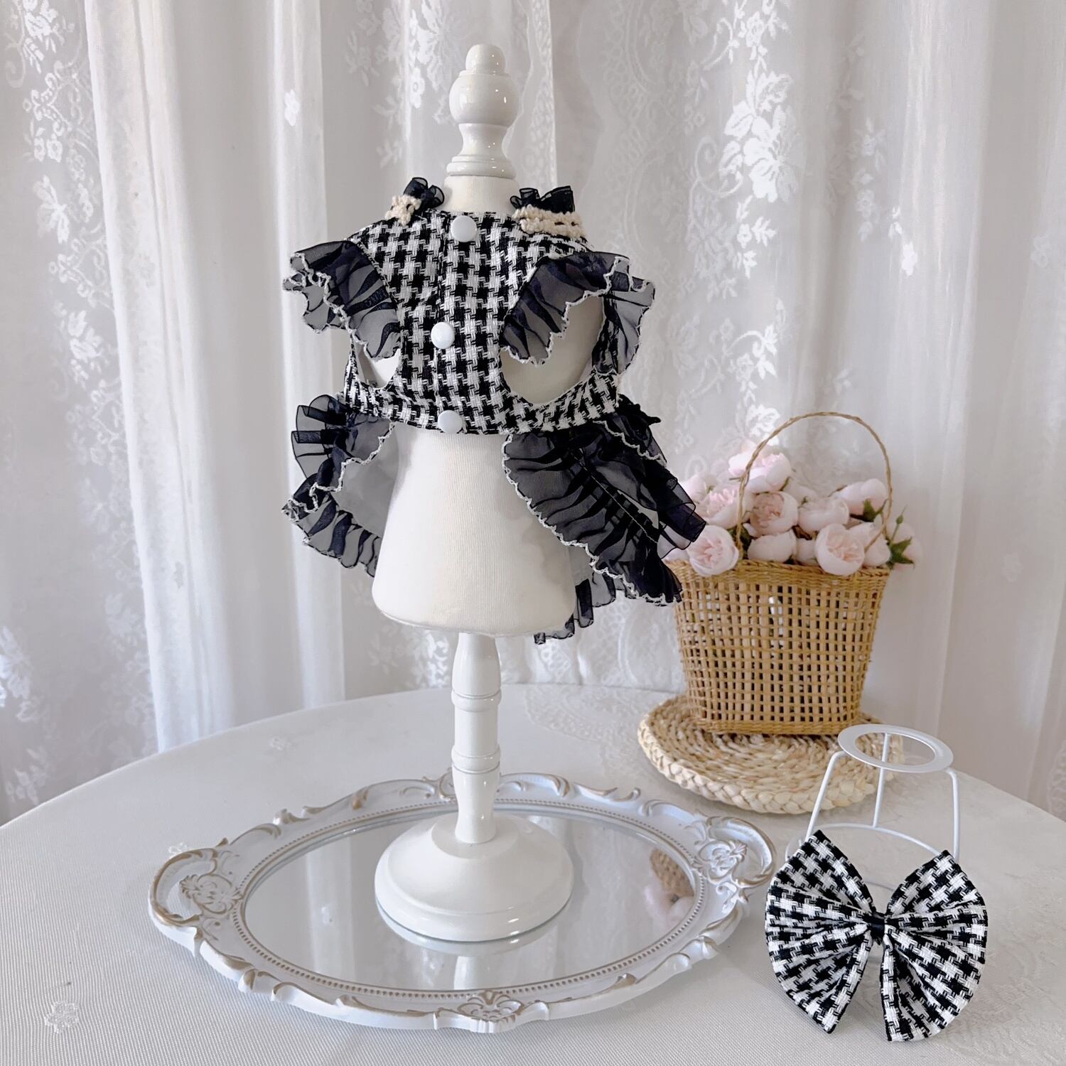 クラシカルな千鳥格子柄に、たっぷりのブラックフリルを重ねた上品なドレス。