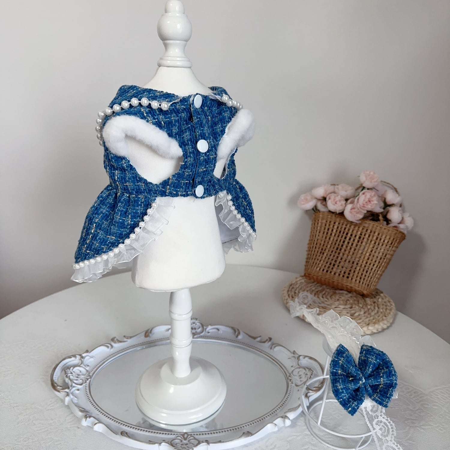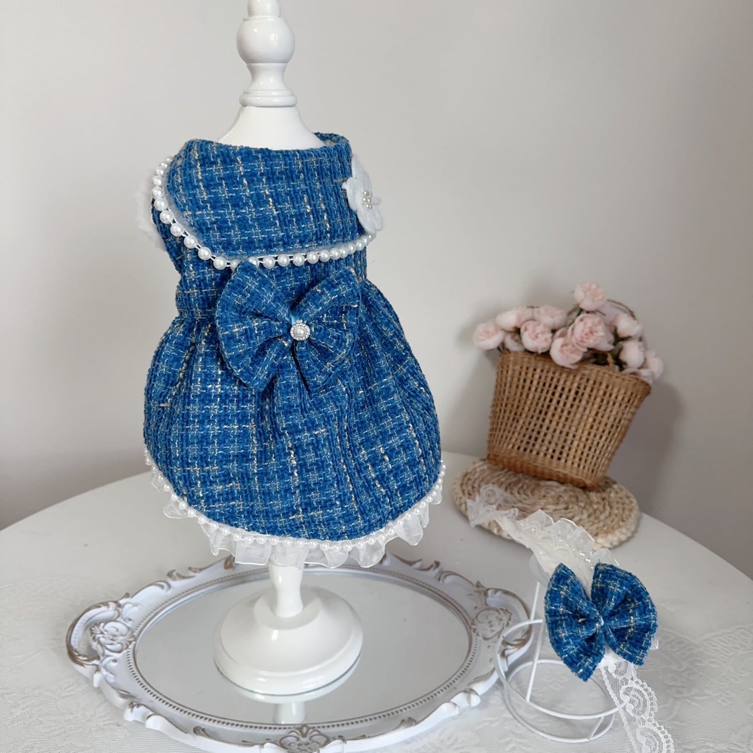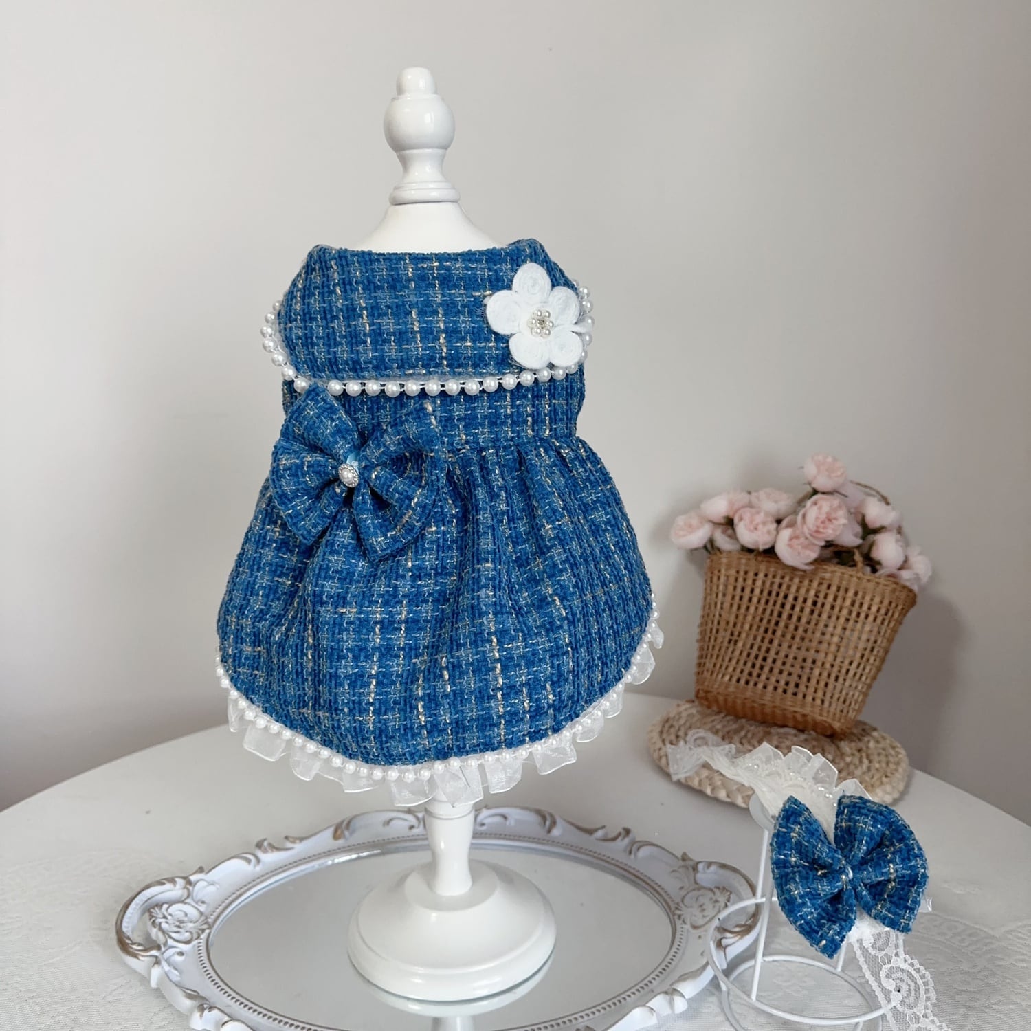 パールの飾りとお花のモチーフがアクセントになり、華やかさを引き立てます。