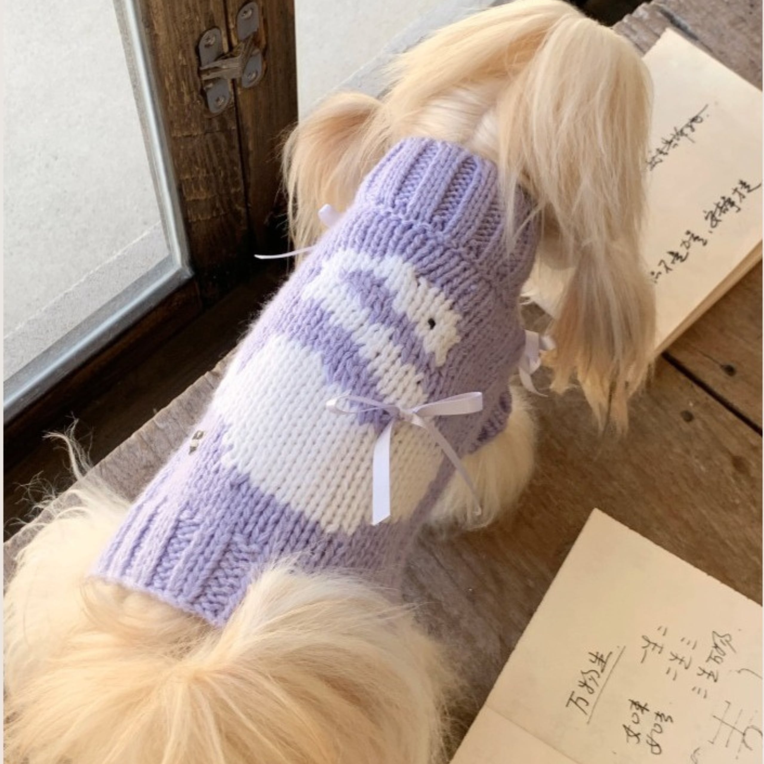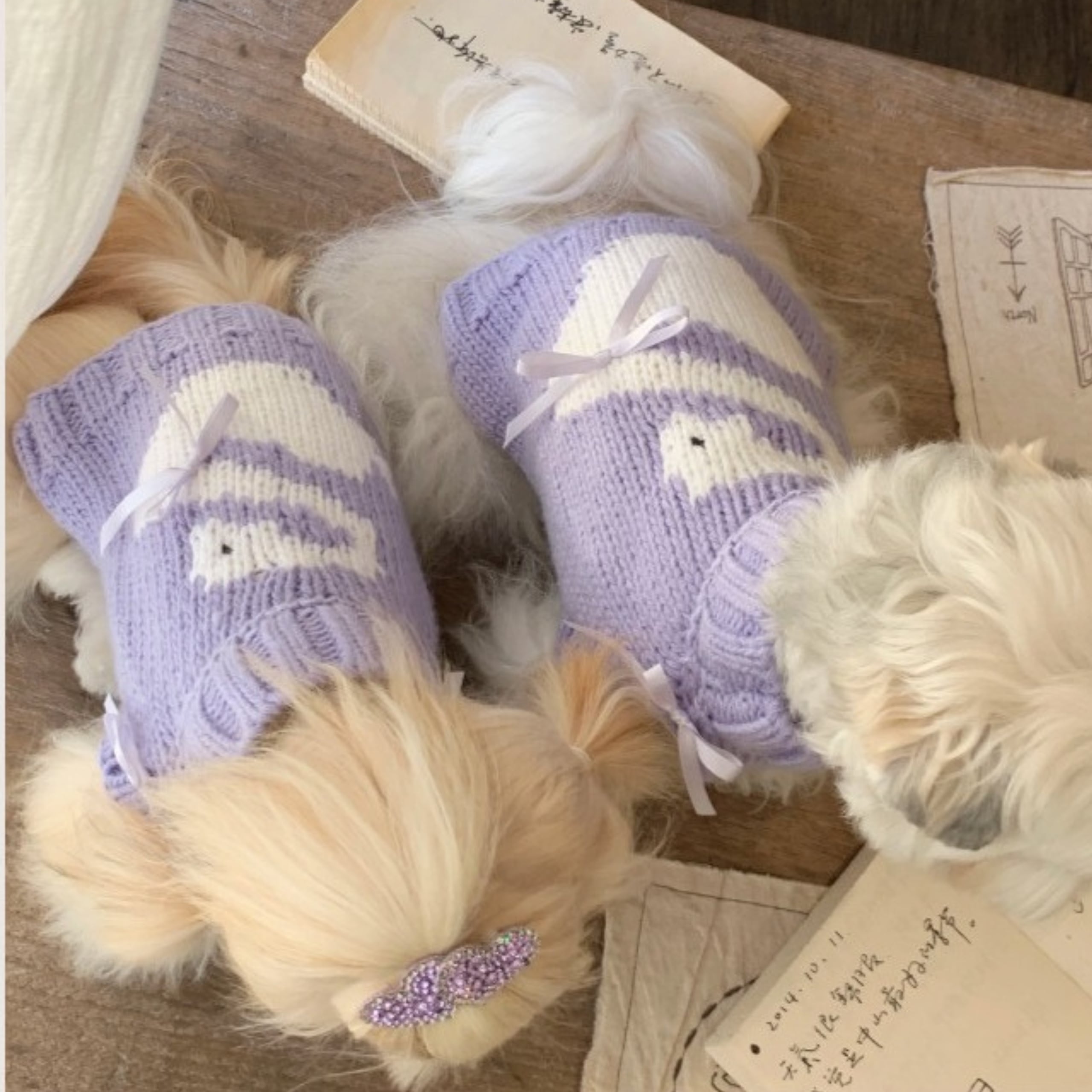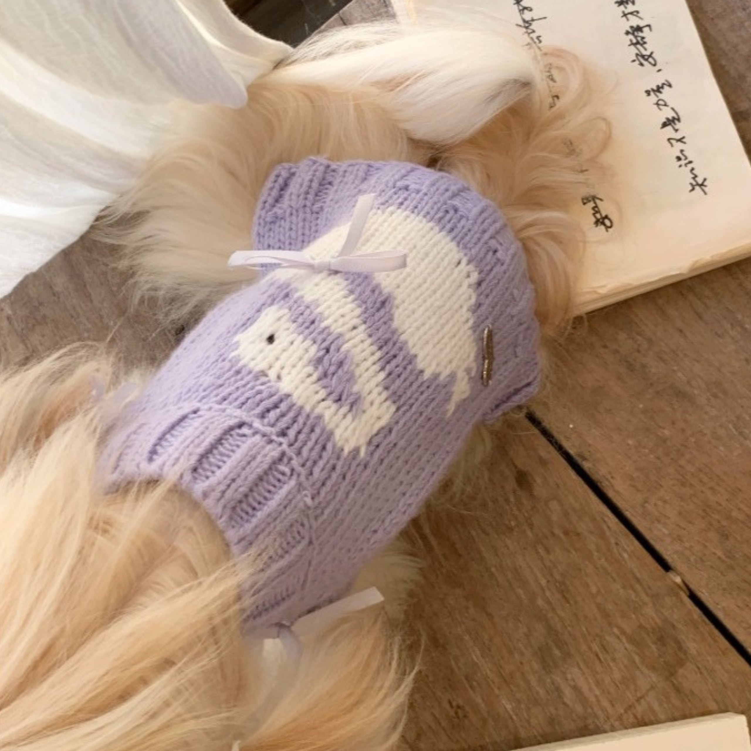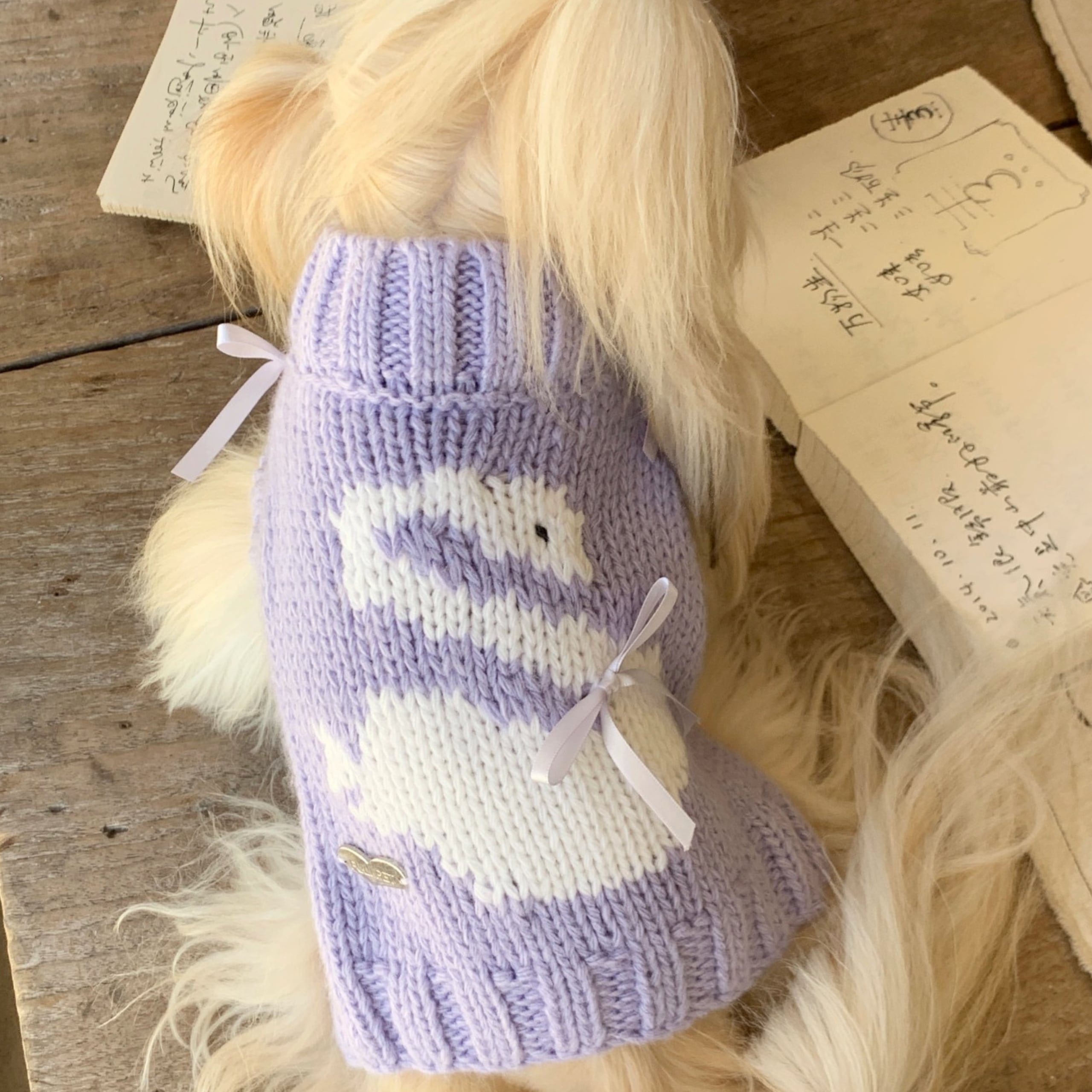 優しいラベンダーカラーに、白鳥のジャカード編みが映えるガーリーニット。