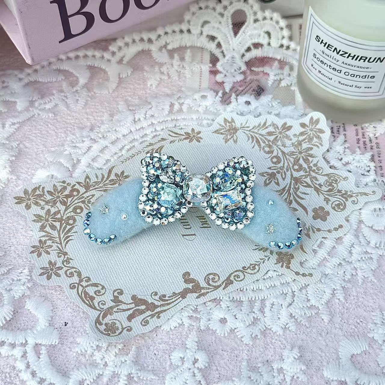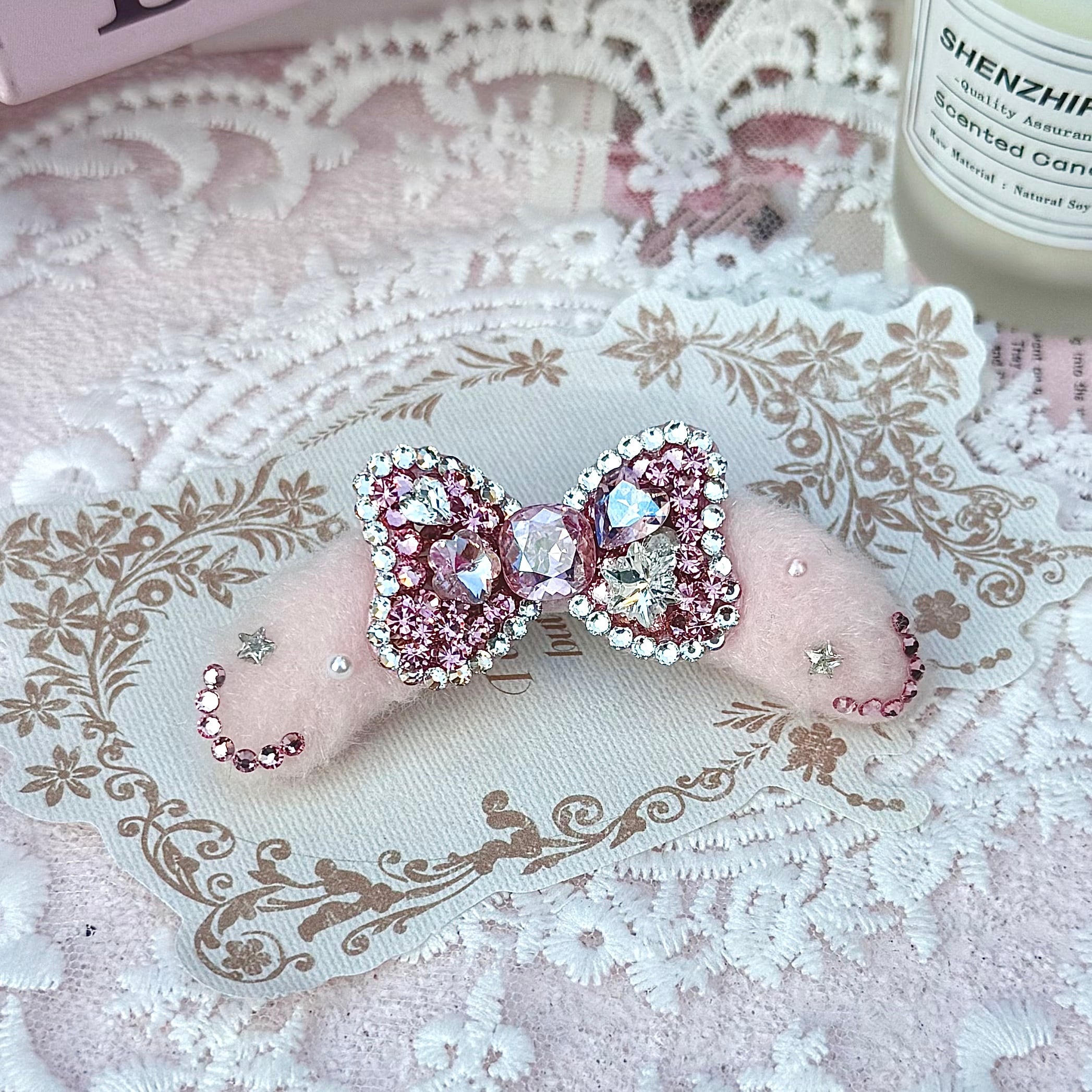 淡いピンク・ブルーのフェルト部分には星のモチーフやラインストーンが施され、
