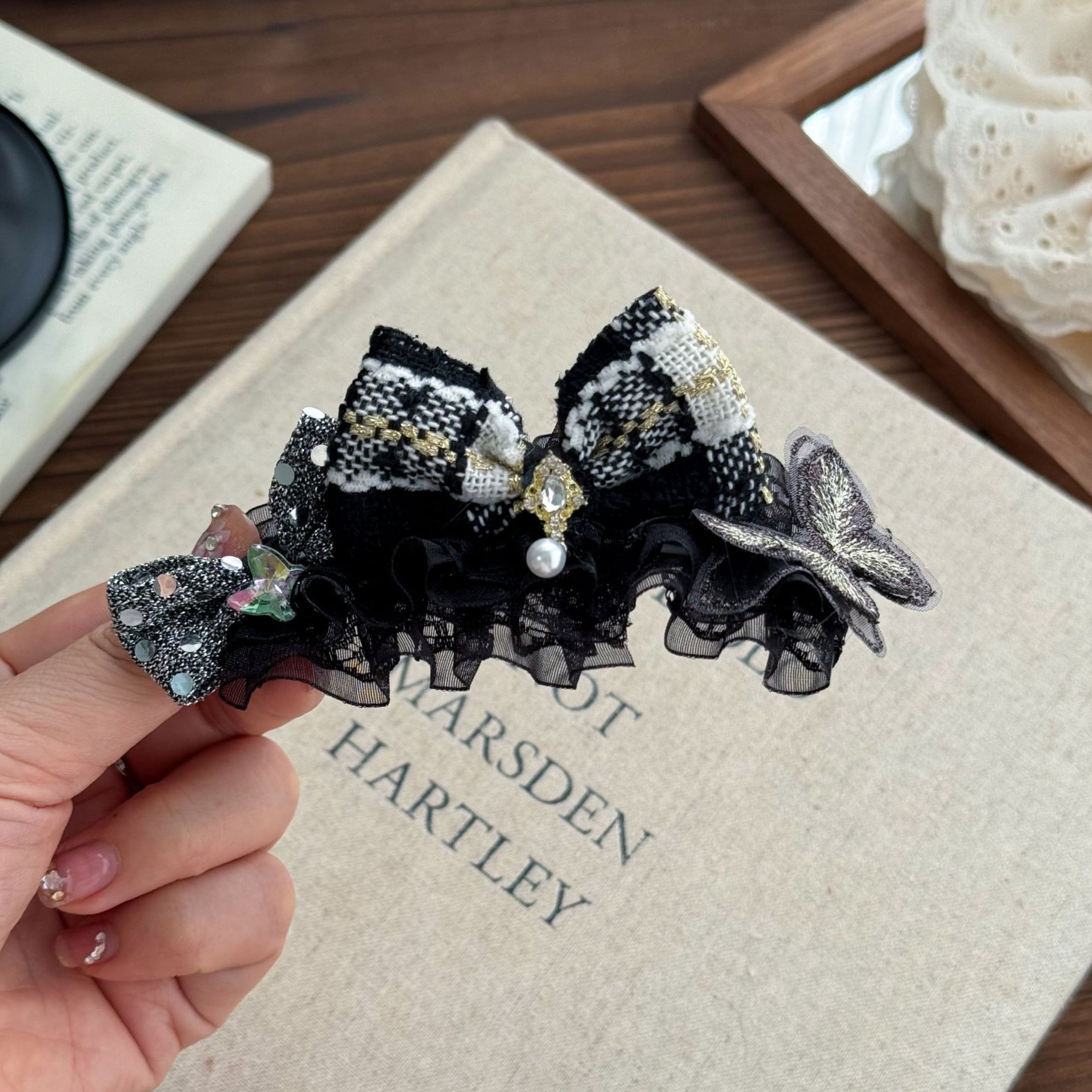 C:パール付きブラックチェックリボン