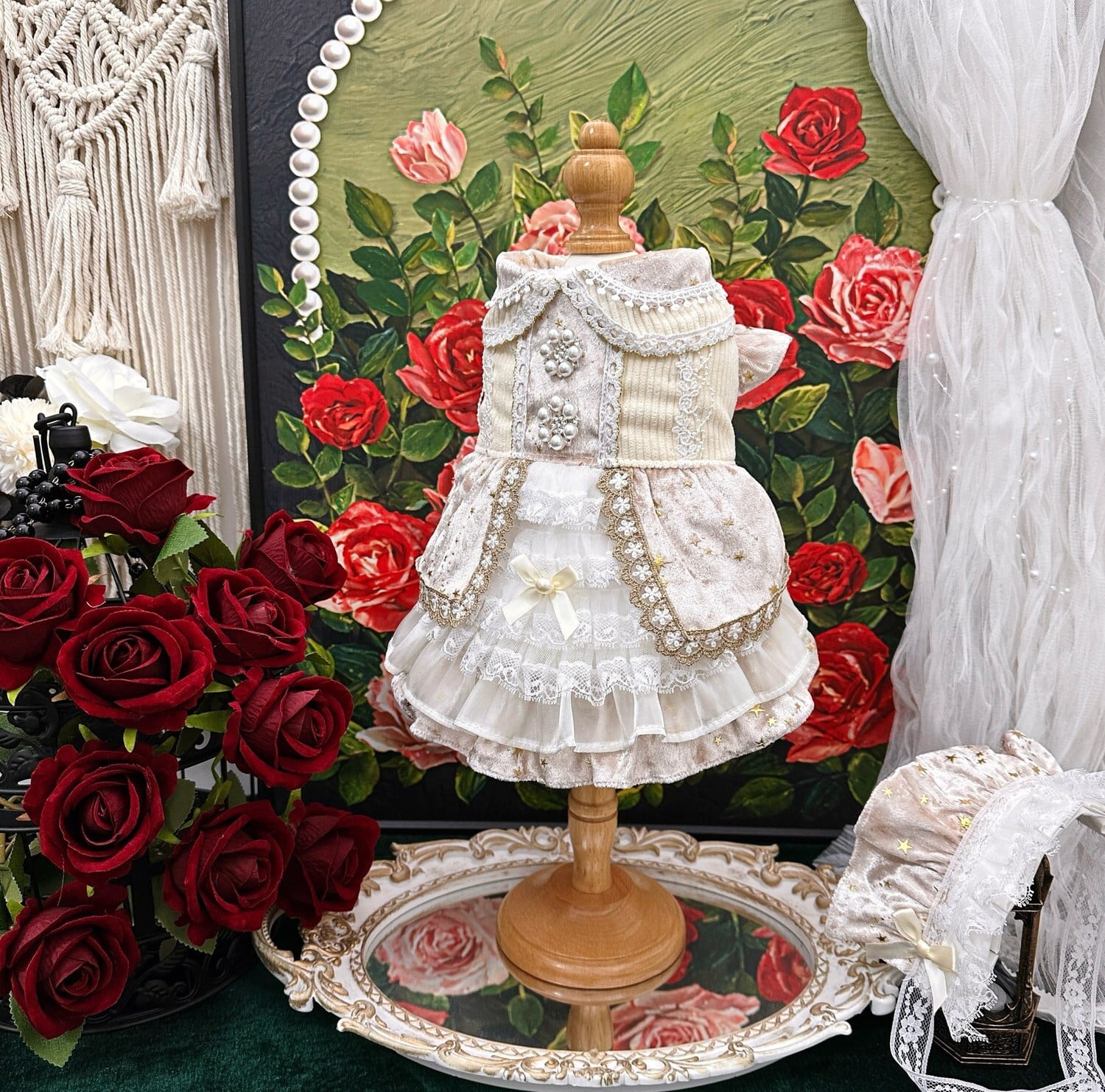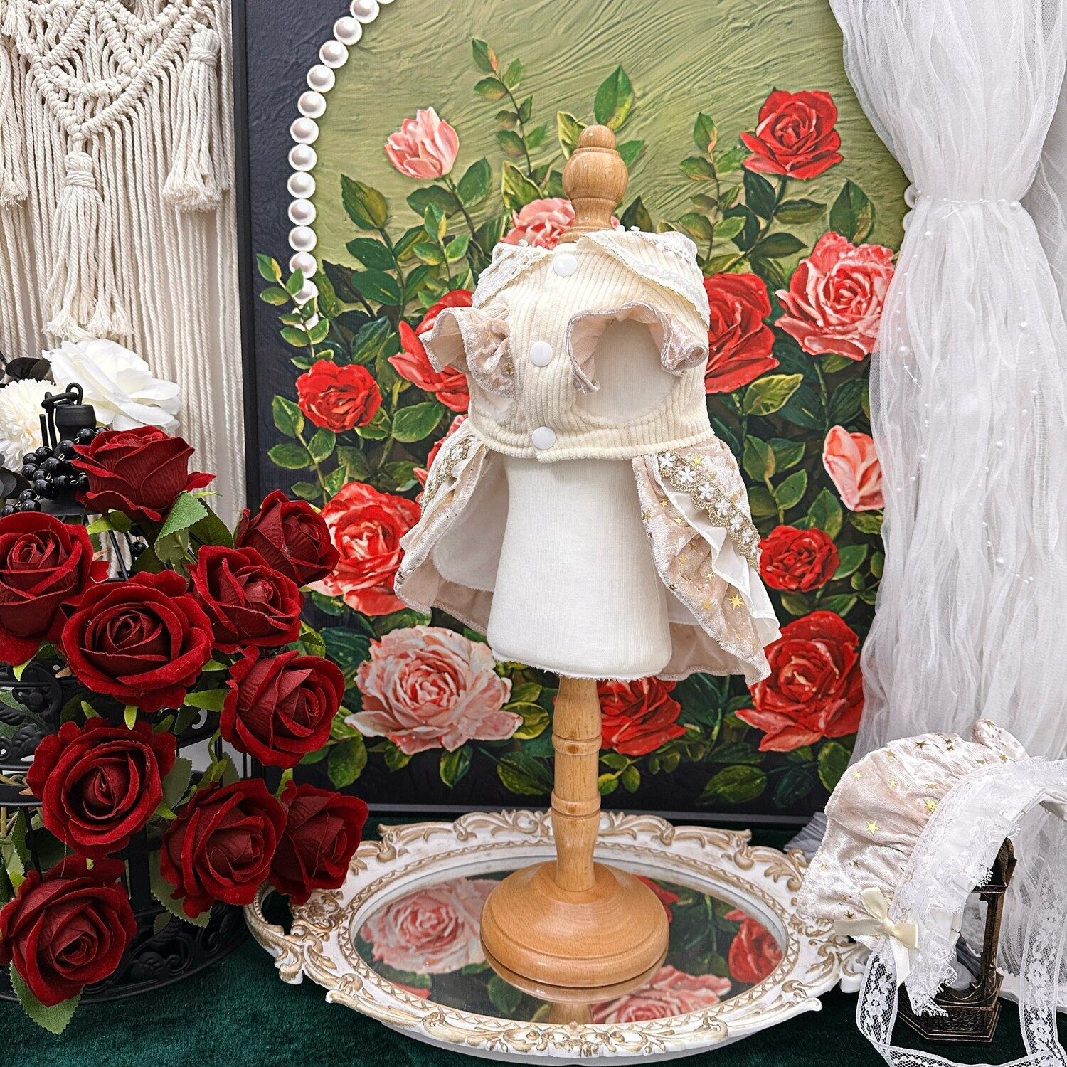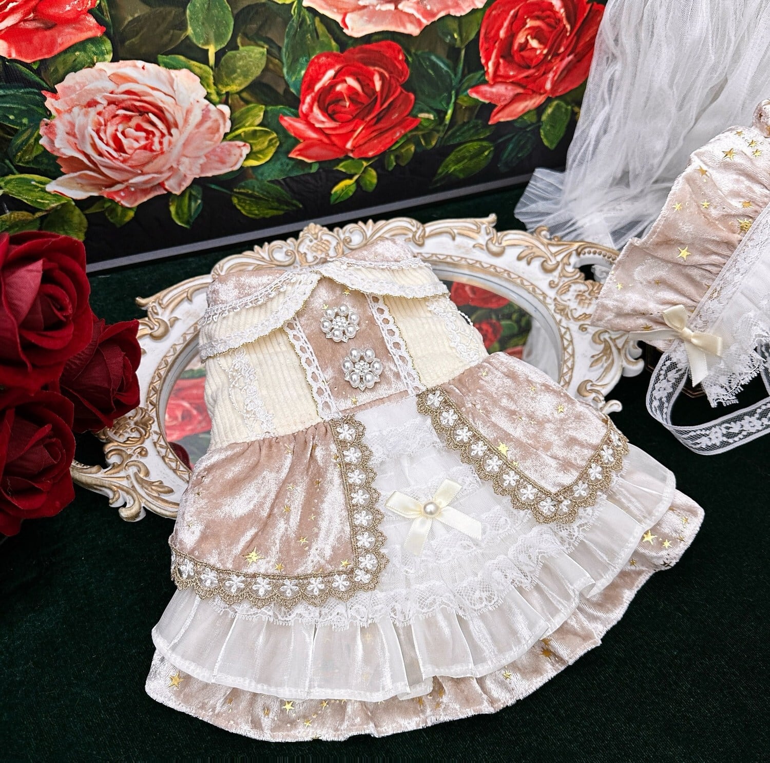 柔らかなベルベット調生地と繊細なレースをたっぷりと使用し、まるで舞踏会の衣装のような気品ある仕上がりです。