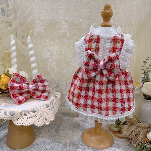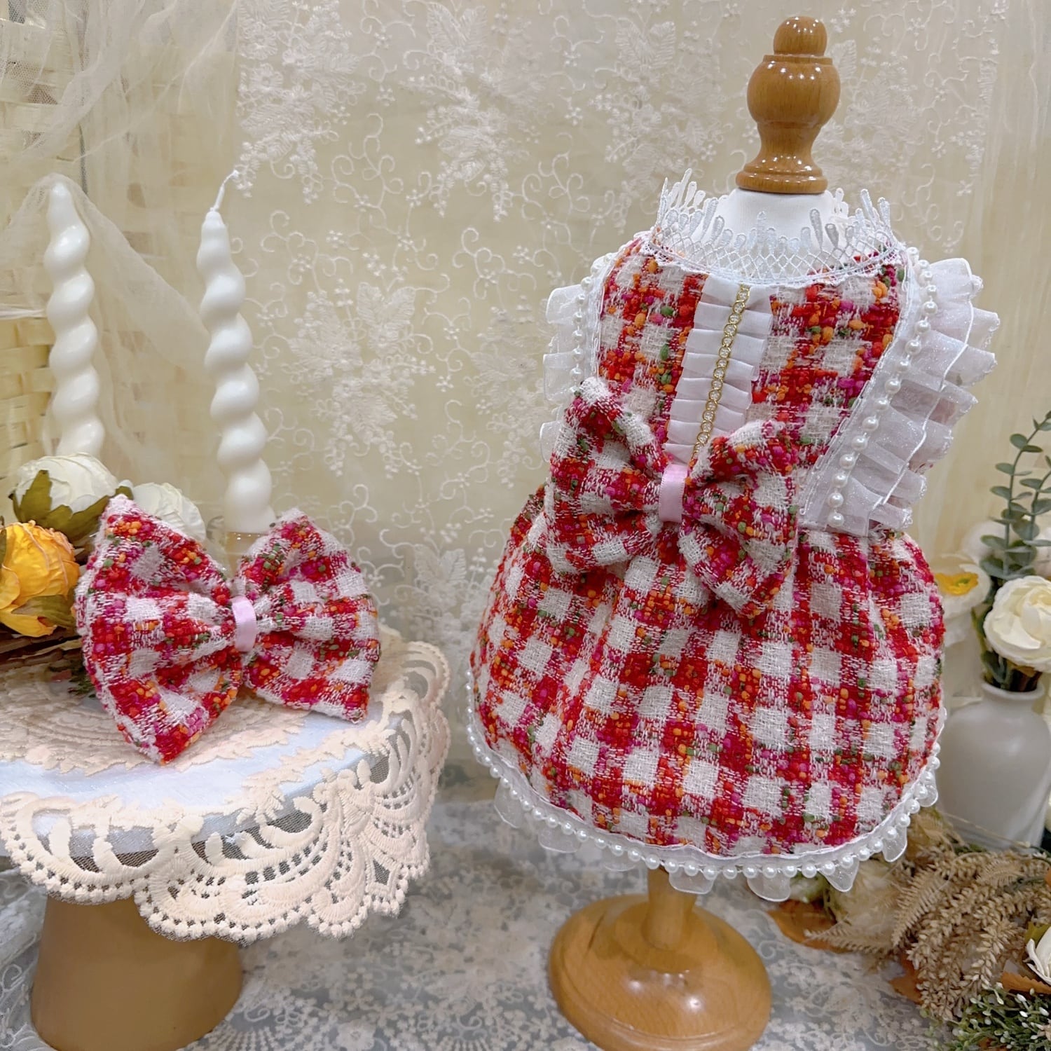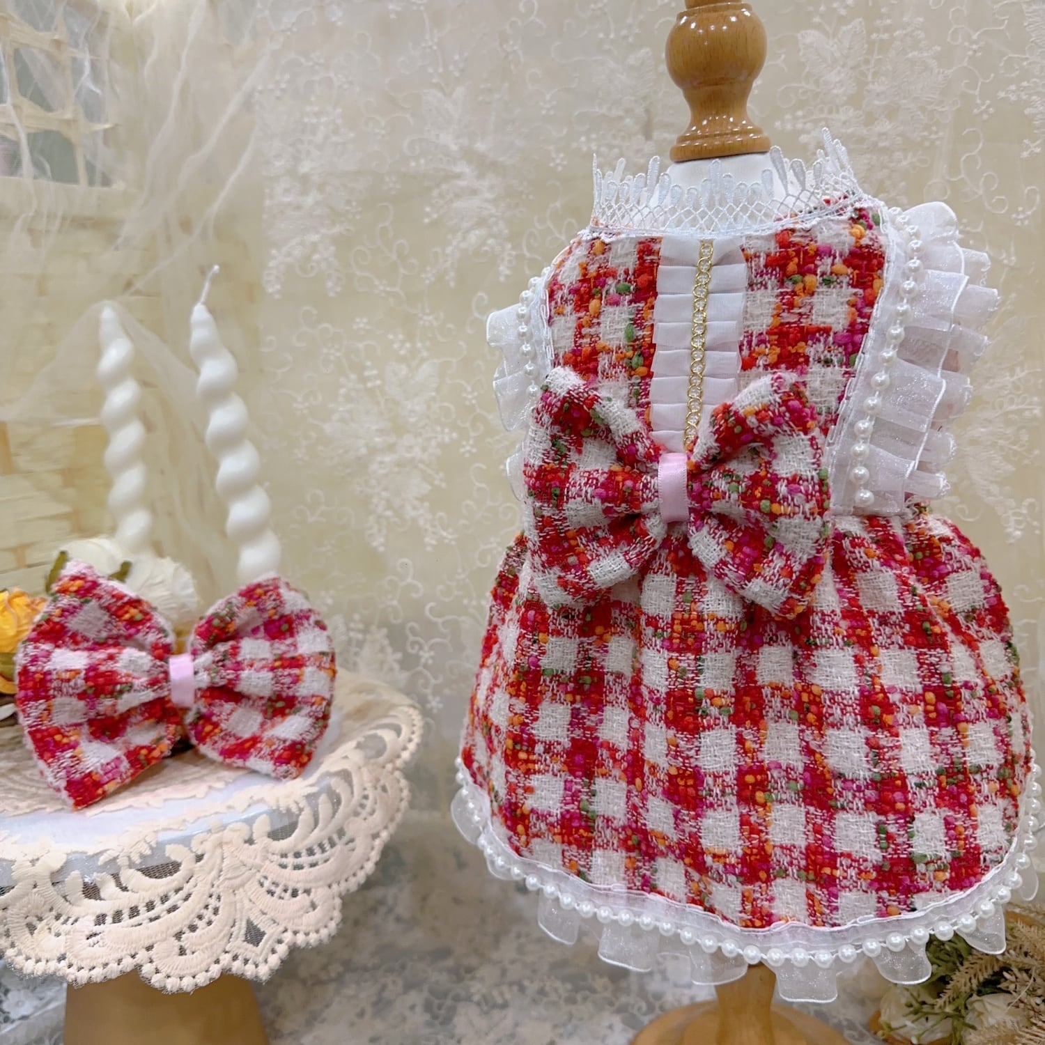ふんわりガーリーな世界観を楽しめる、赤×白のチェックツイードワンピースです。