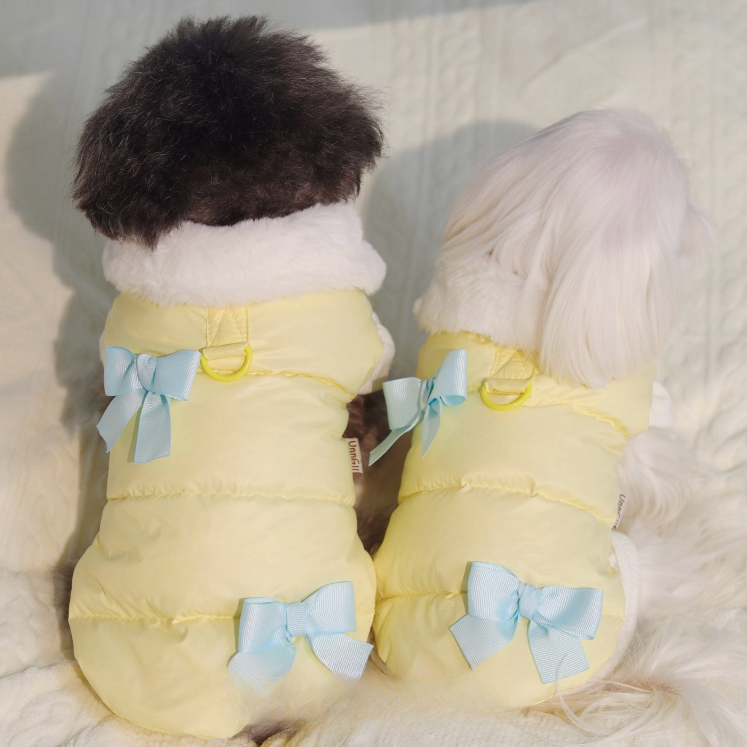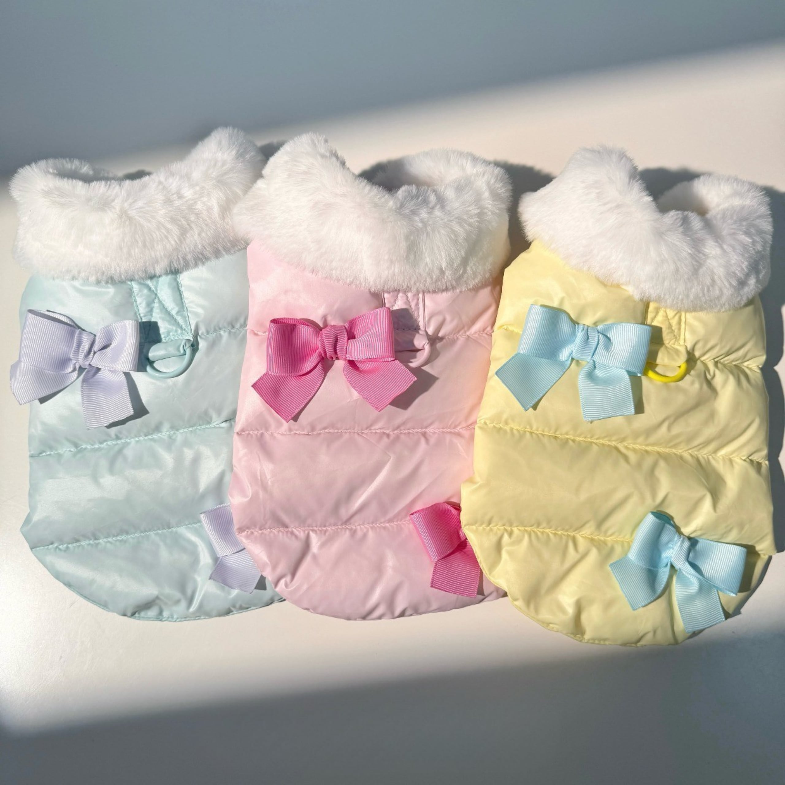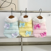 ふんわりやわらかなパステルカラーに、大きめリボンをあしらったガーリーなダウンコートです。