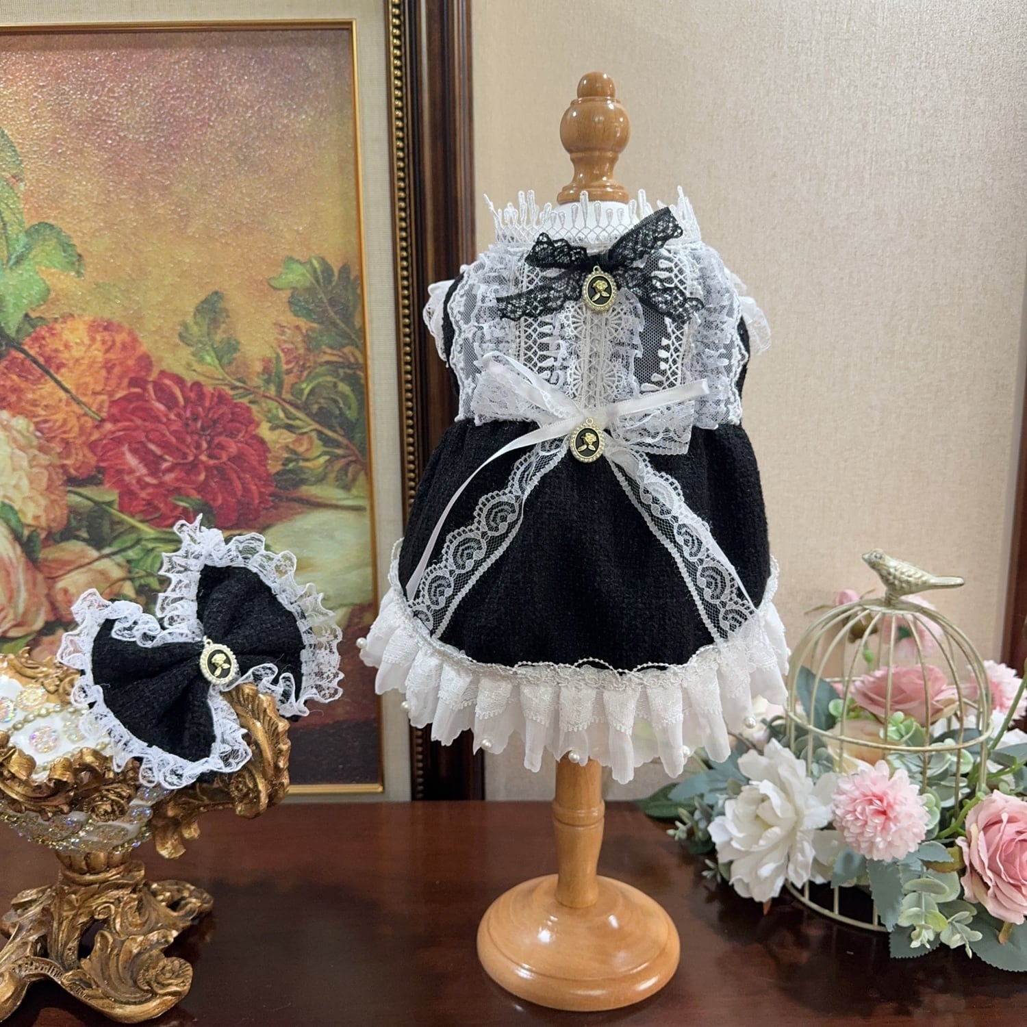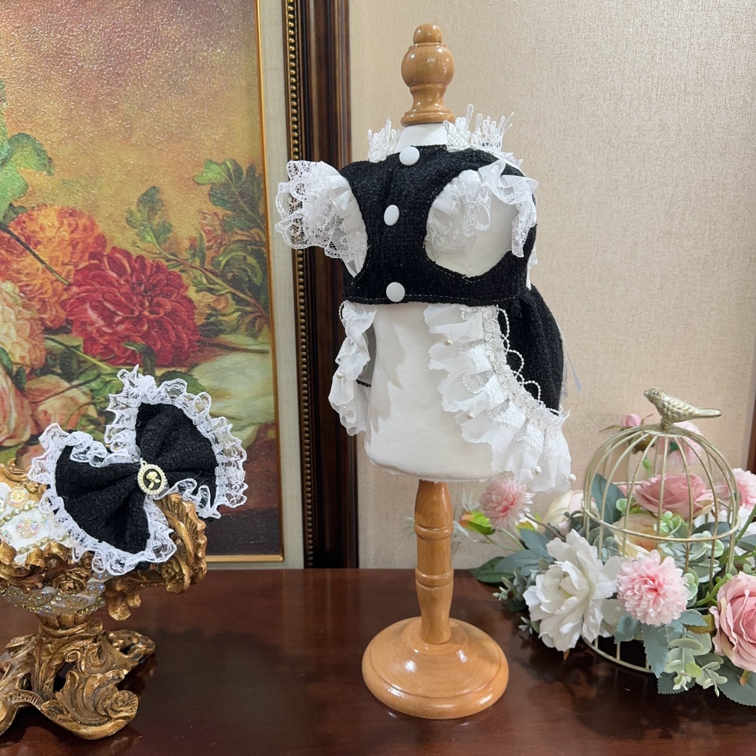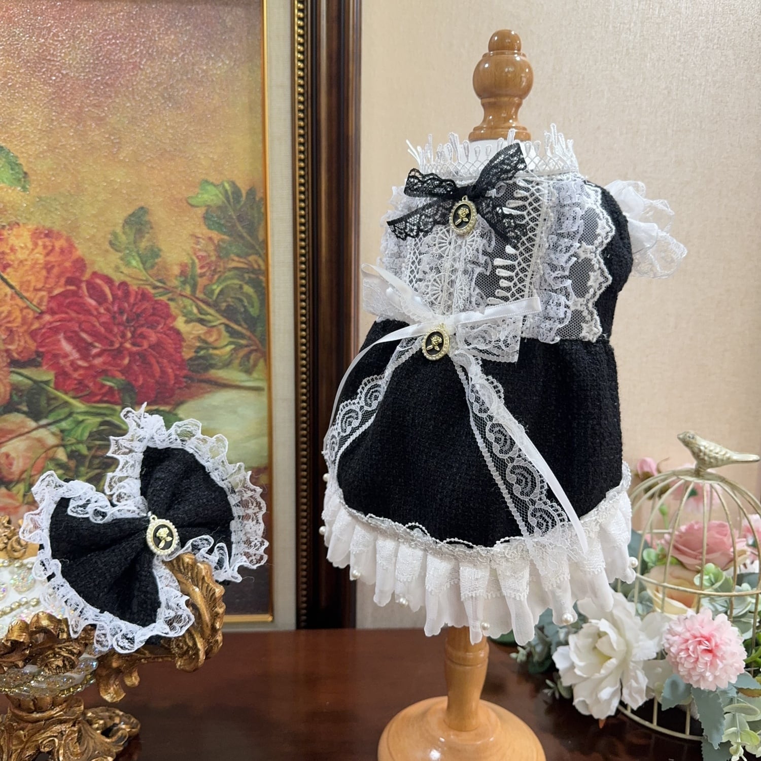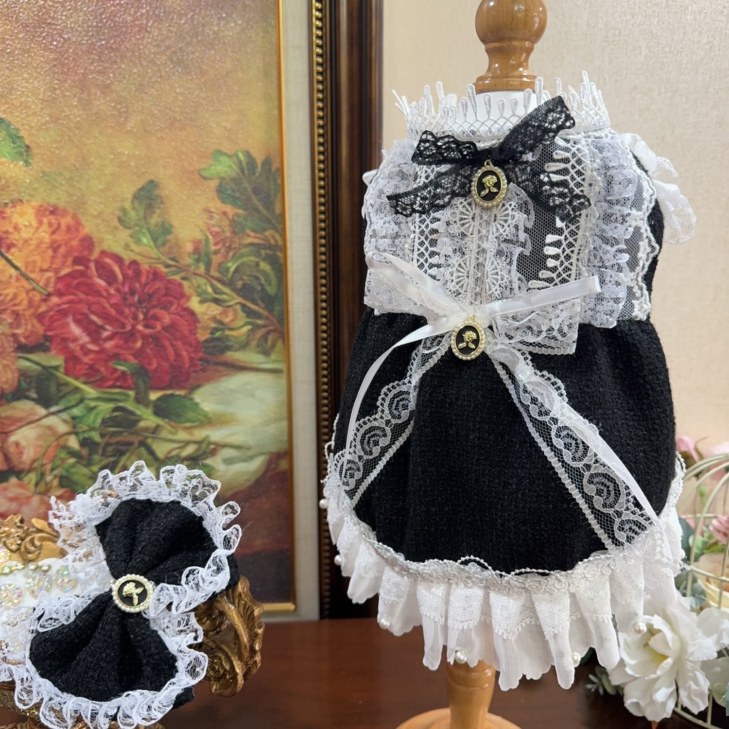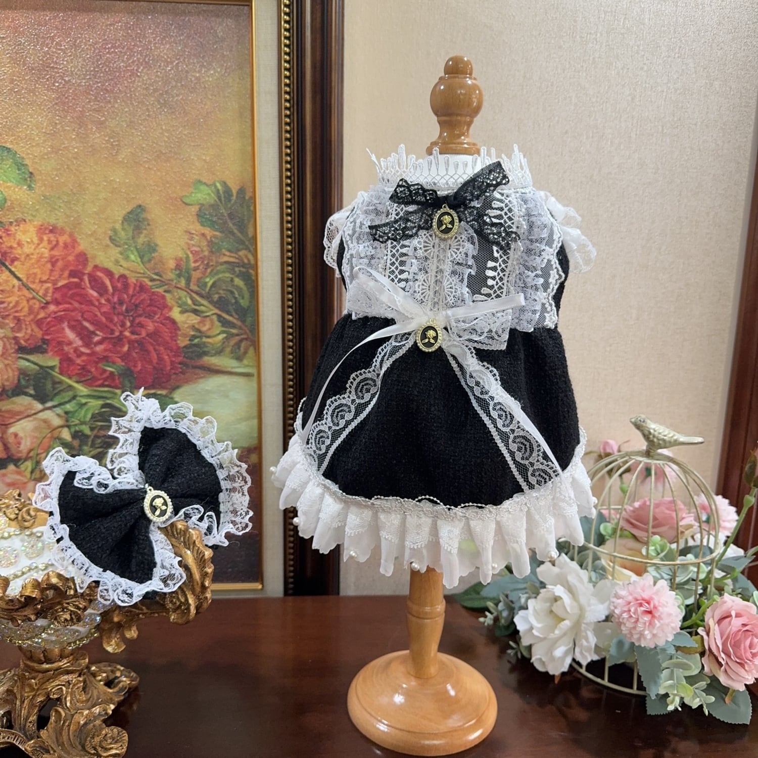 上品なツイード調ブラックに、たっぷりのホワイトレースを重ねたクラシックワンピース。
