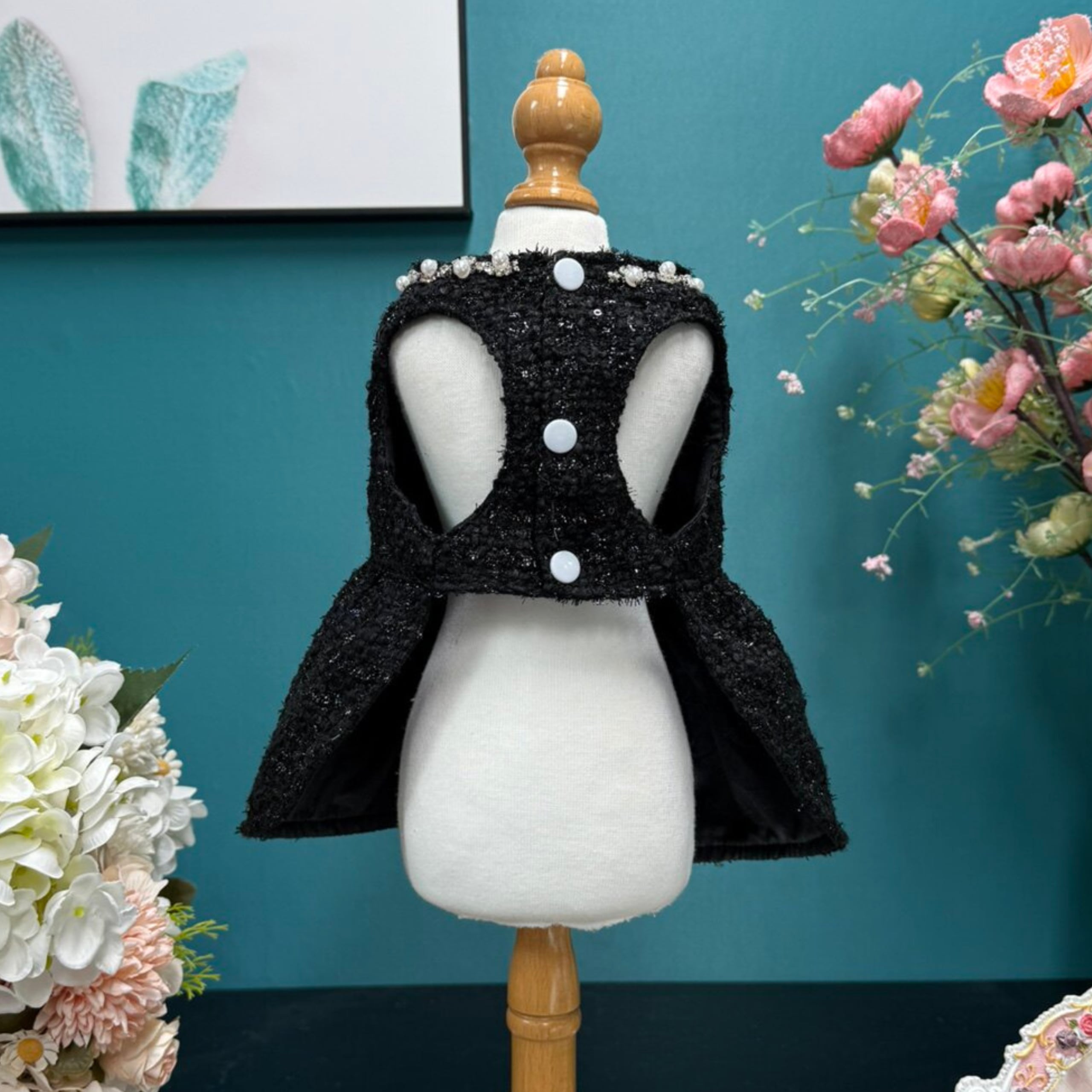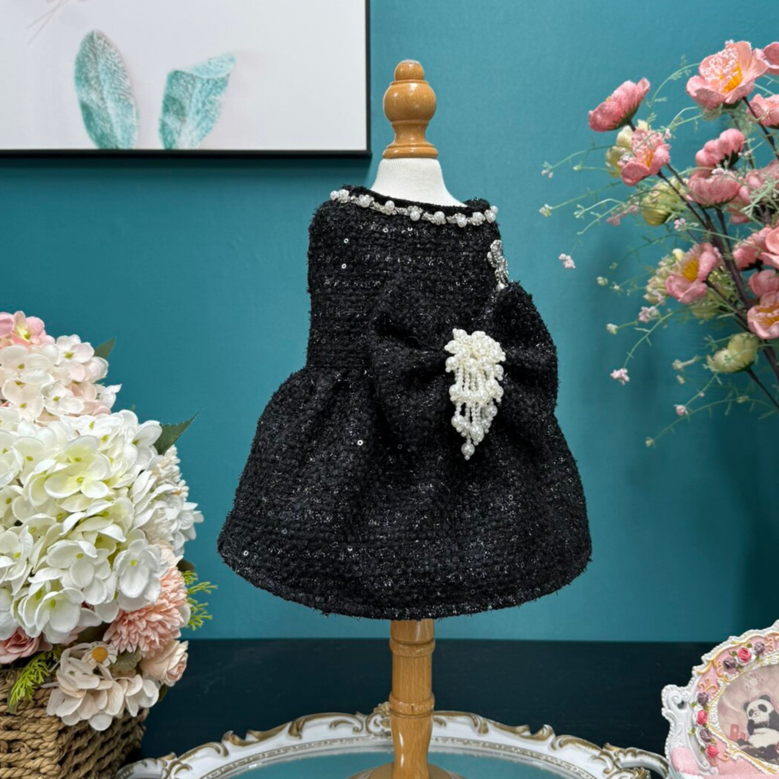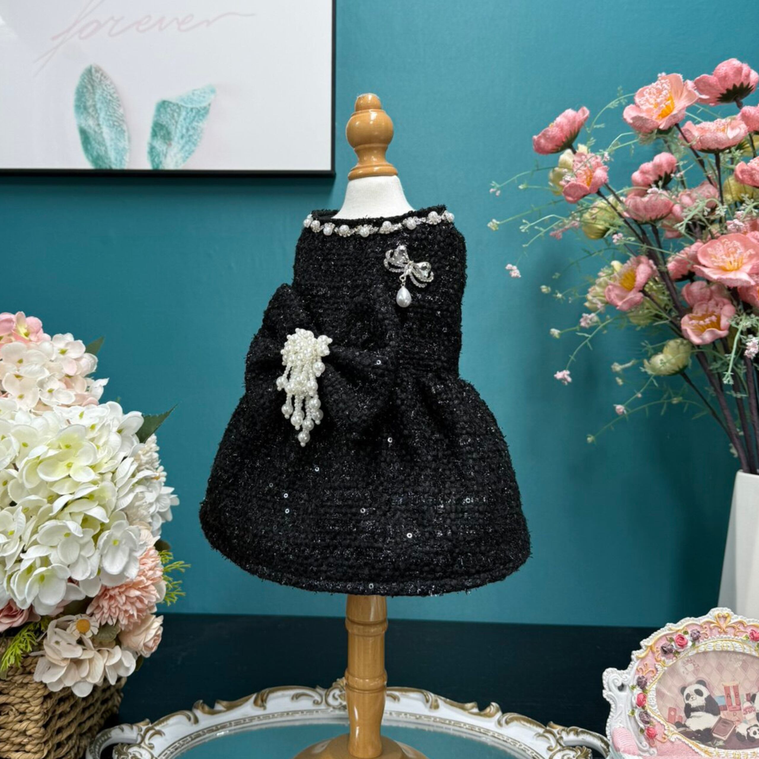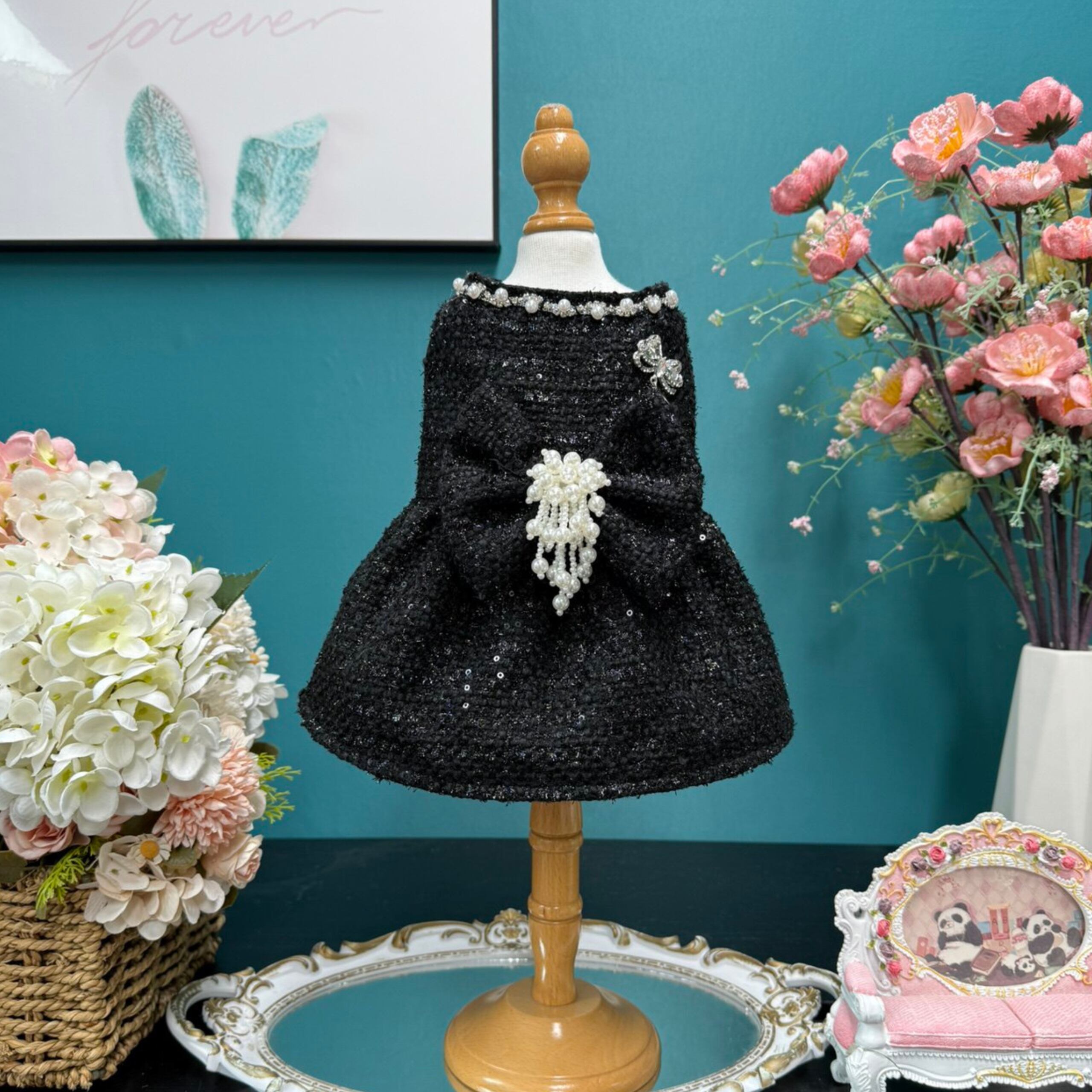 ブラックツイードに、きらめくパール装飾を添えたエレガントなワンピースです。