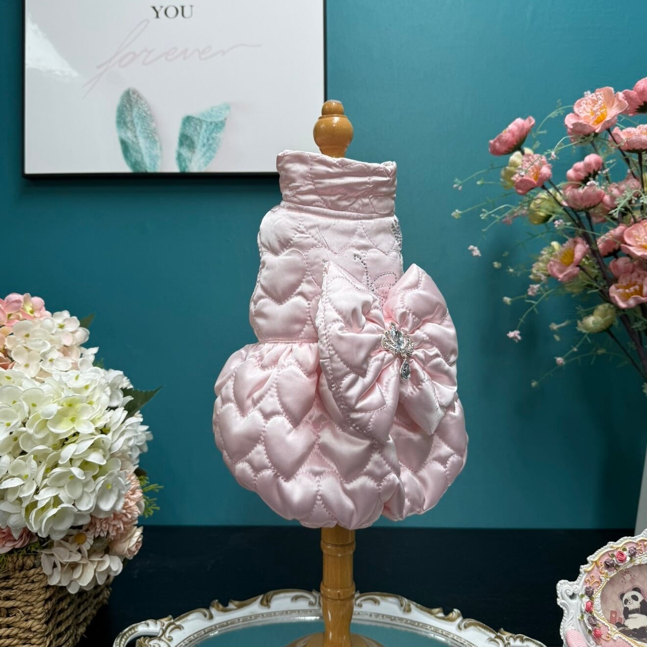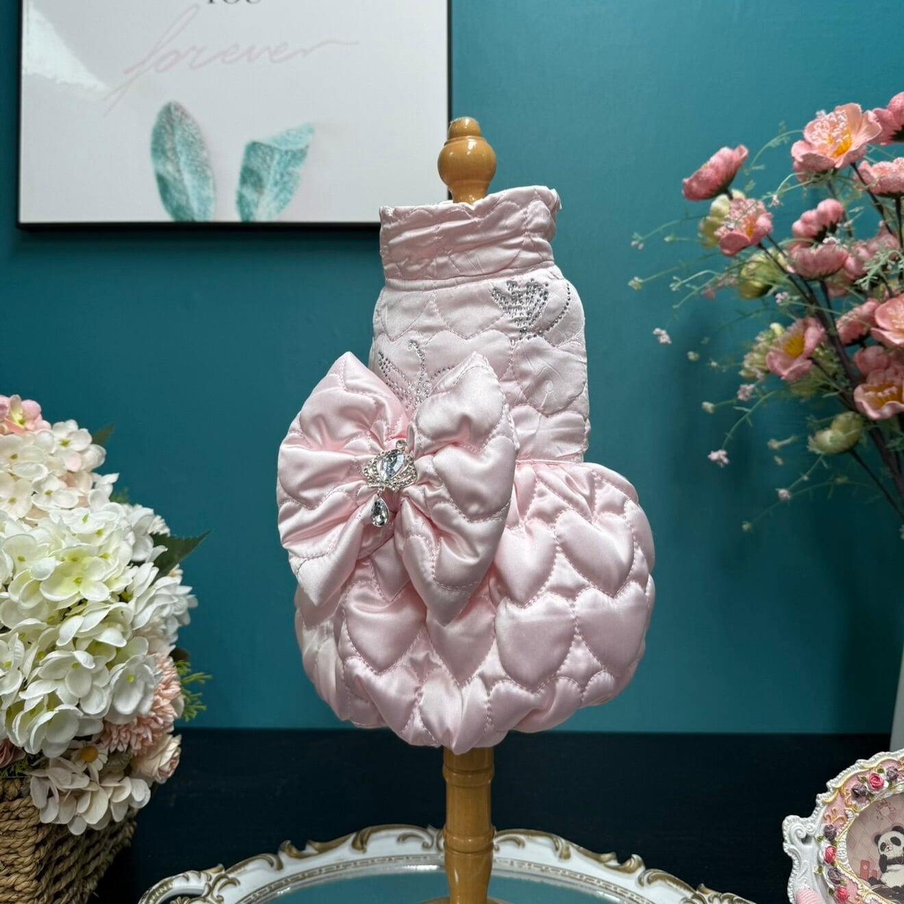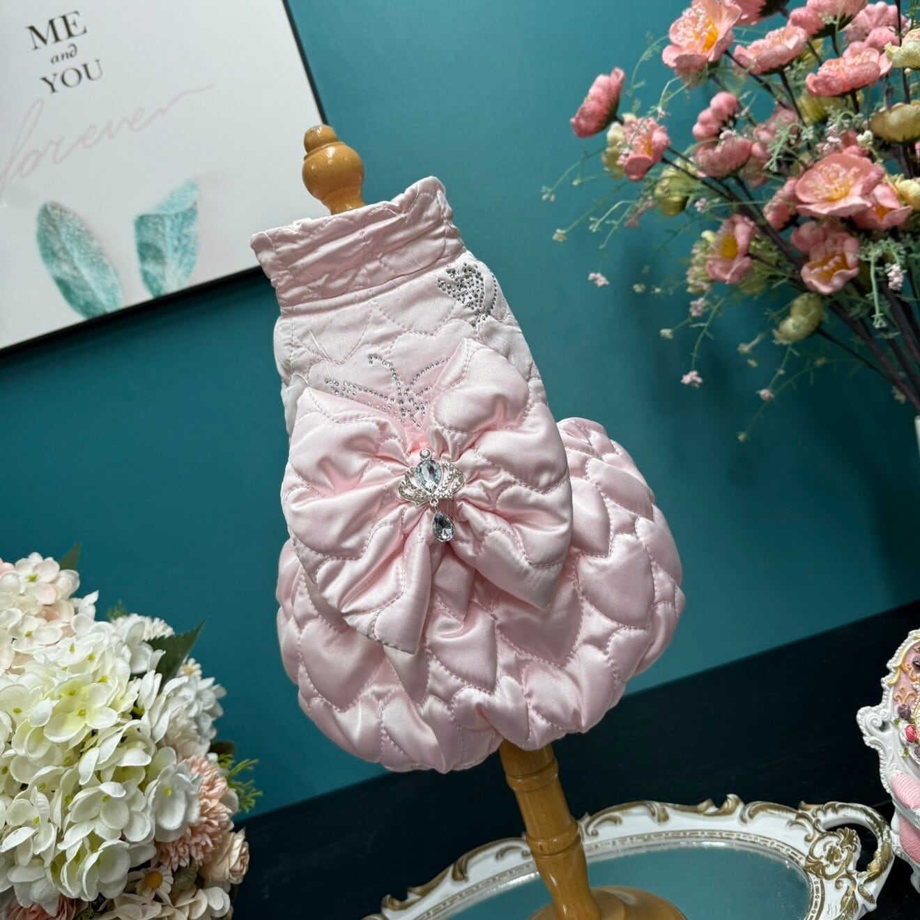 淡いピンクの艶感と、胸元のクリスタル調チャームが上品にきらめきます。