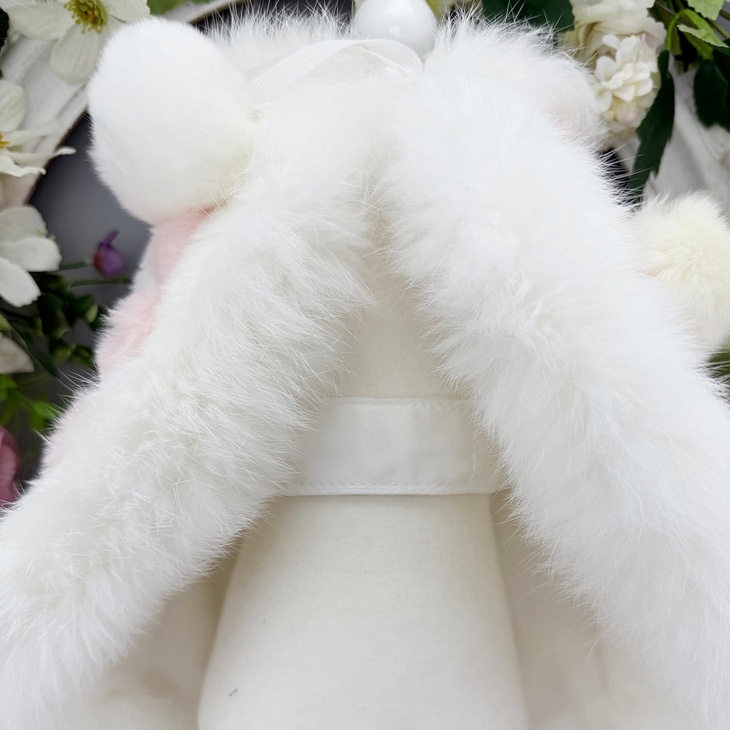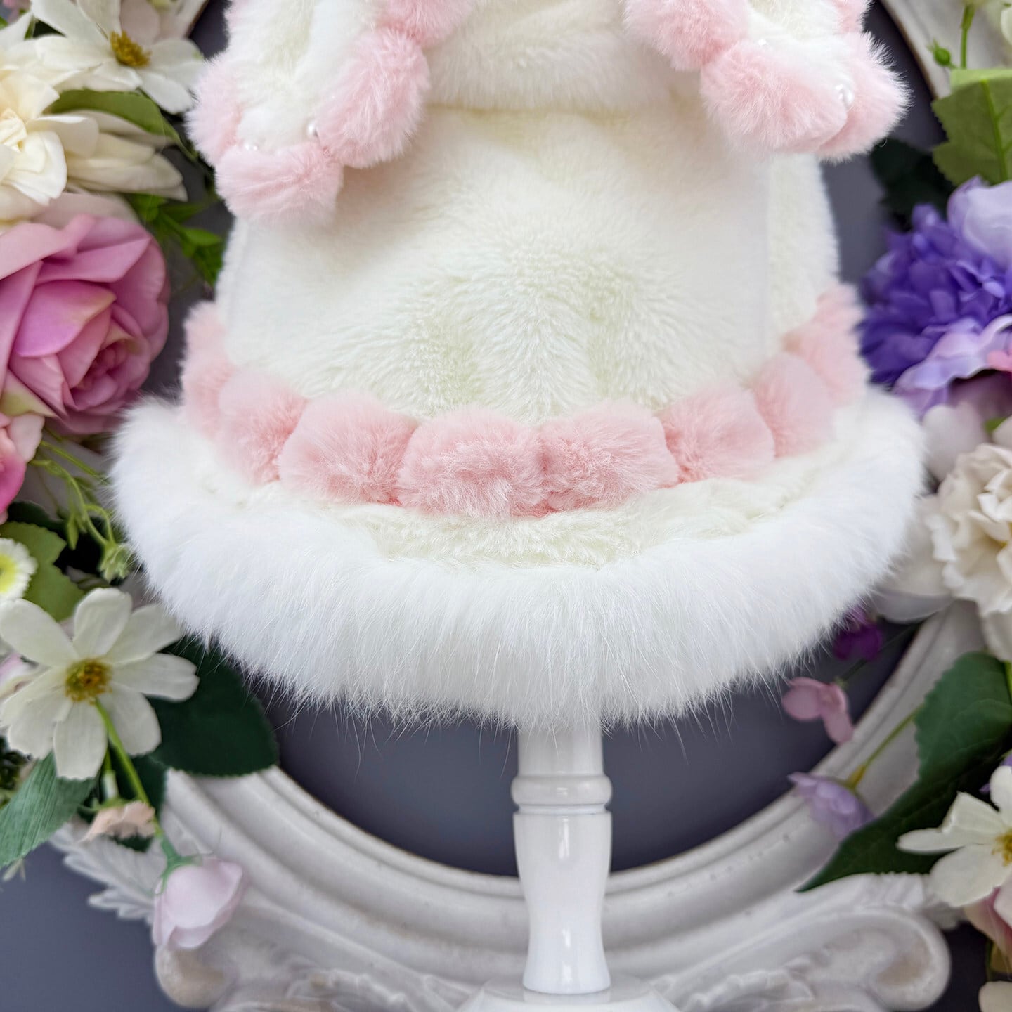 首まわりを包むホワイトファーは、見た目以上にあたたかく、