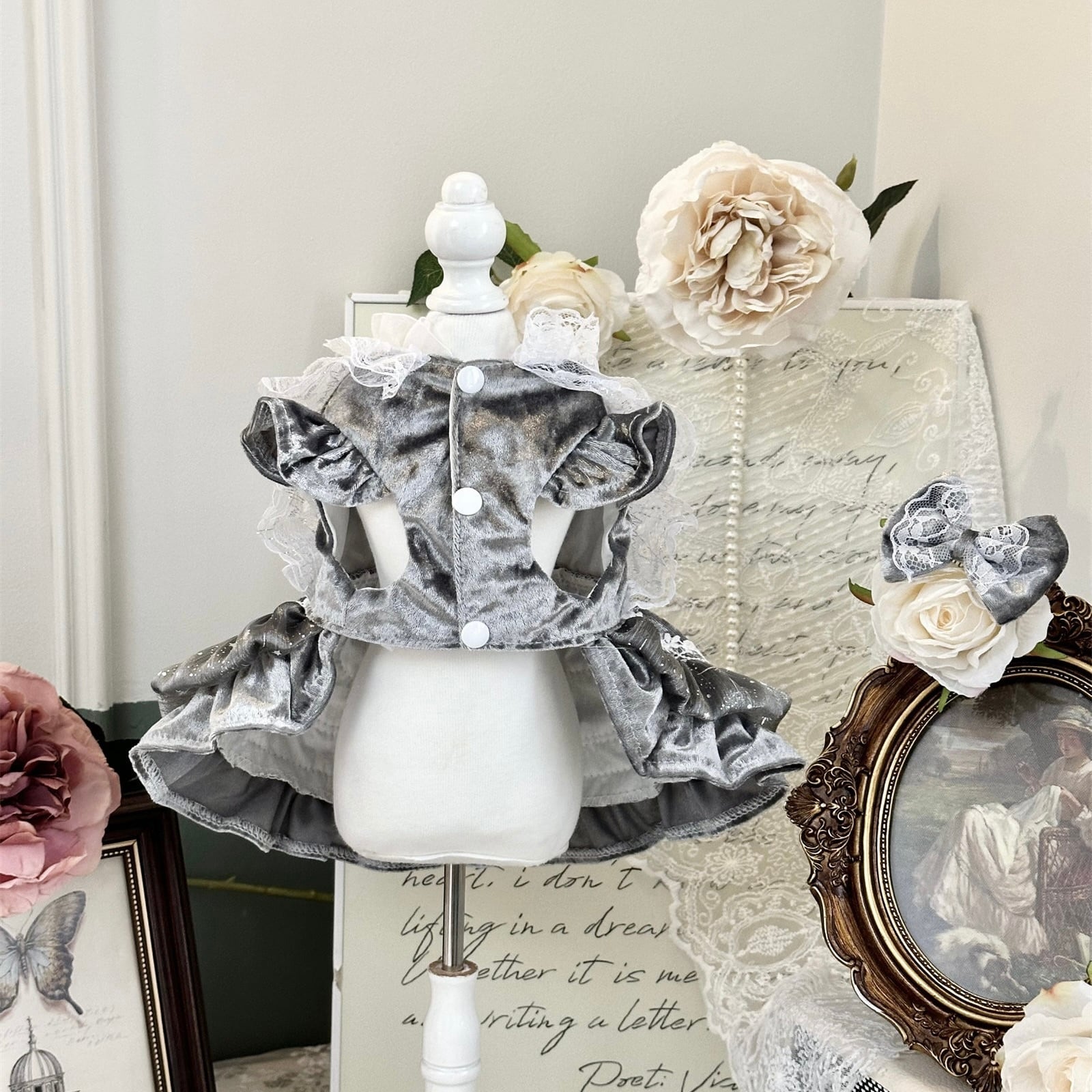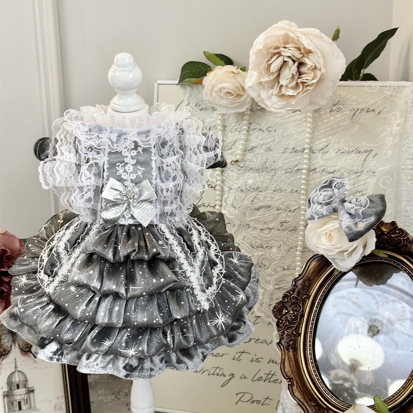 さらに、お洋服とお揃いのリボン付きで統一感のあるコーディネートが完成。後ろ姿まで上品で、撮影やお出かけ、記念日にもぴったりの一着です。
