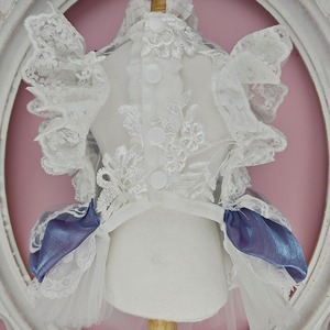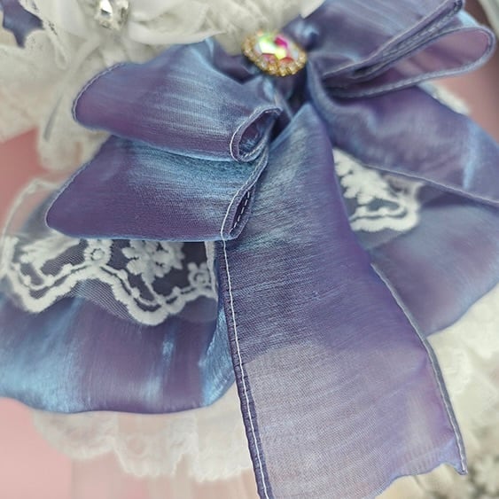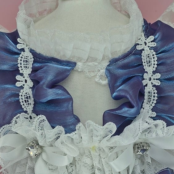 胸元にはたっぷりのフリルをあしらい、立体感のある優雅なシルエットに。背中に結ばれた大きなリボンは存在感があり、後ろ姿まで思わず見惚れてしまう可愛さです。中央のビジューモチーフがさりげなく輝き、特別感をさらに高めてくれます。