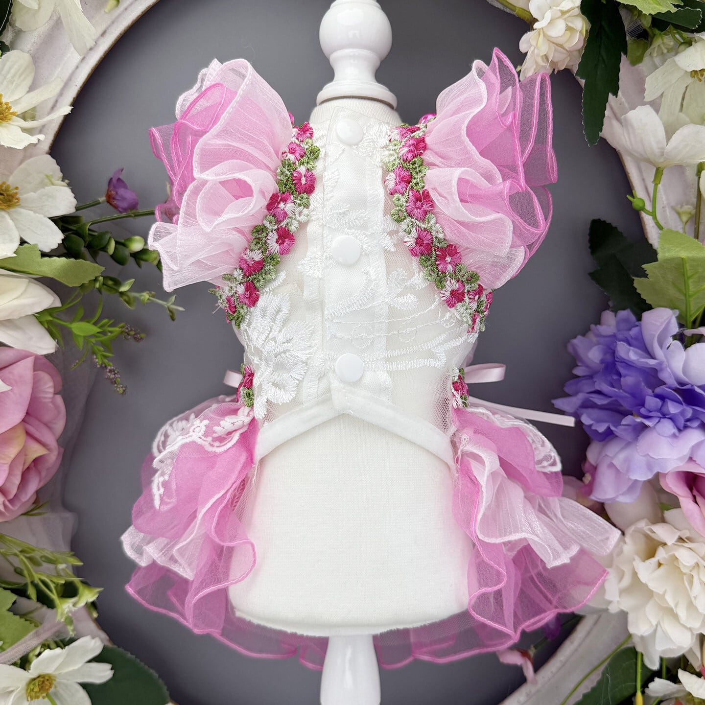やわらかなピンクに可憐なフラワー刺繍を重ねた、王道のロマンティックドレス。ふんわりと広がるスカートが軽やかな立体感を生み出し、後ろ姿まで印象的に仕上げてくれます。