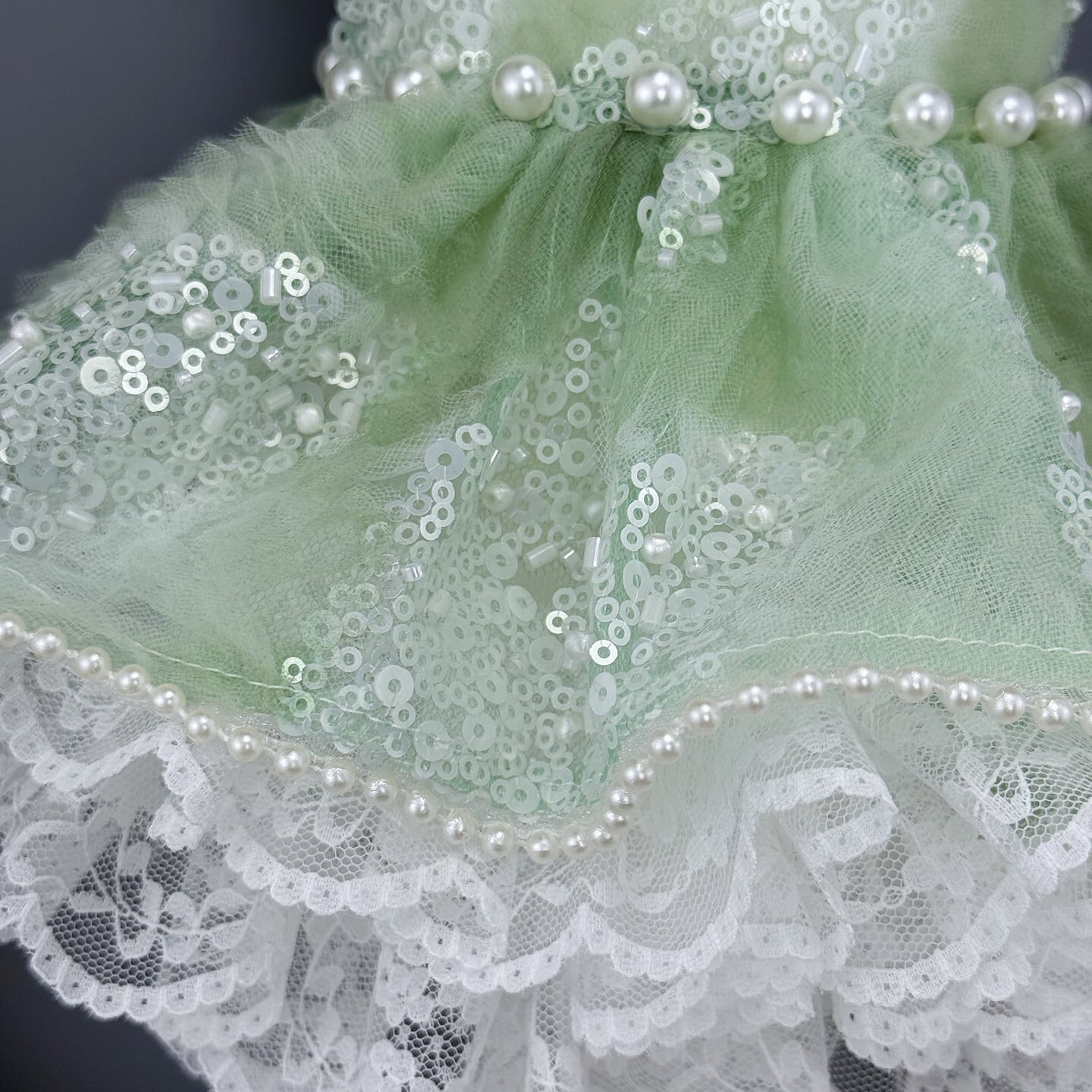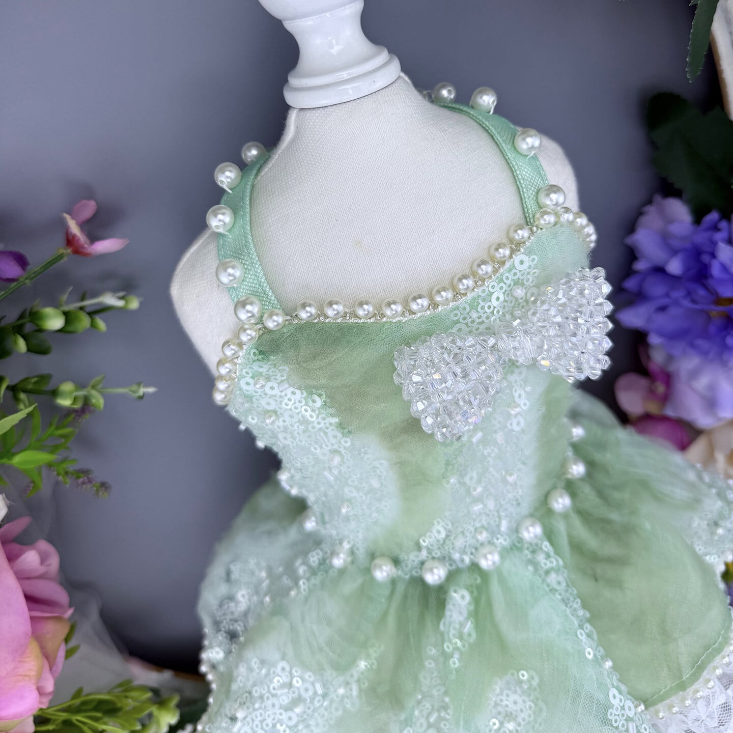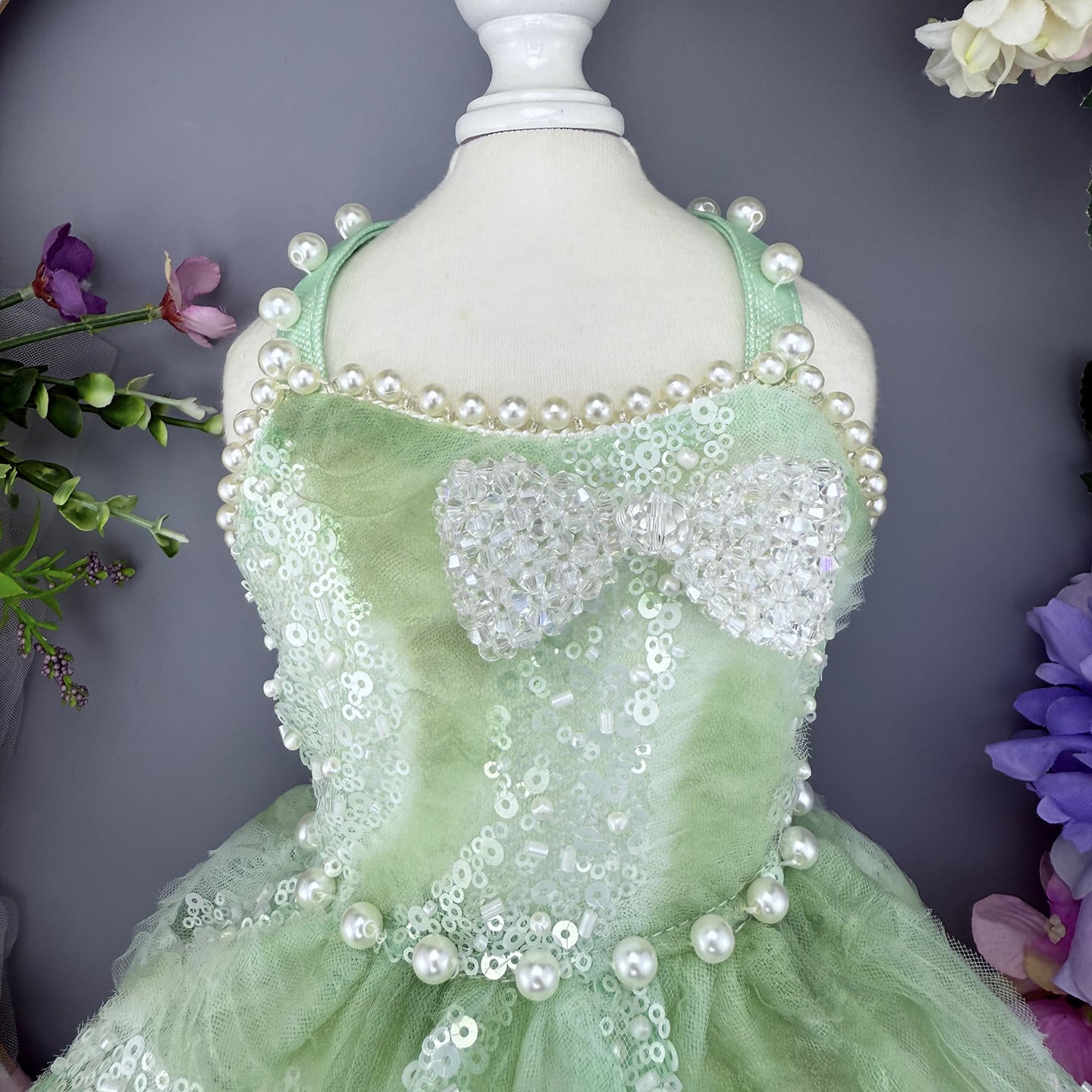 透明感あふれるミントグリーンに、繊細なスパンコールの輝きを重ねたエレガントなプリンセスドレス。光を受けるたびにやさしくきらめき、清楚で洗練された印象を演出します。