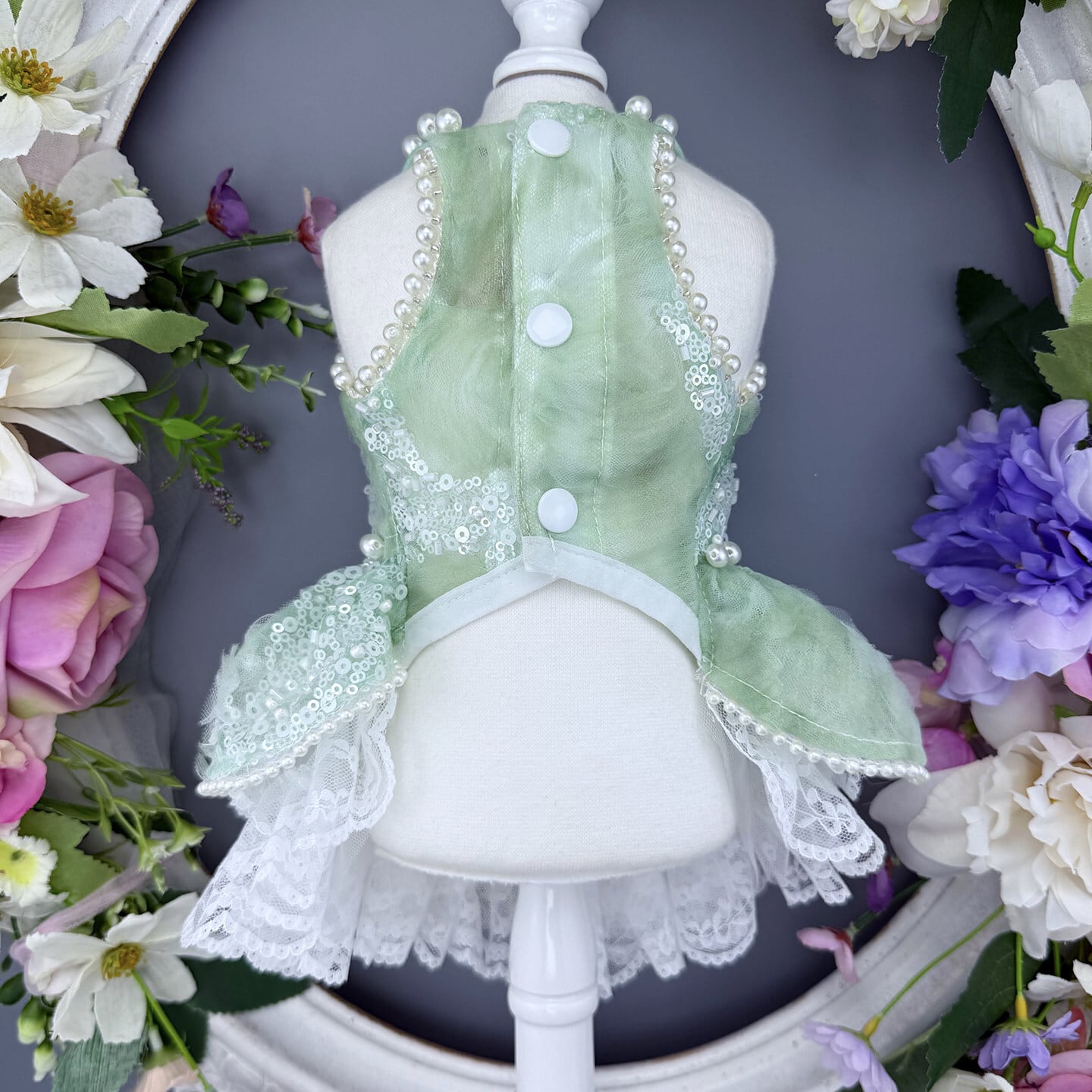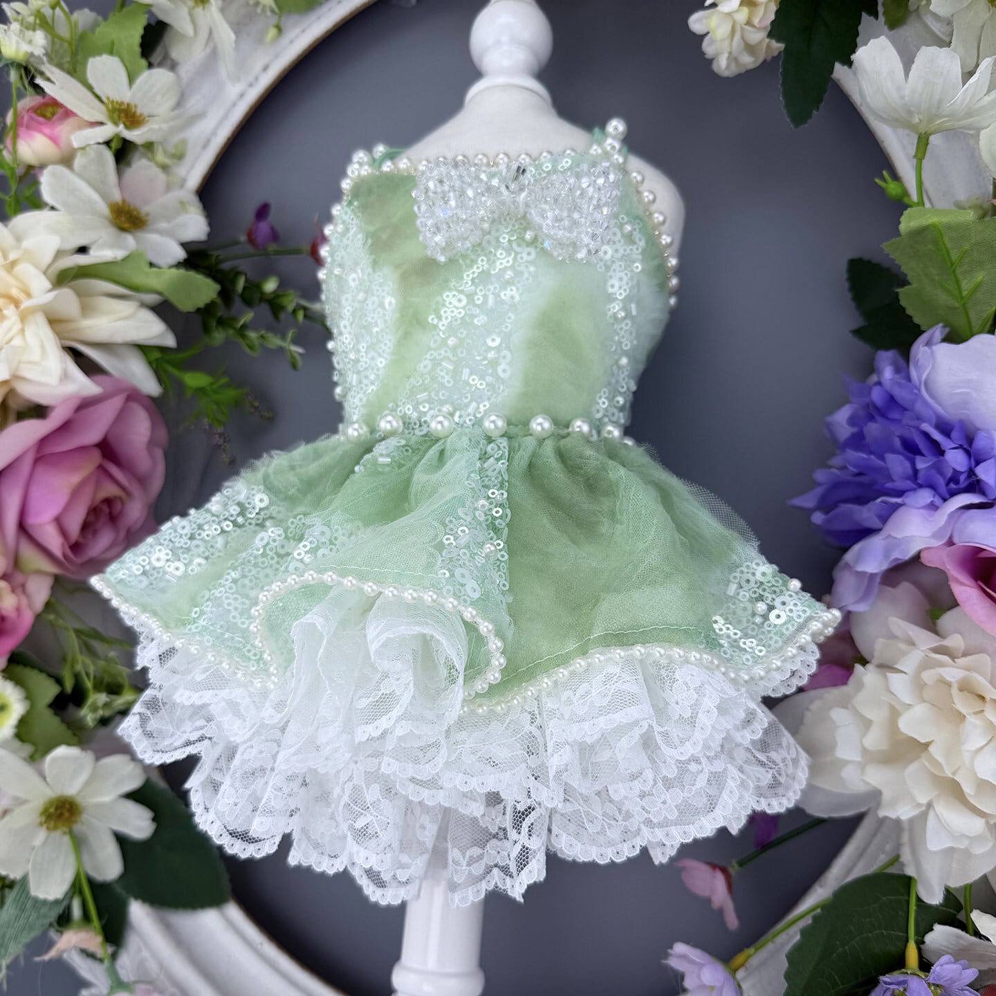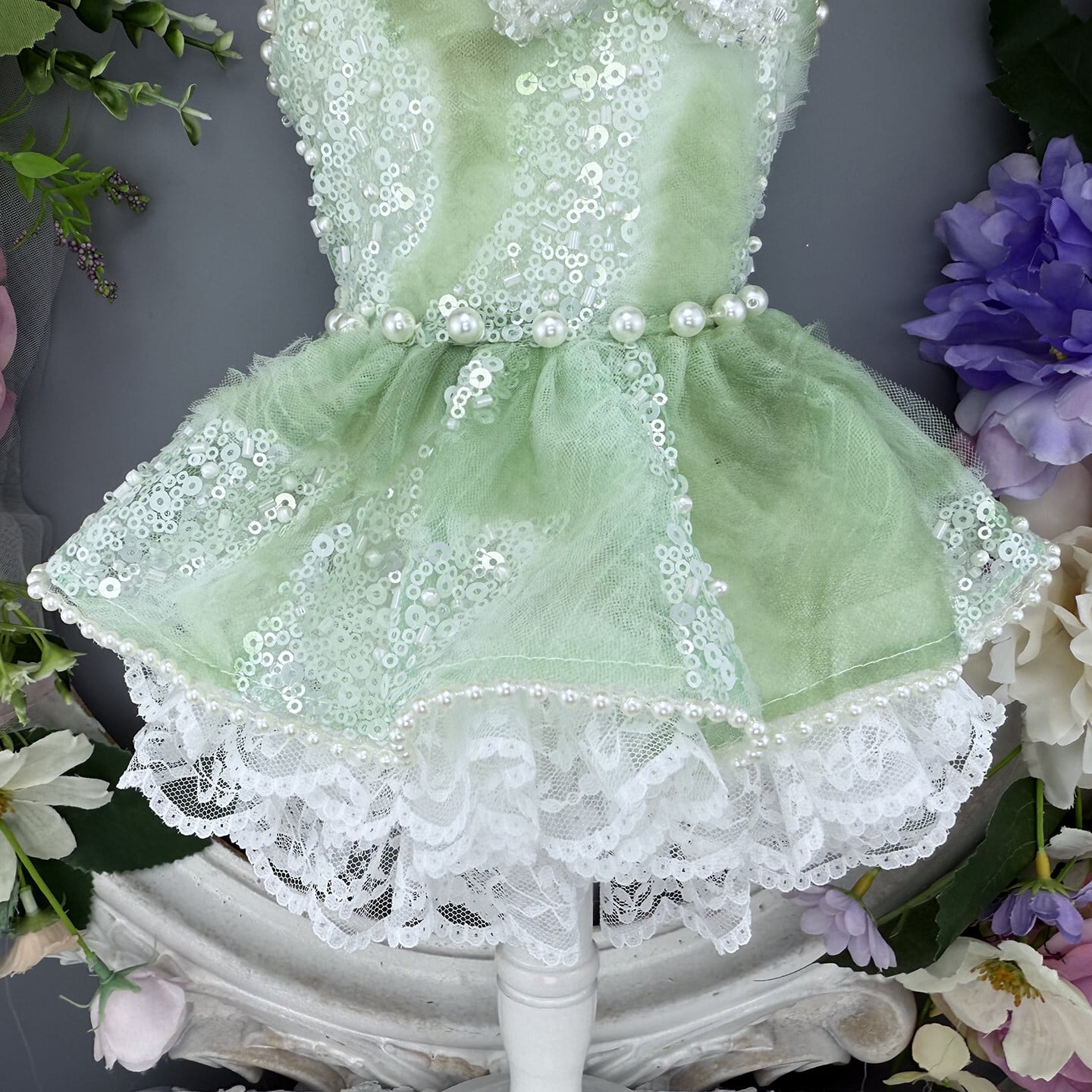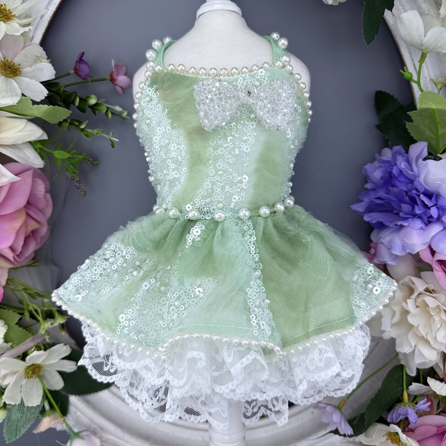 透明感あふれるミントグリーンに、繊細なスパンコールの輝きを重ねたエレガントなプリンセスドレス。光を受けるたびにやさしくきらめき、清楚で洗練された印象を演出します。