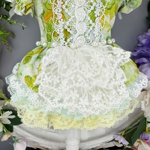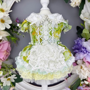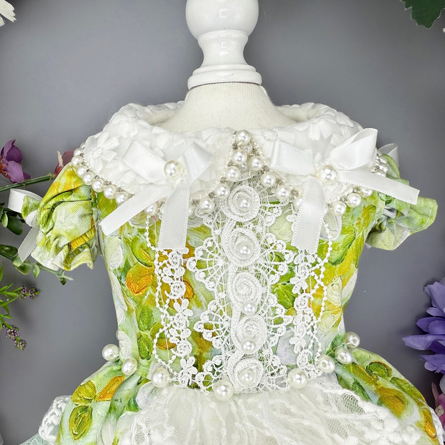 みずみずしいレモンカラーのフラワープリントが目を惹く、爽やかで華やかなプリンセスドレス。まるで春のガーデンに咲く花々を閉じ込めたような、明るく優しい雰囲気が魅力です。