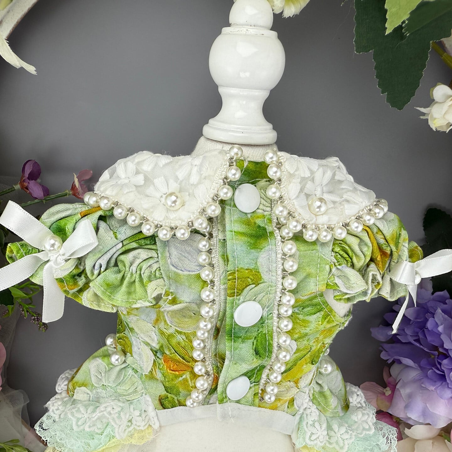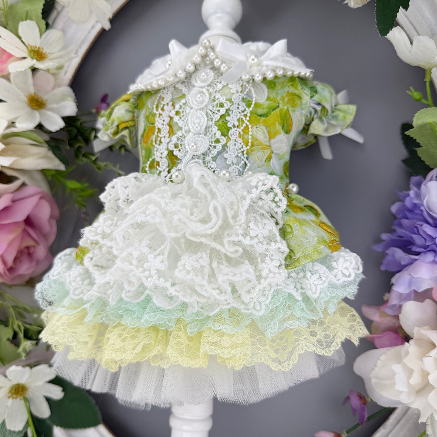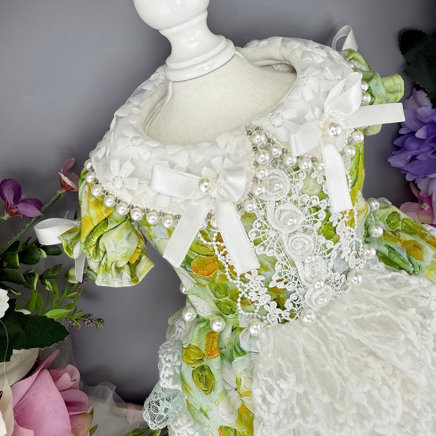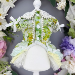胸元には繊細なレースとパール調の装飾を贅沢にあしらい、可憐さの中に気品をプラス。立体的に重なるレースフリルがスカートにふんわりとしたボリュームを生み、軽やかで愛らしいシルエットを描きます。