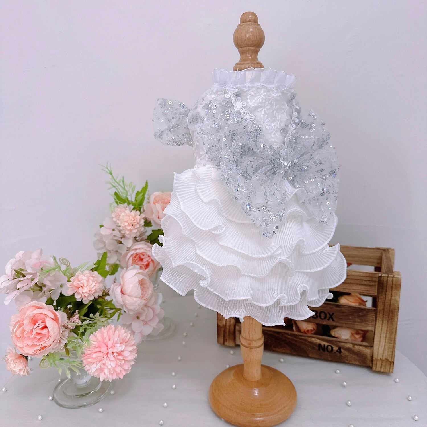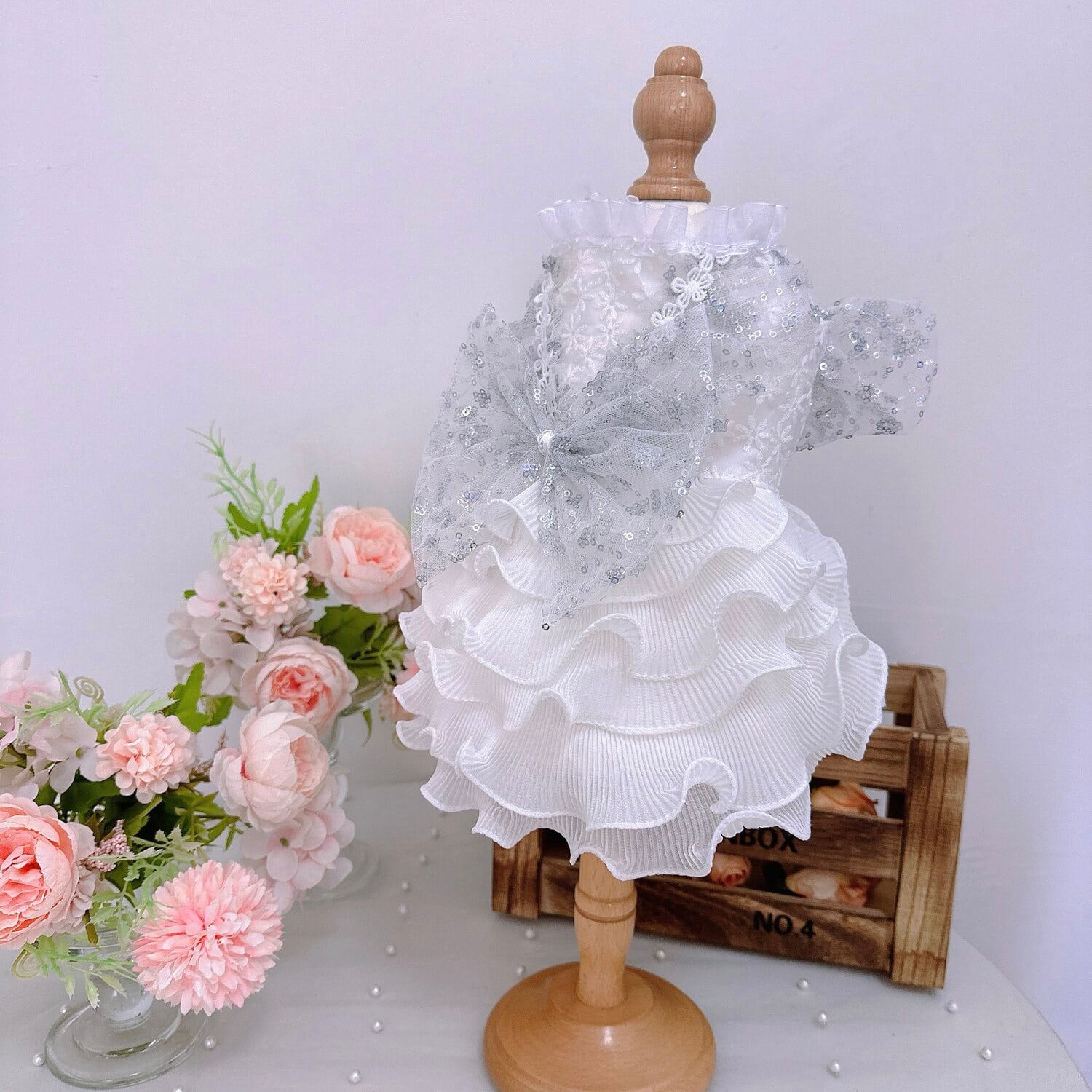 胸元にはきらめくシフォンリボンをあしらい、