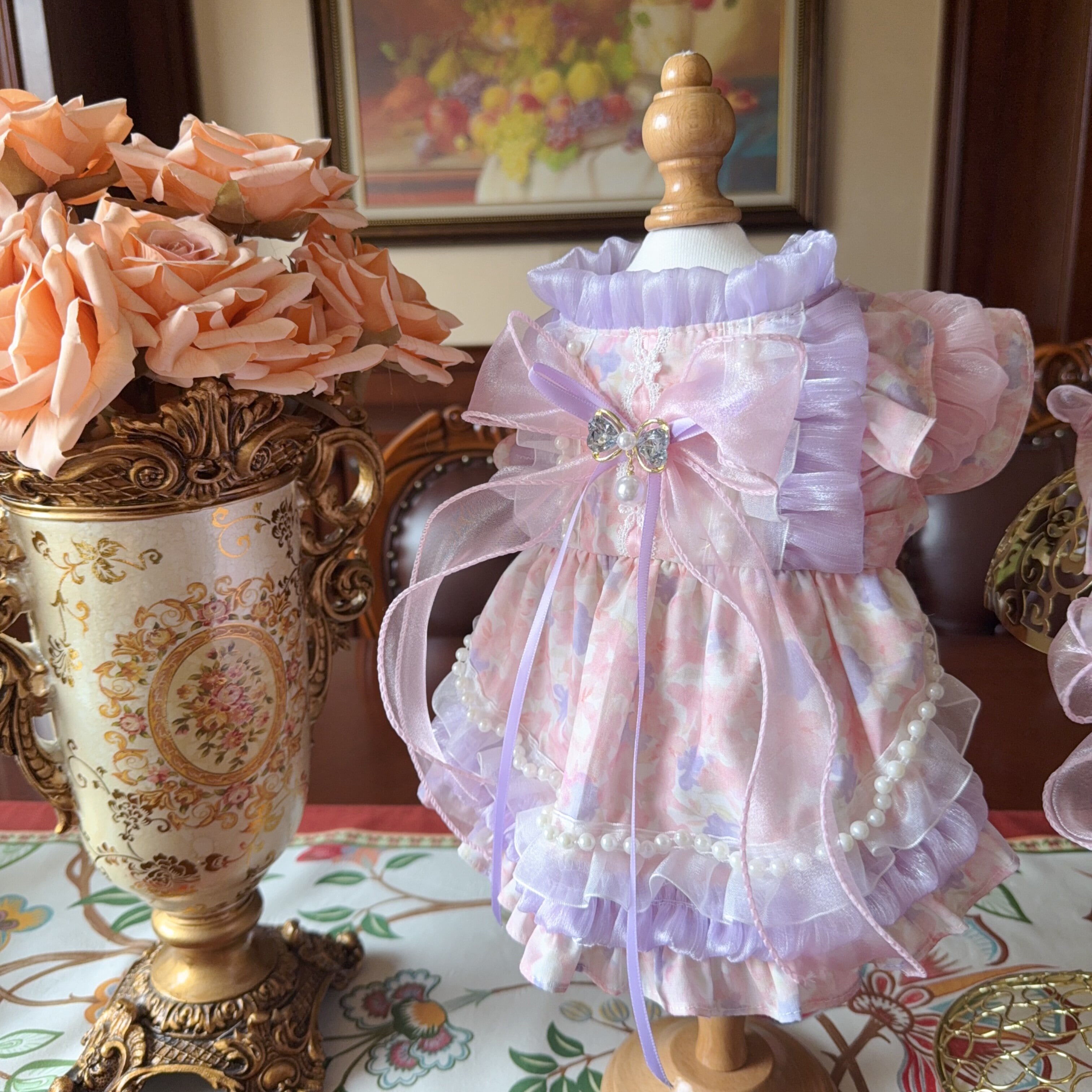 スカート部分にはパール装飾とフリルを重ね、どの角度から見ても華やかさを感じられるデザインです。
