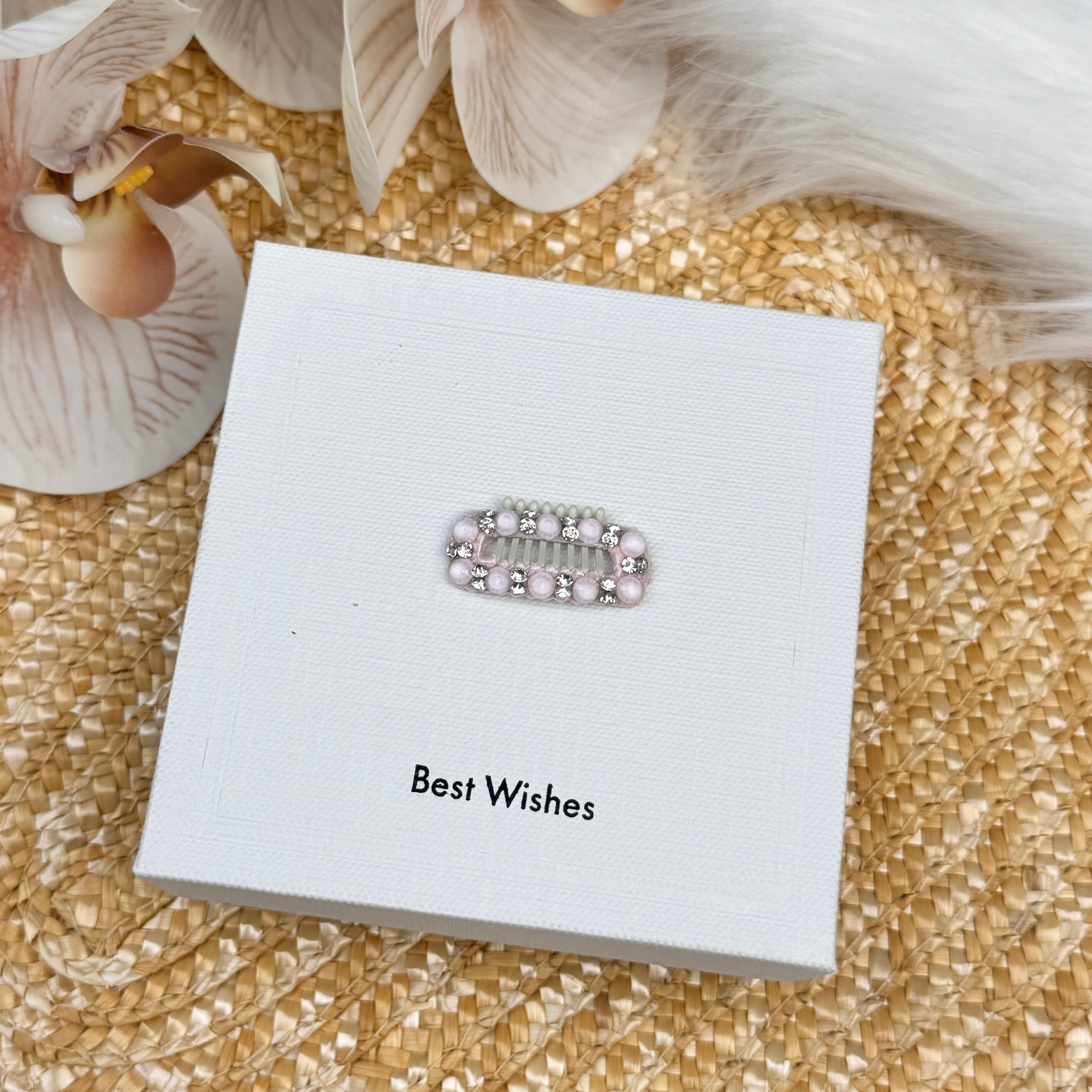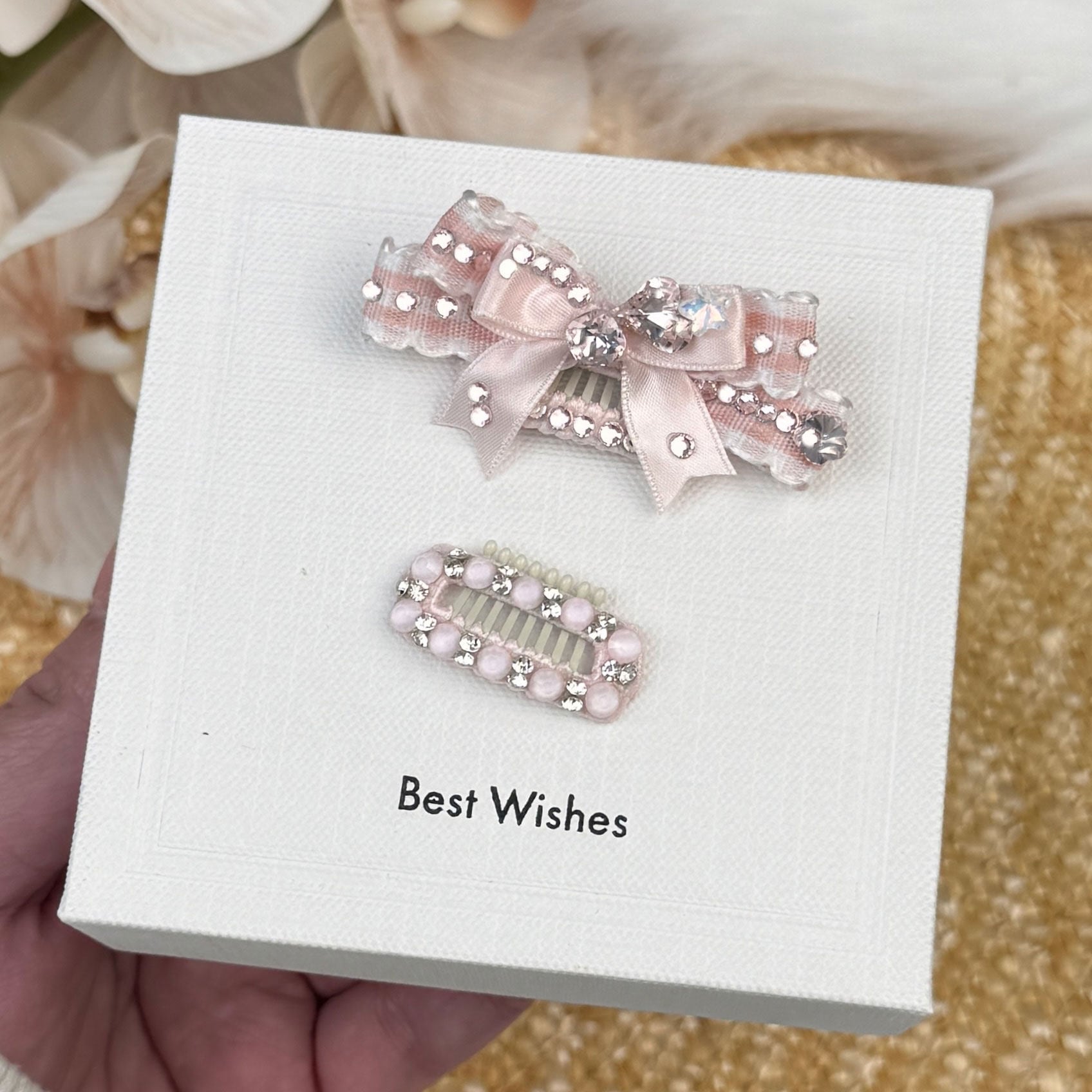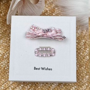 やわらかなピンクのリボンデザインと、繊細な装飾のコームの2点入りです。