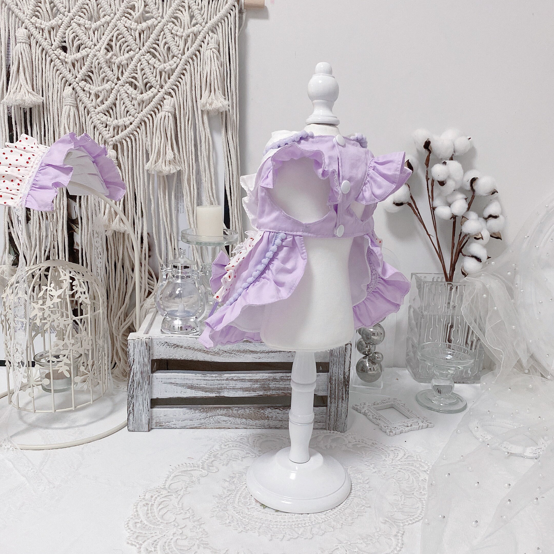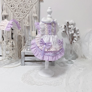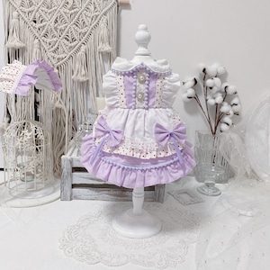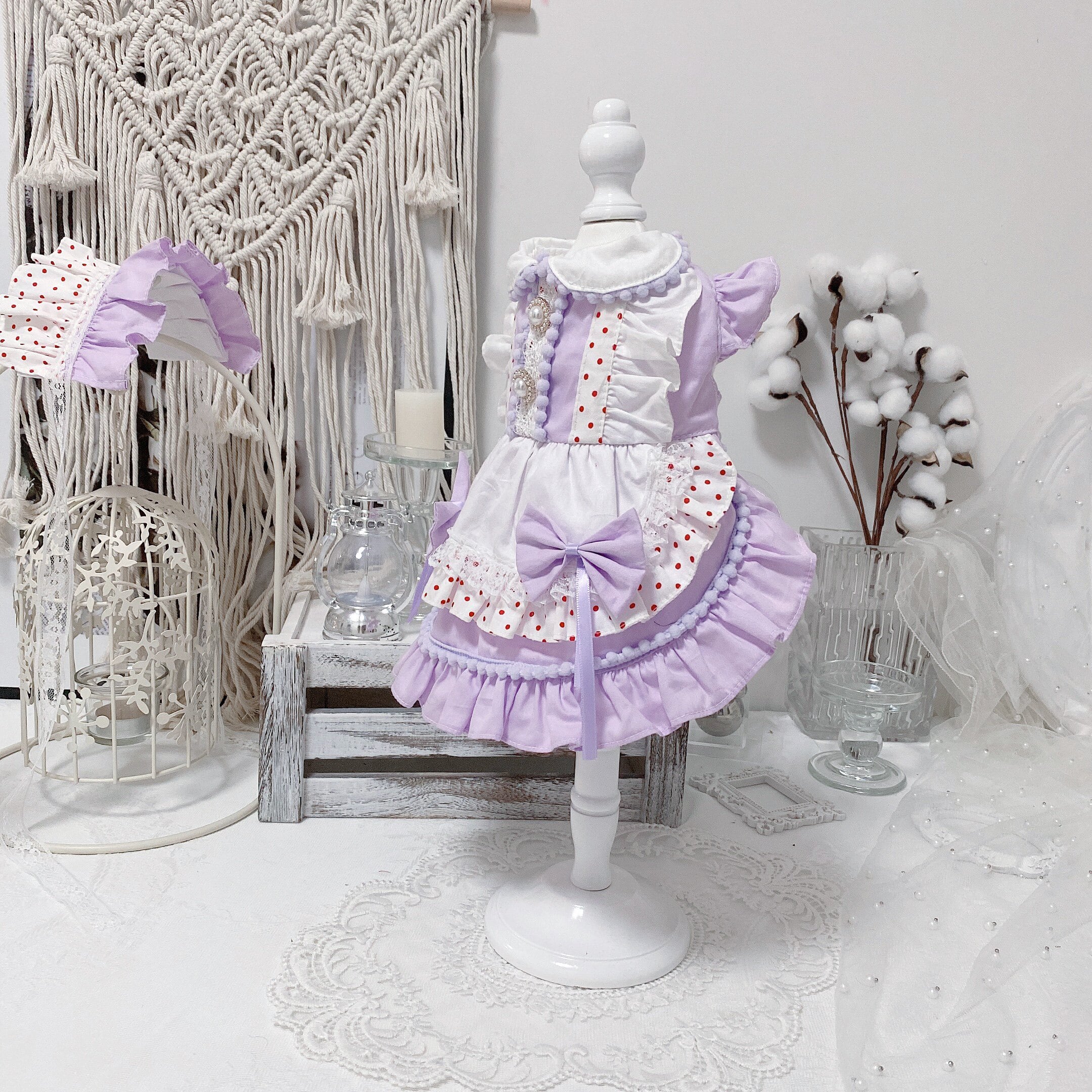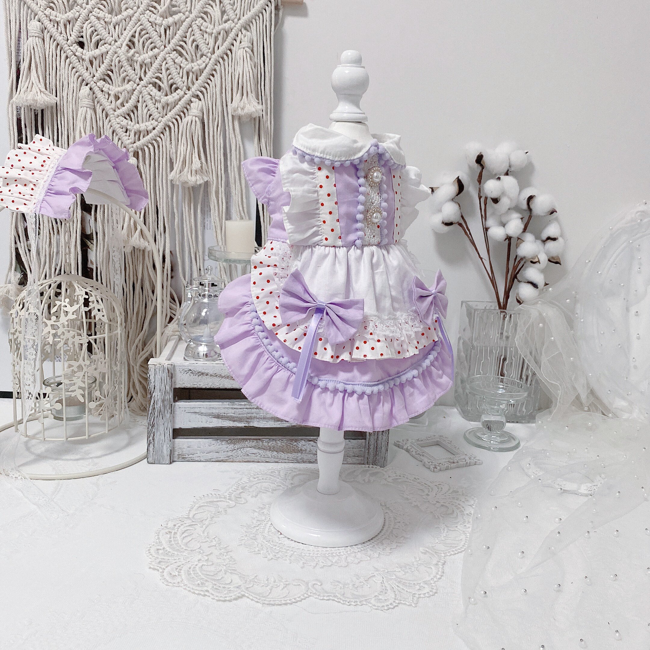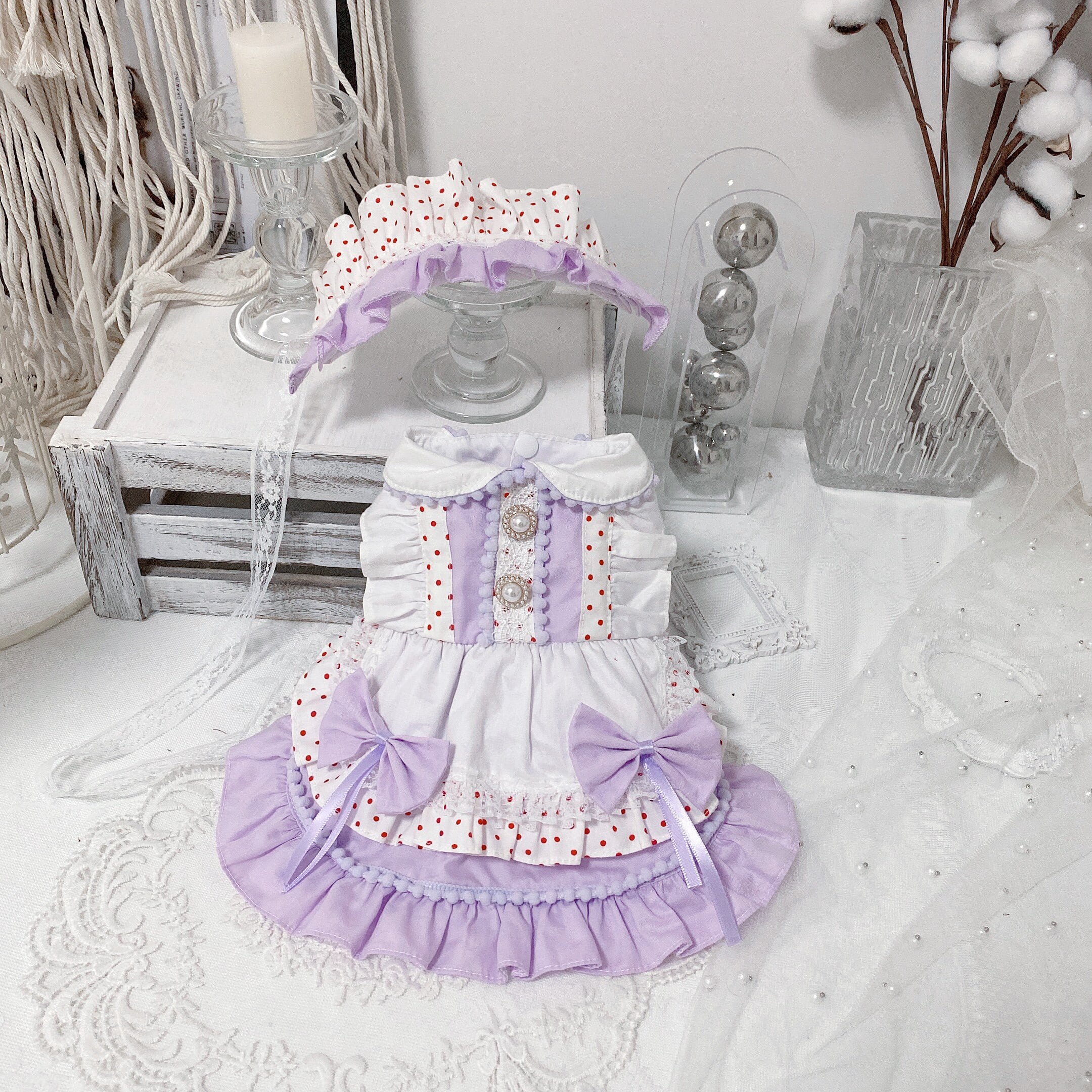やさしいパープルカラーに、赤のドットがアクセントになったガーリーなドレス。