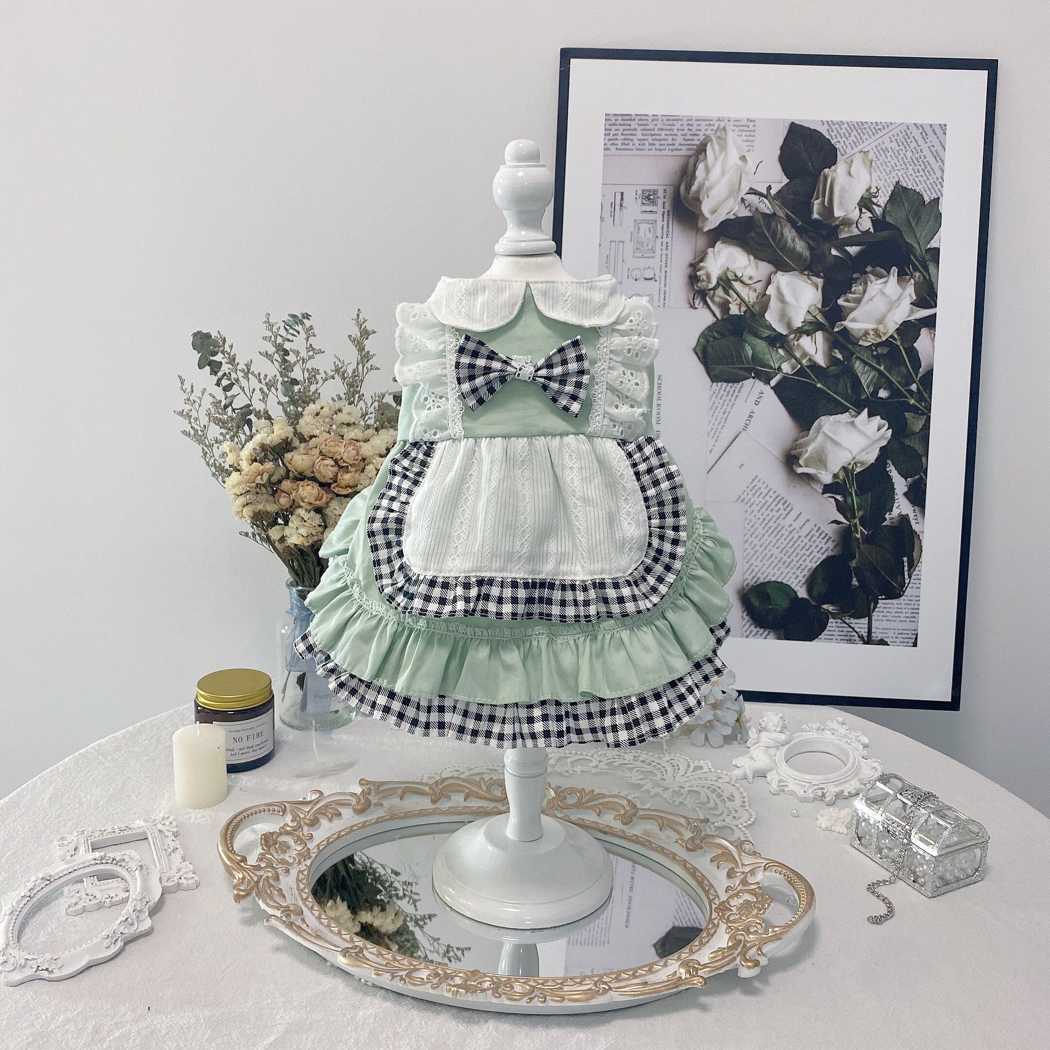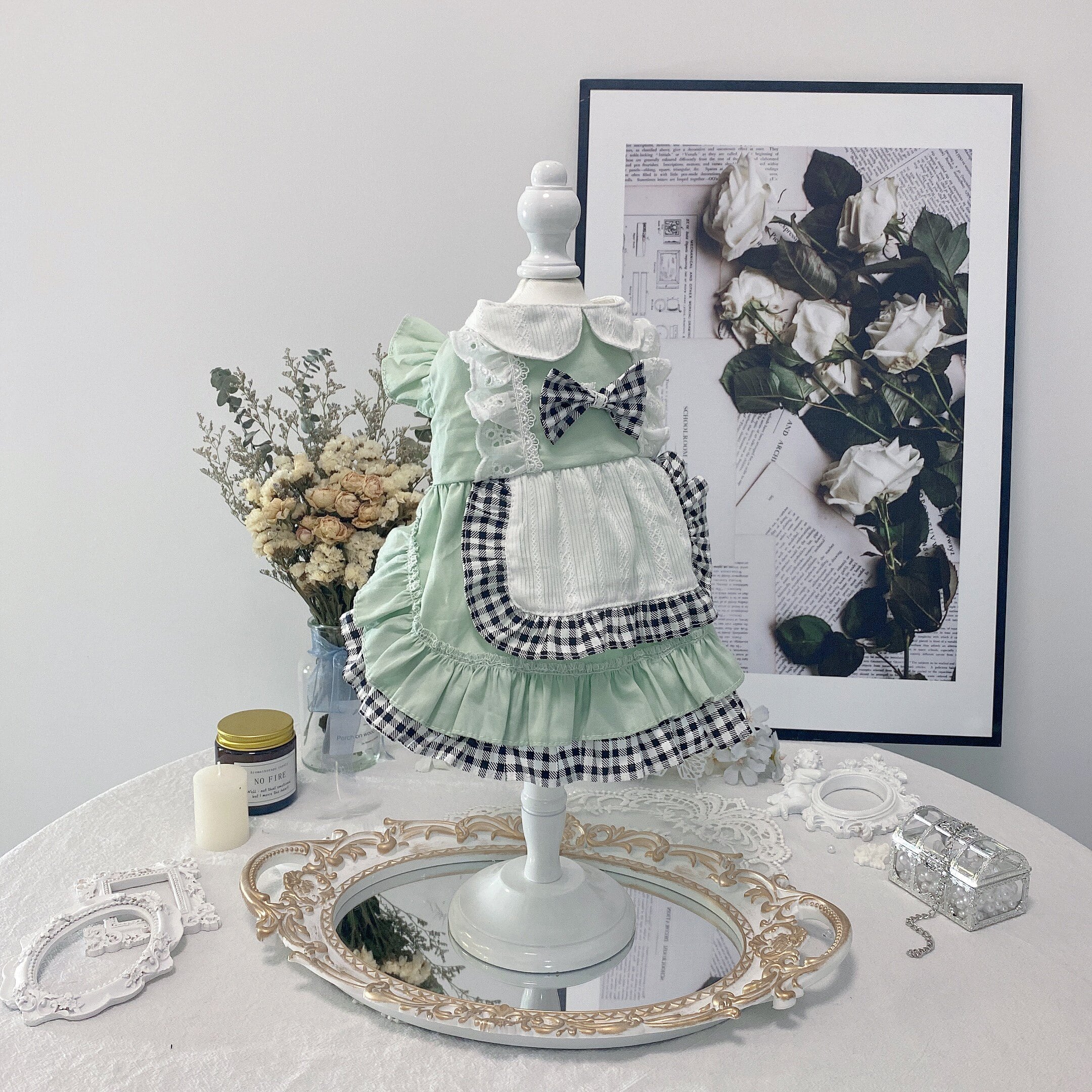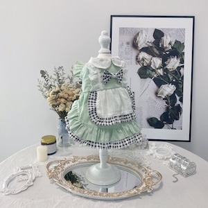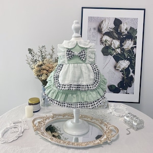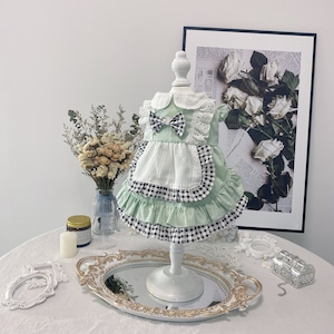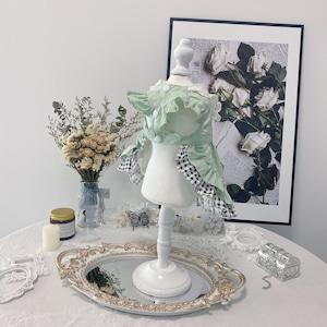 爽やかなミントグリーンに、ギンガムチェックを組み合わせたエプロン風ワンピース。