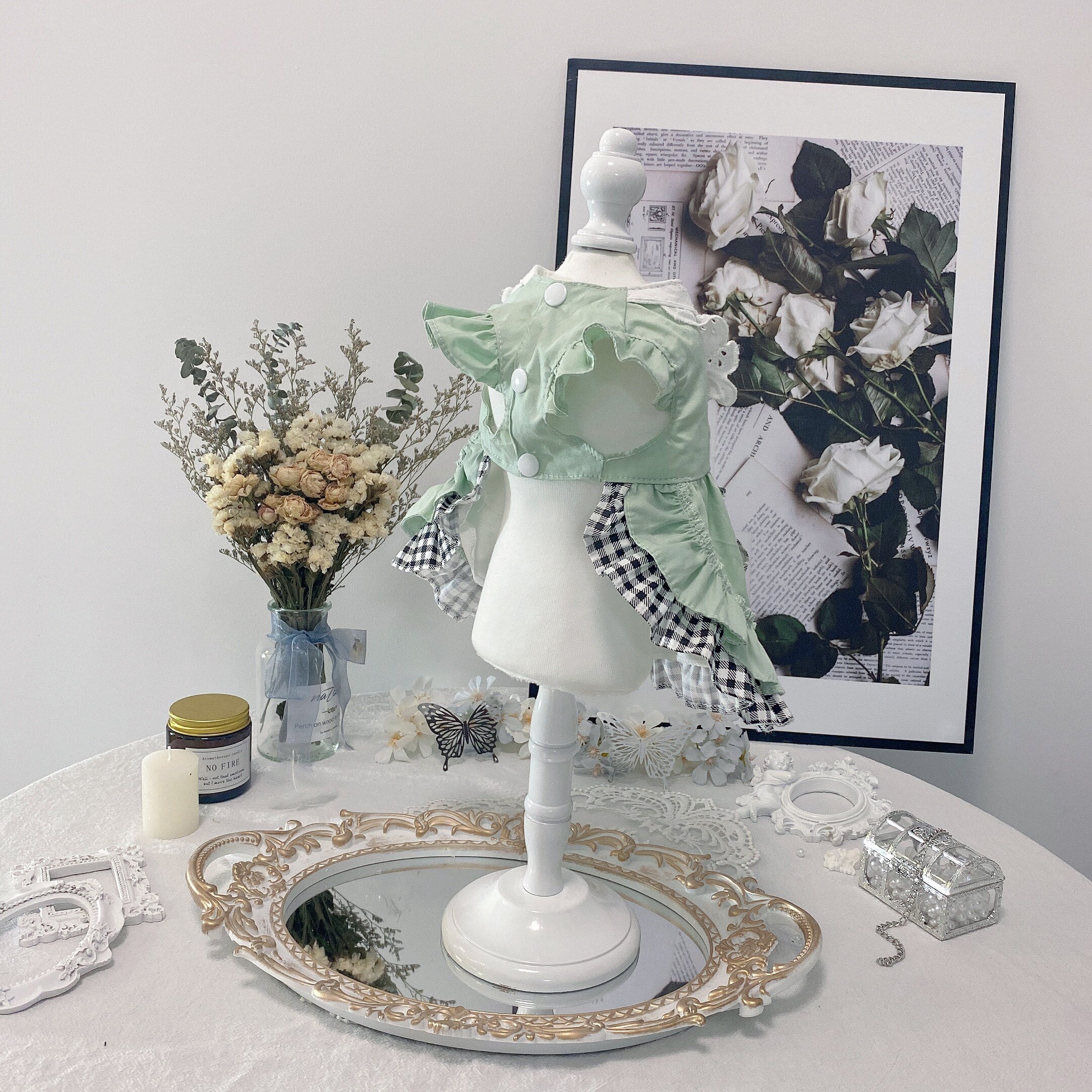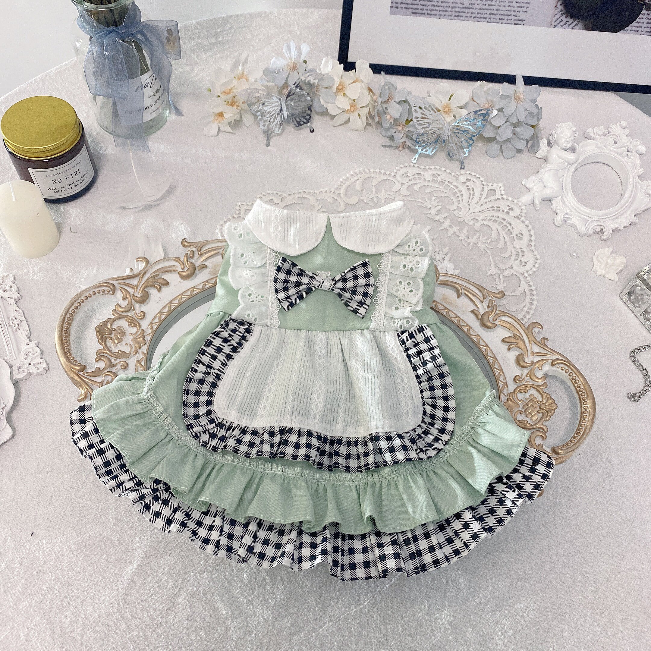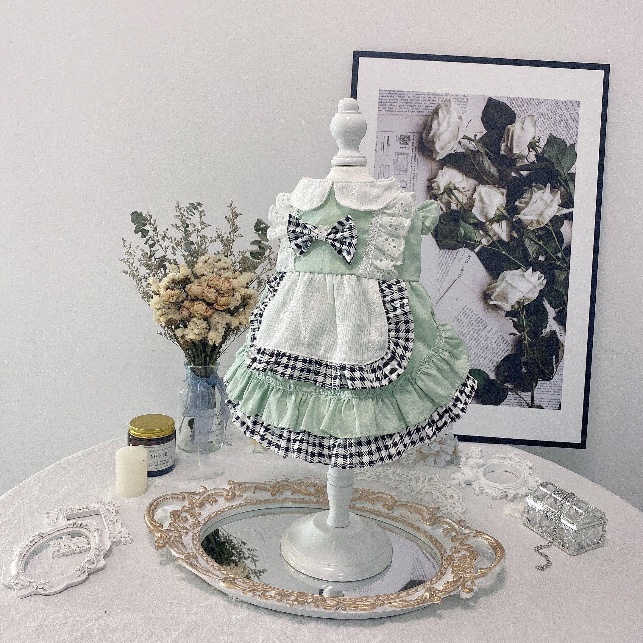 爽やかなミントグリーンに、ギンガムチェックを組み合わせたエプロン風ワンピース。