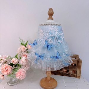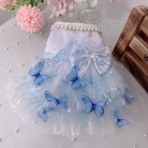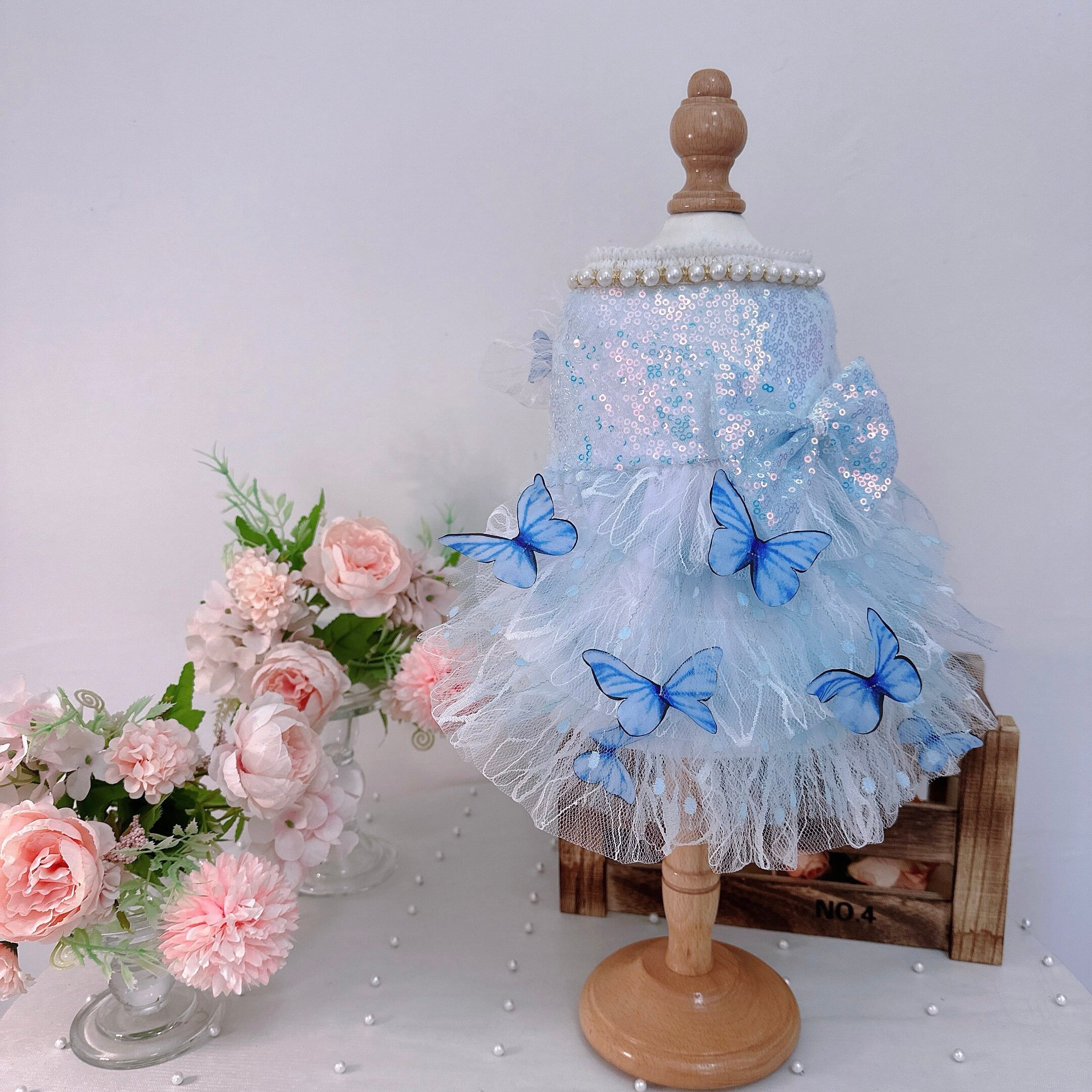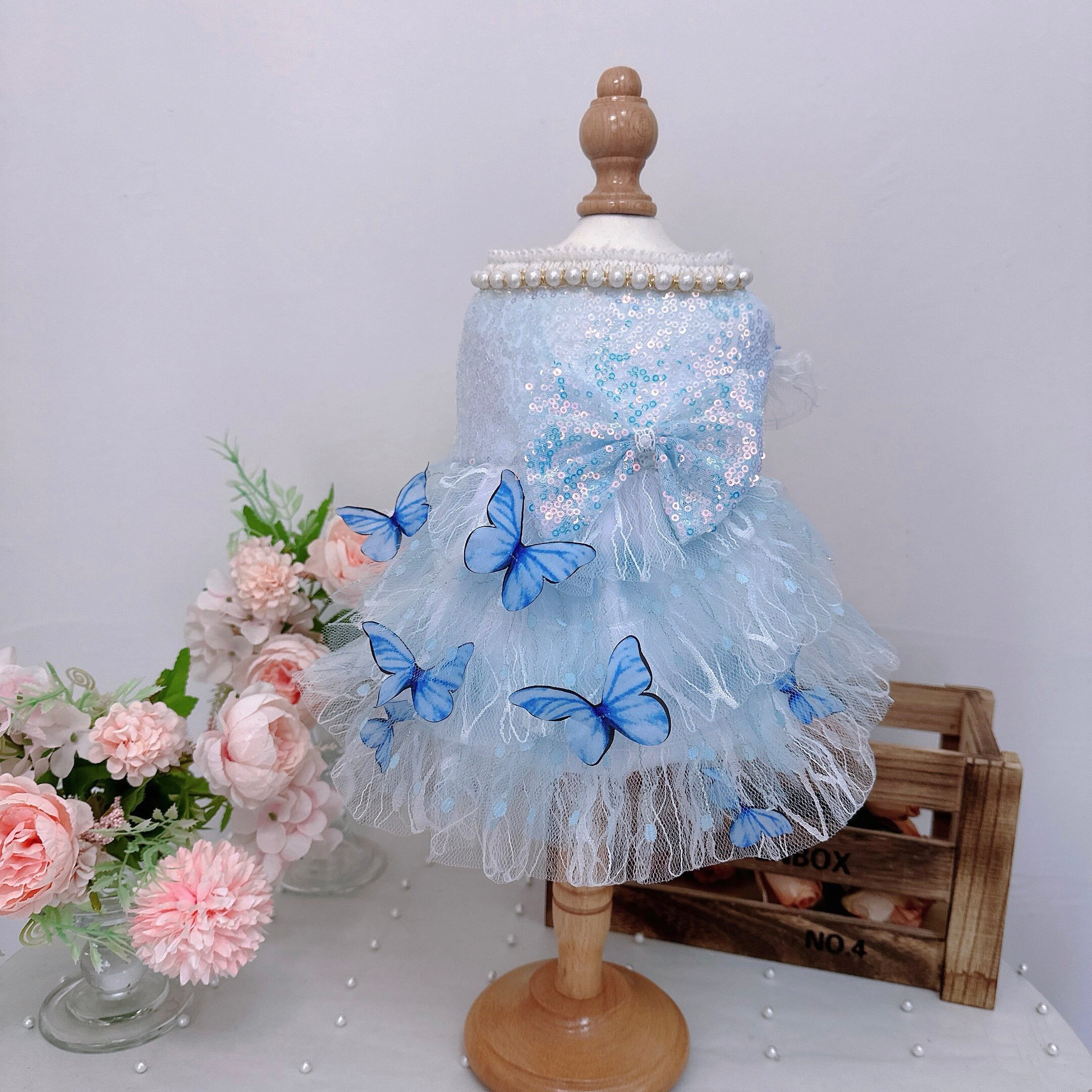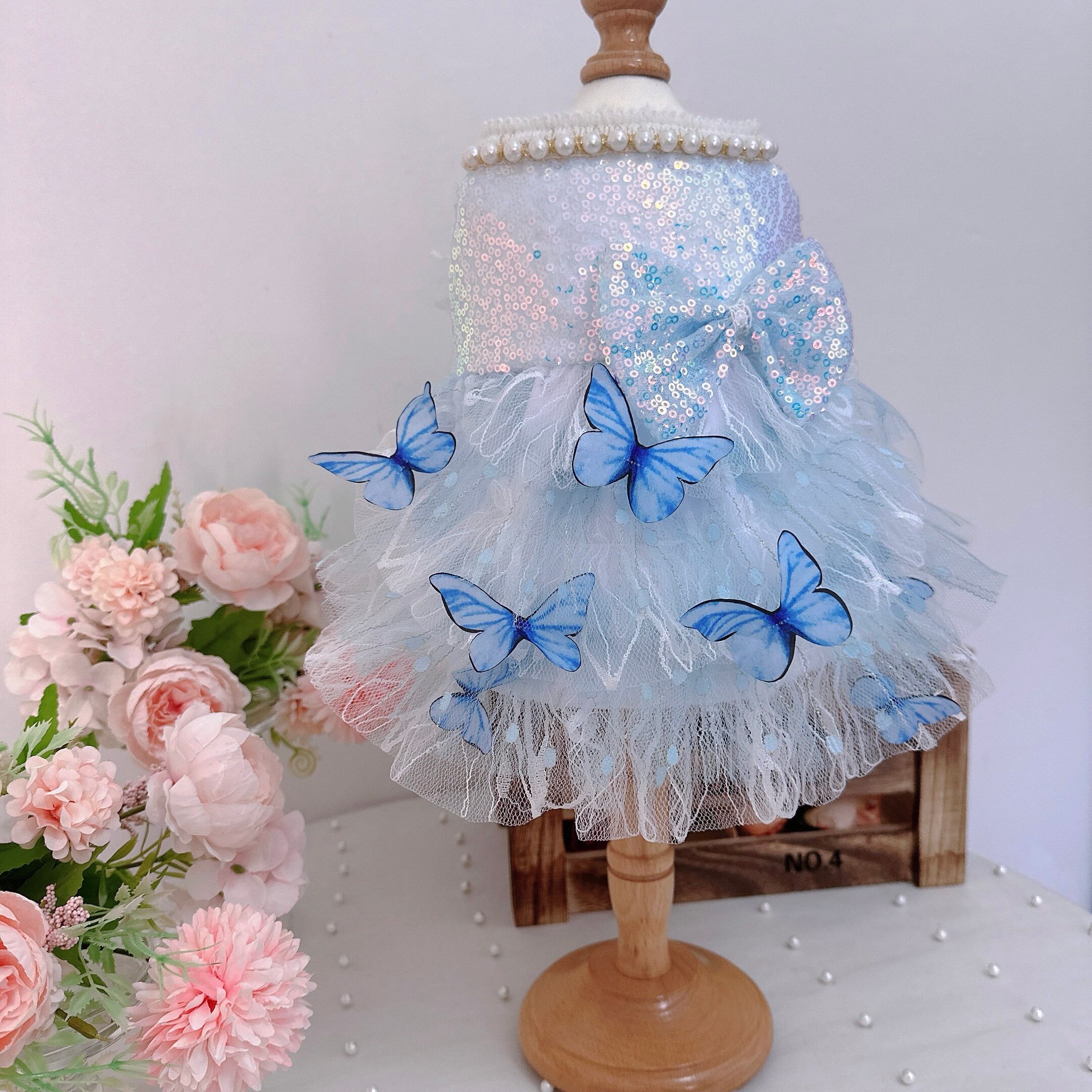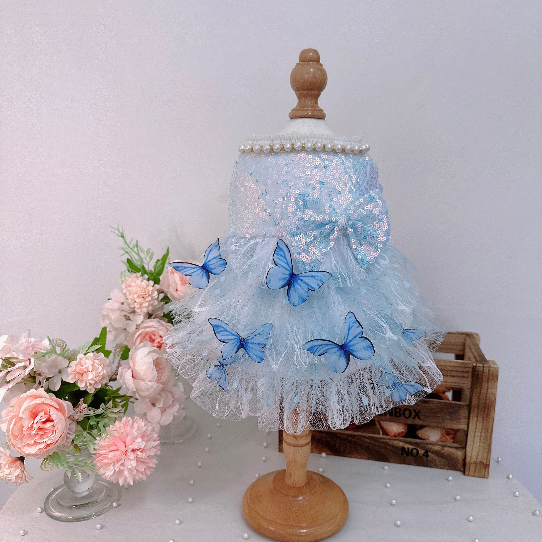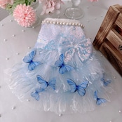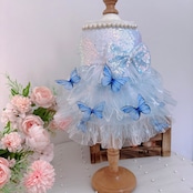 透け感のあるチュールに、鮮やかなブルーの蝶モチーフを散りばめた華やかなワンピース。