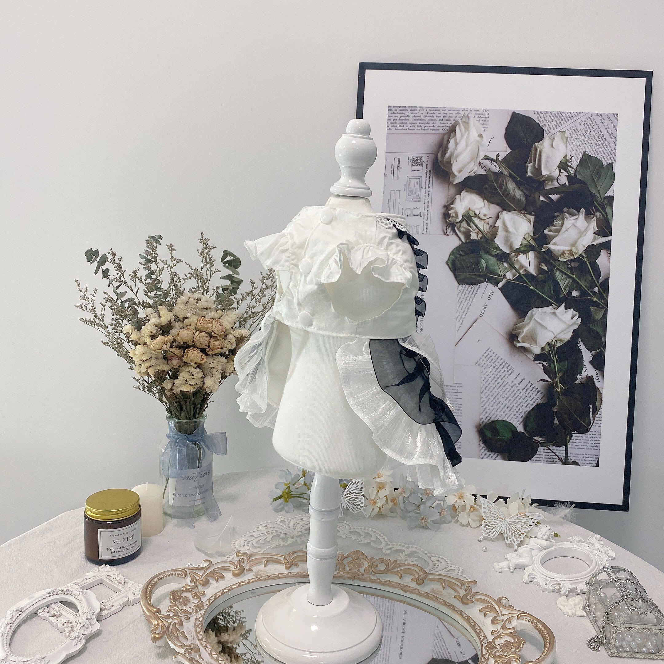 襟元のレースや繊細な装飾が、やさしく上品な雰囲気を演出。