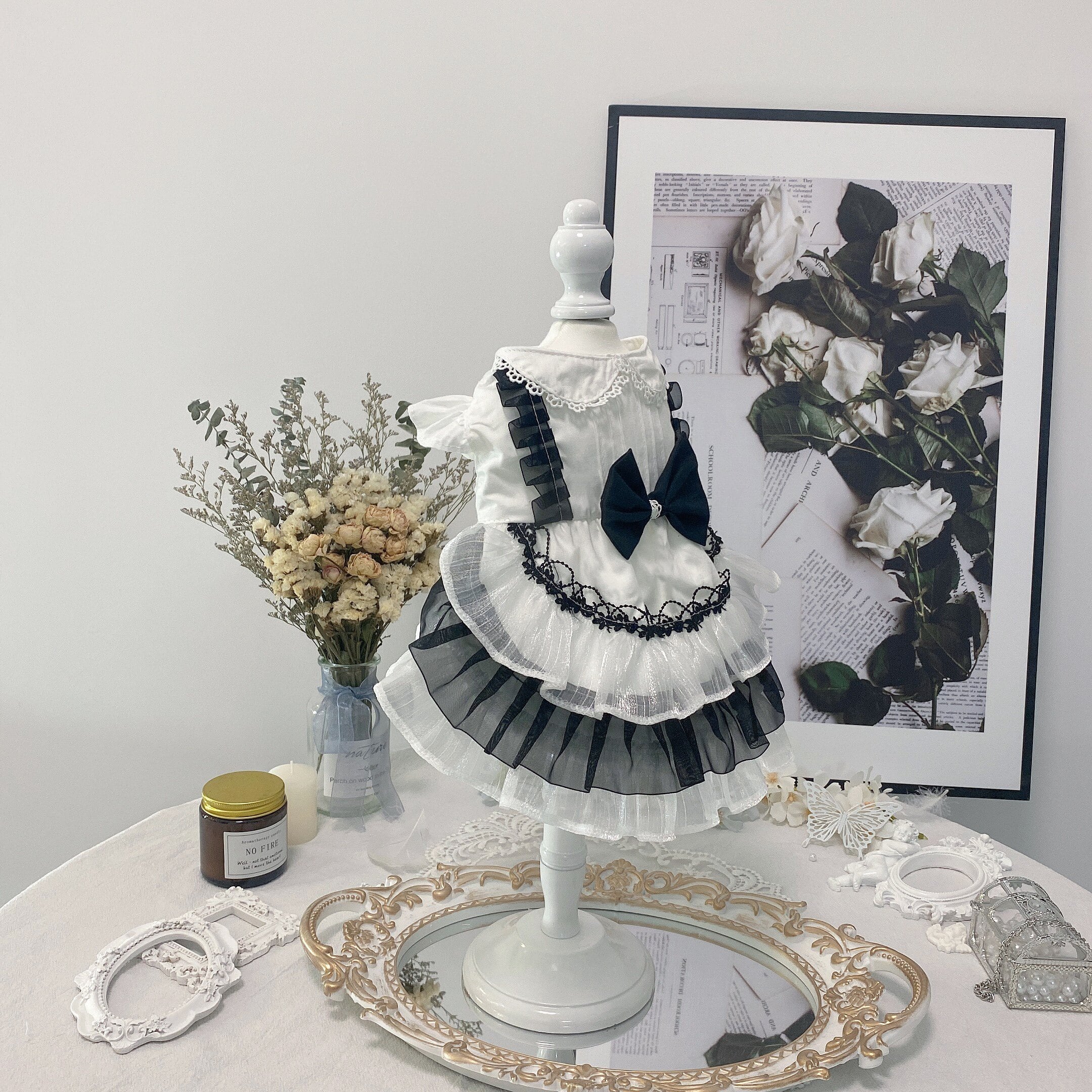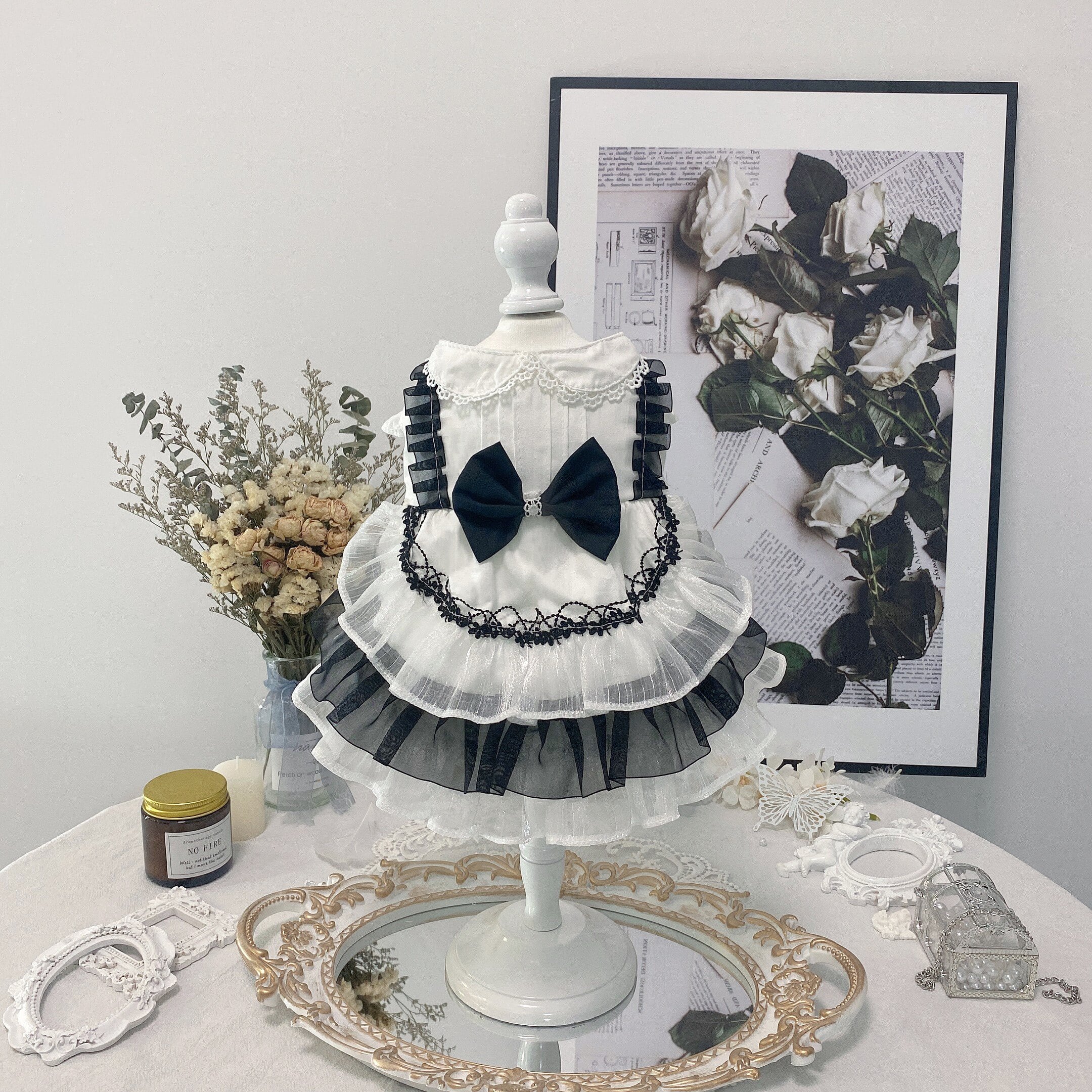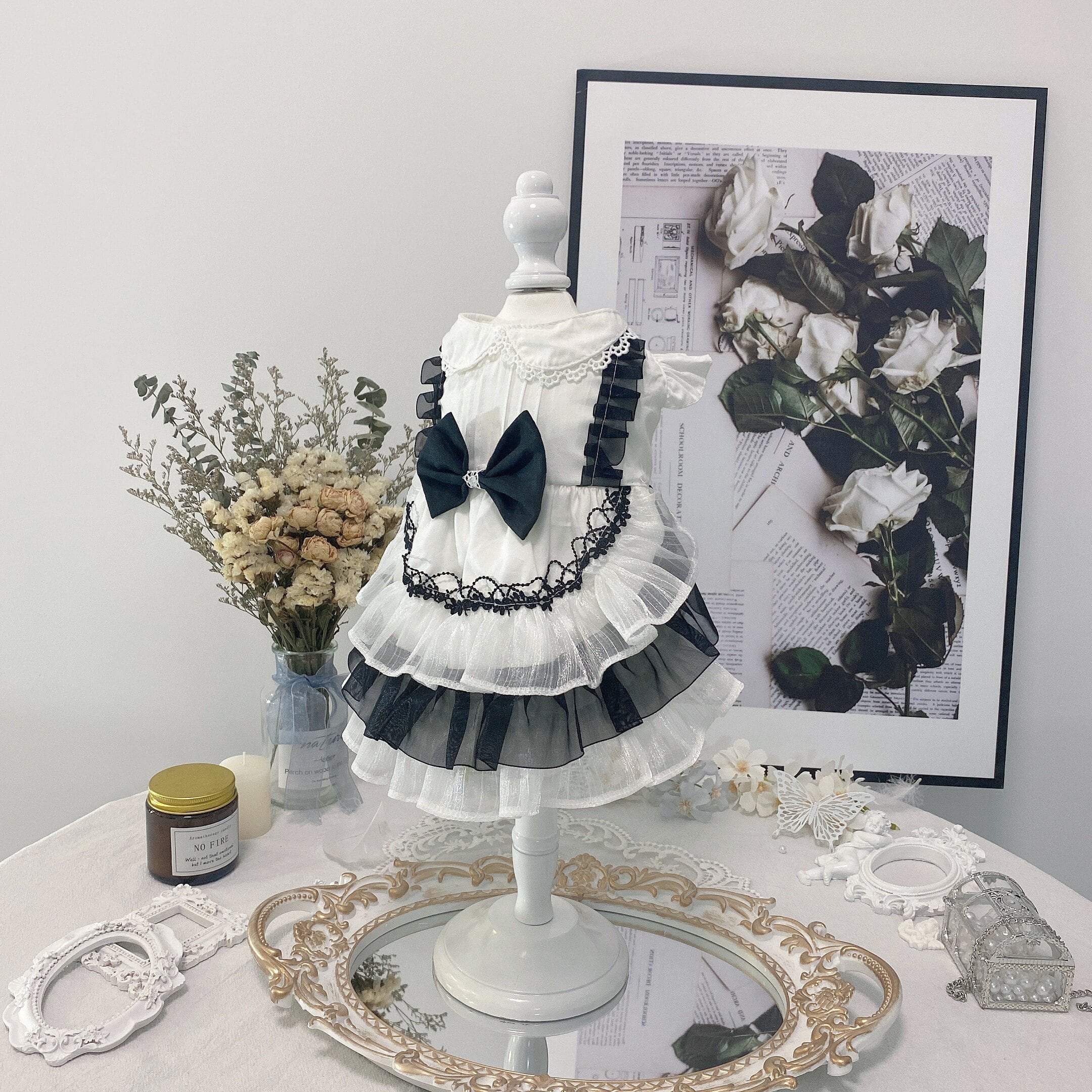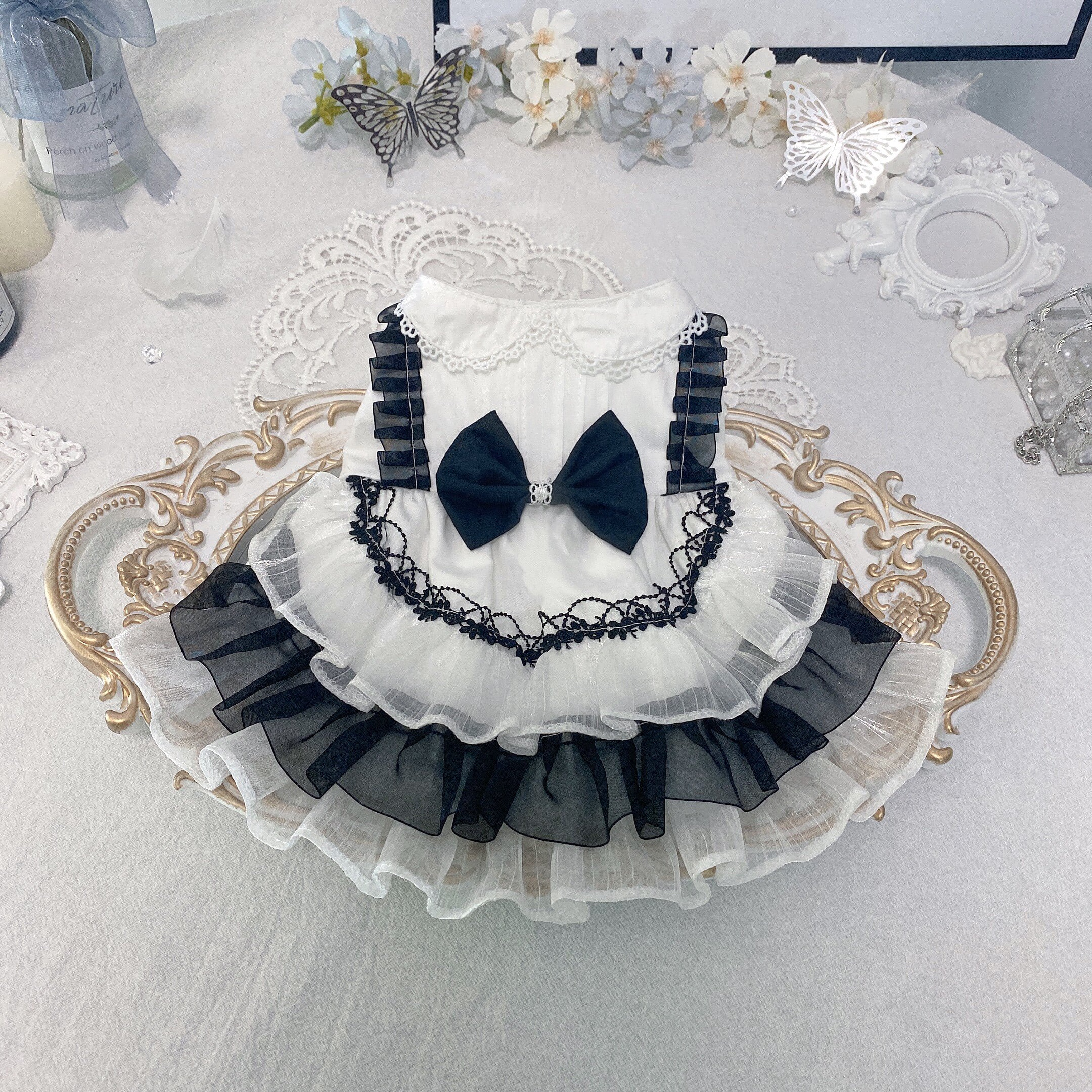 上品なホワイトとブラックを組み合わせた、クラシカルな雰囲気のフリルドレス。