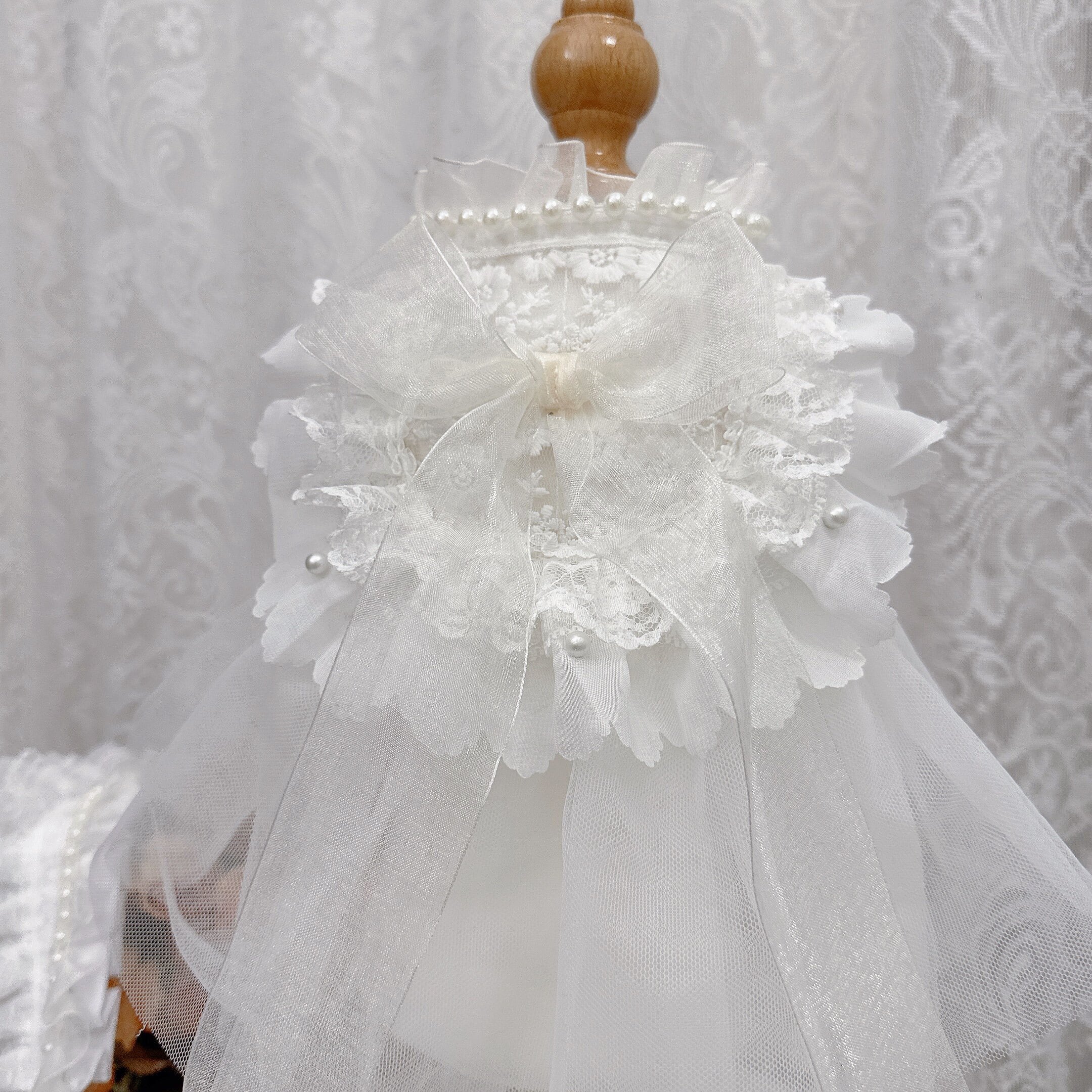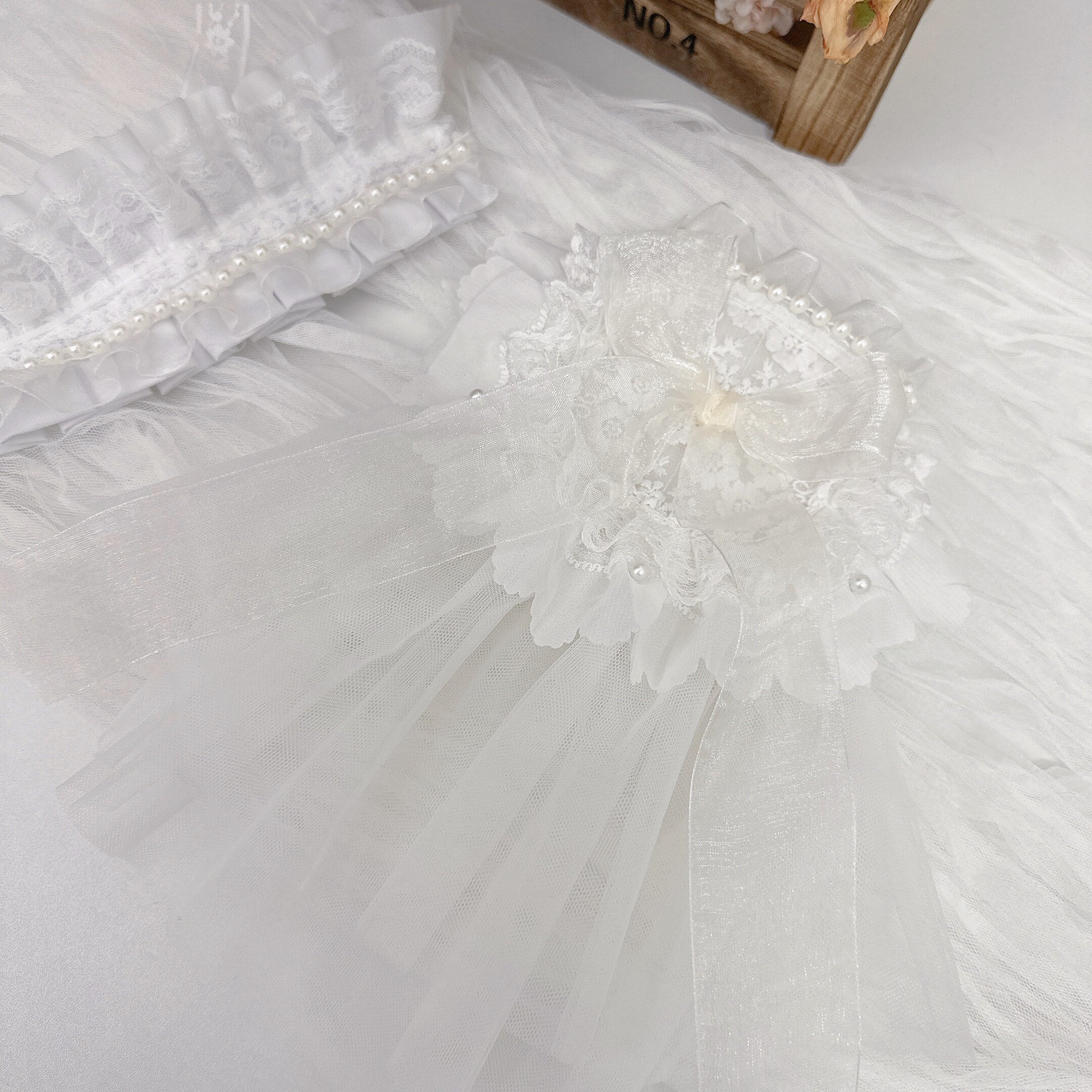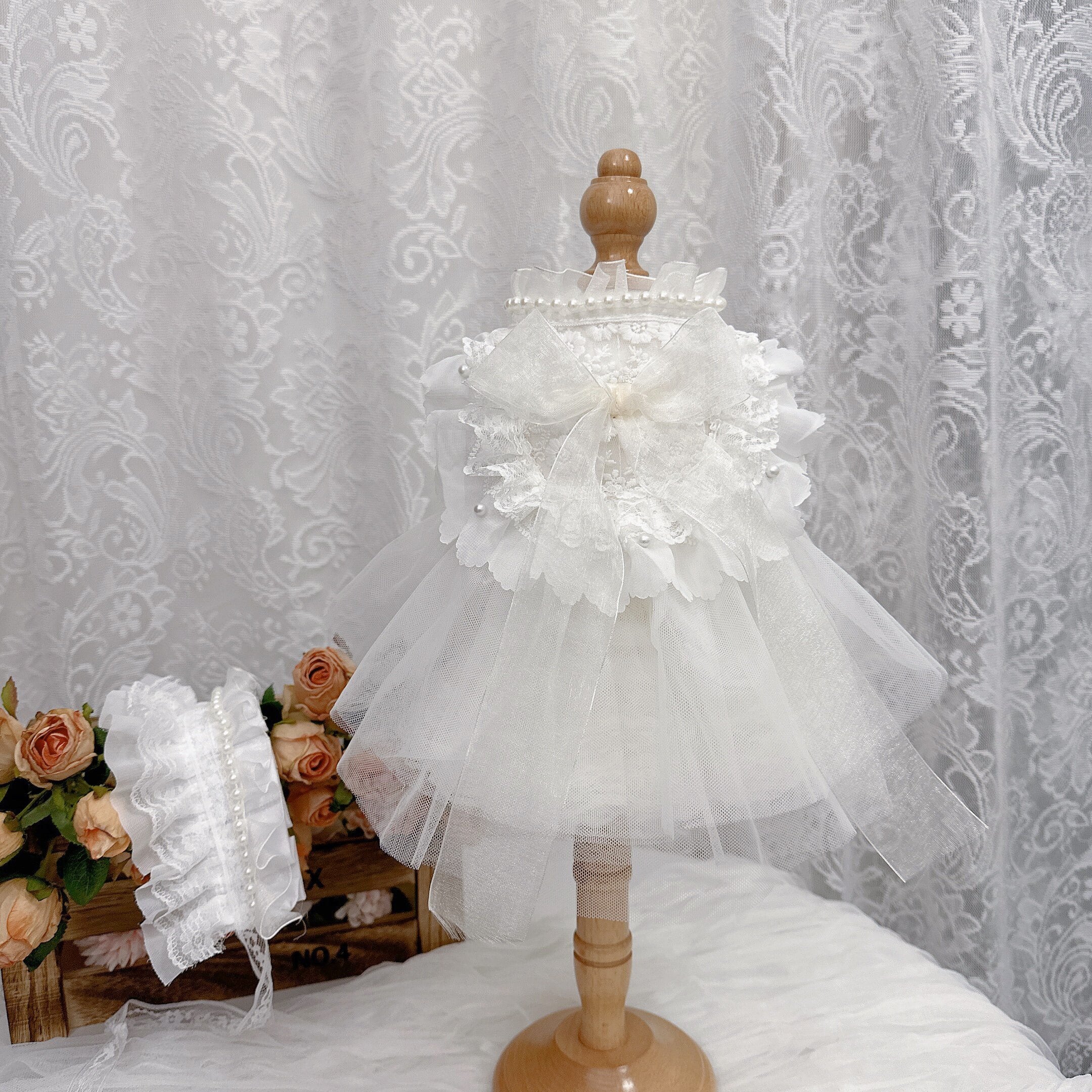 セットのレースボンネットは、パールとフリルをあしらった上品なデザイン。