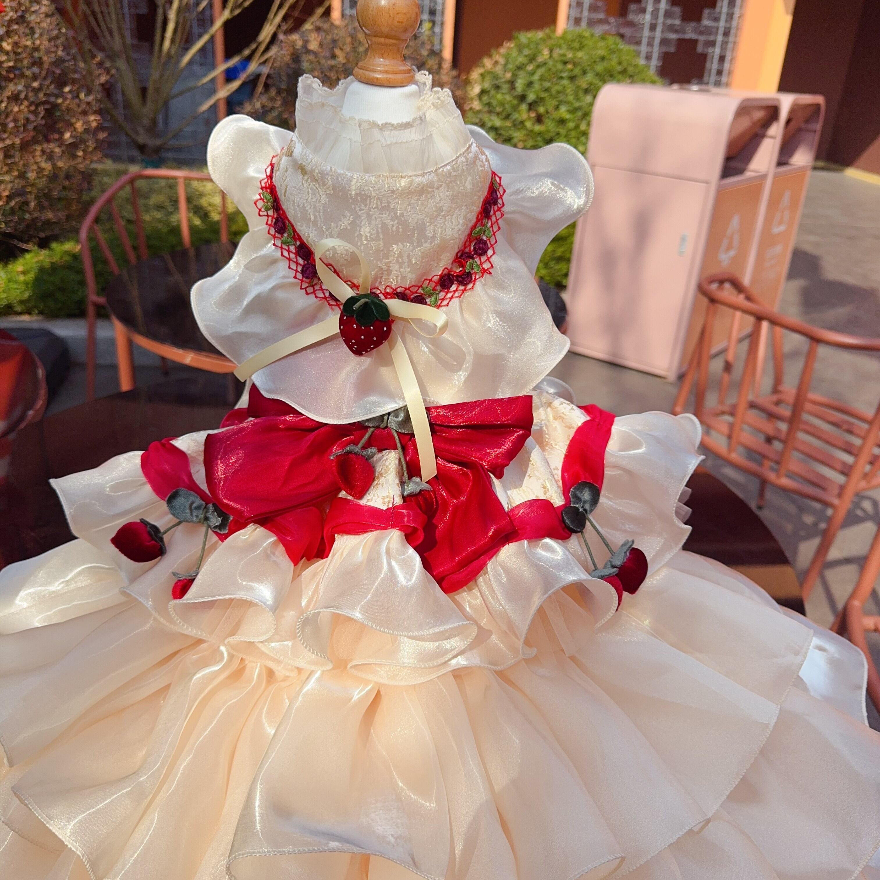 胸元にはストロベリーモチーフとリボンをあしらい、