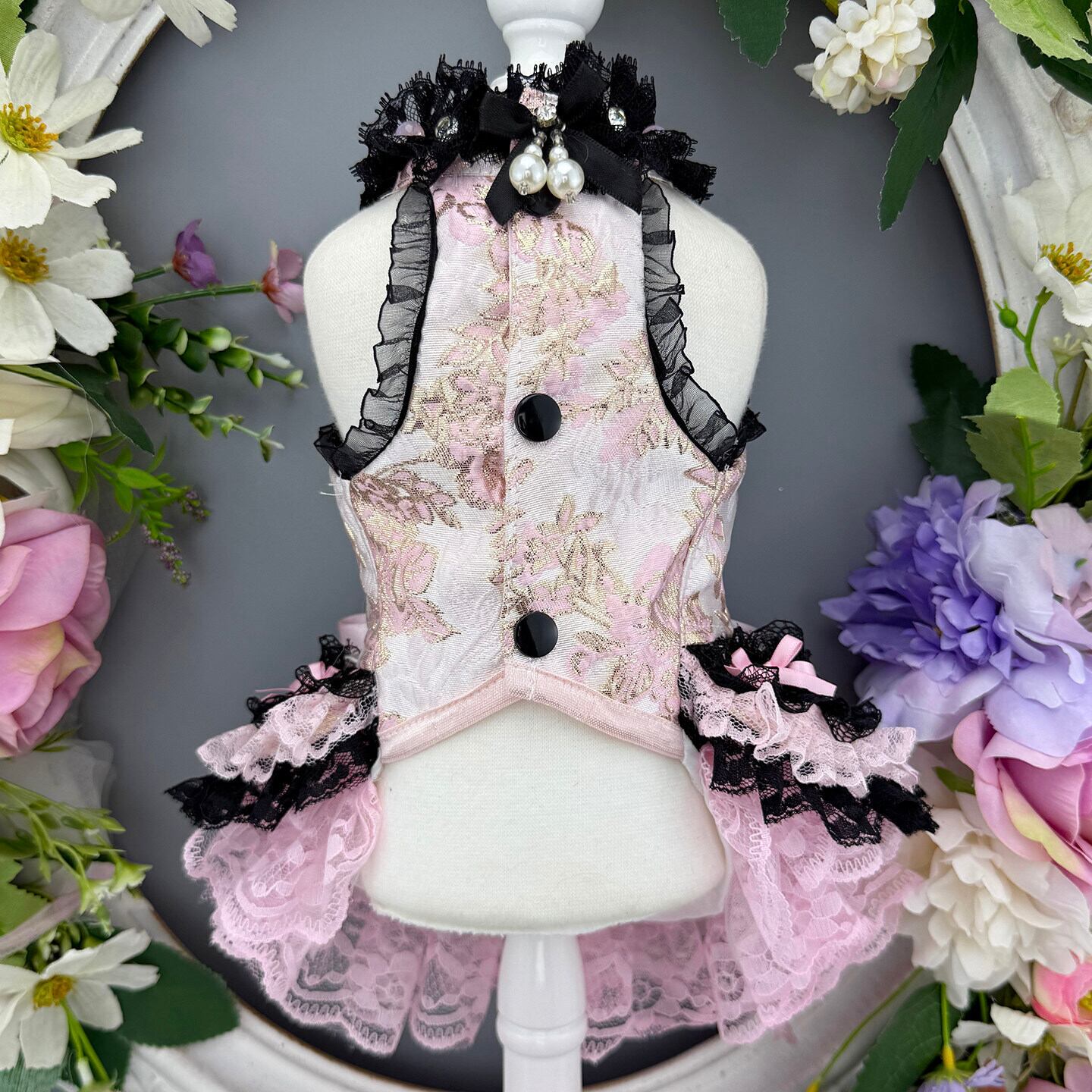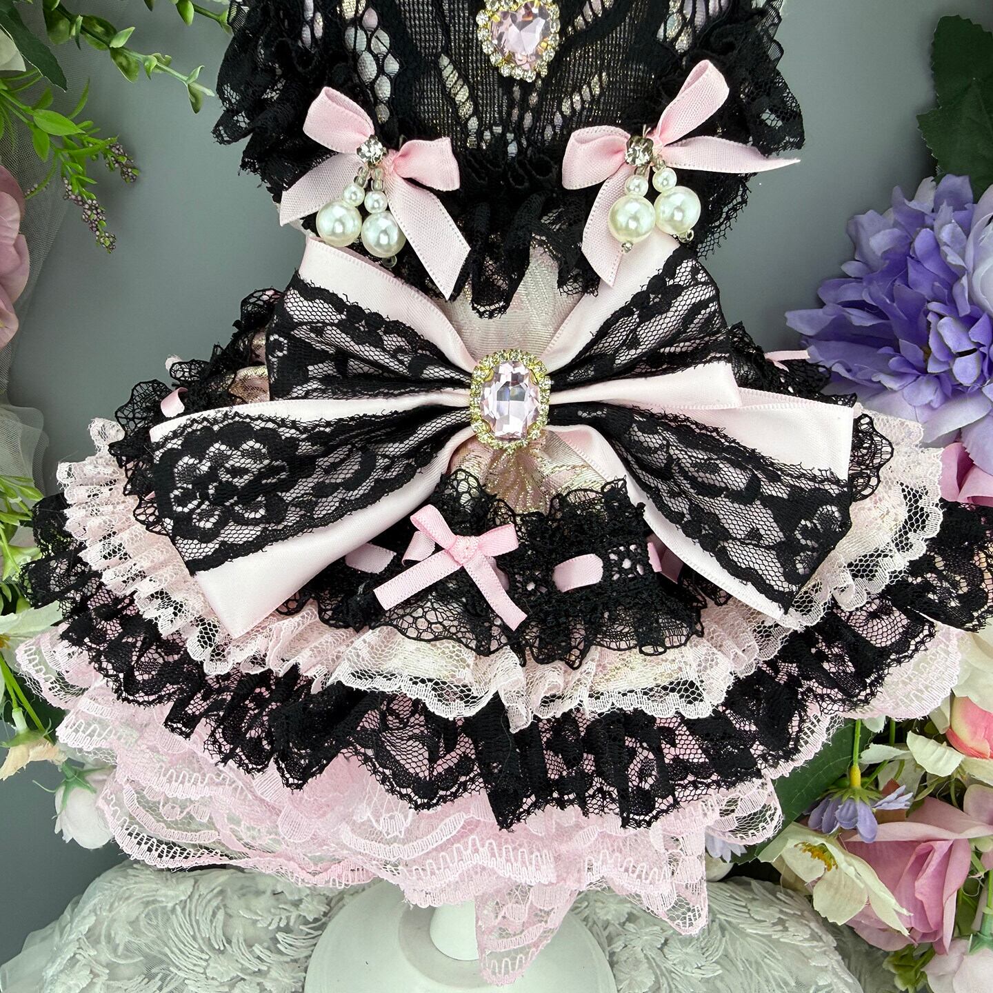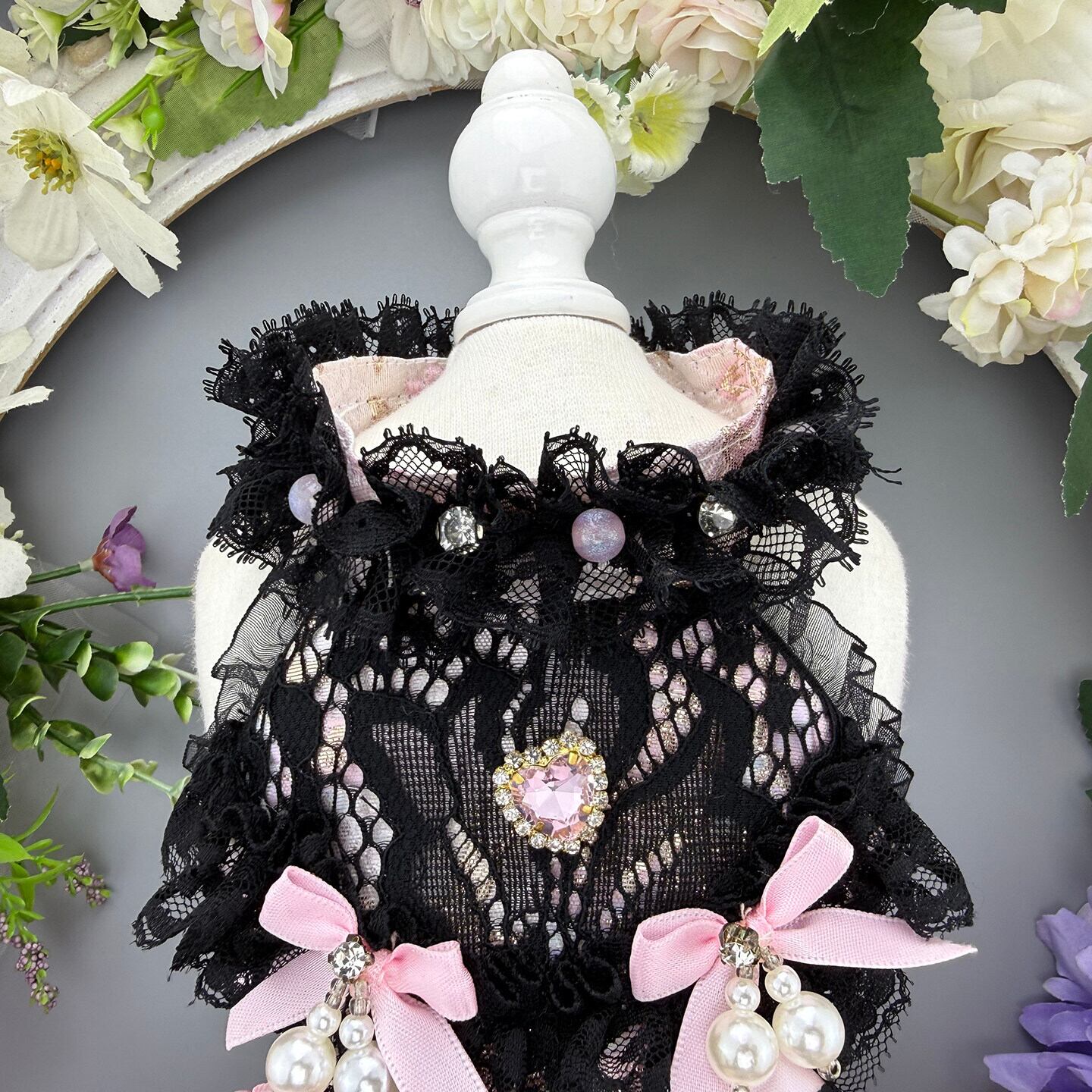 繊細なブラックレースと優しいピンクを重ねた、