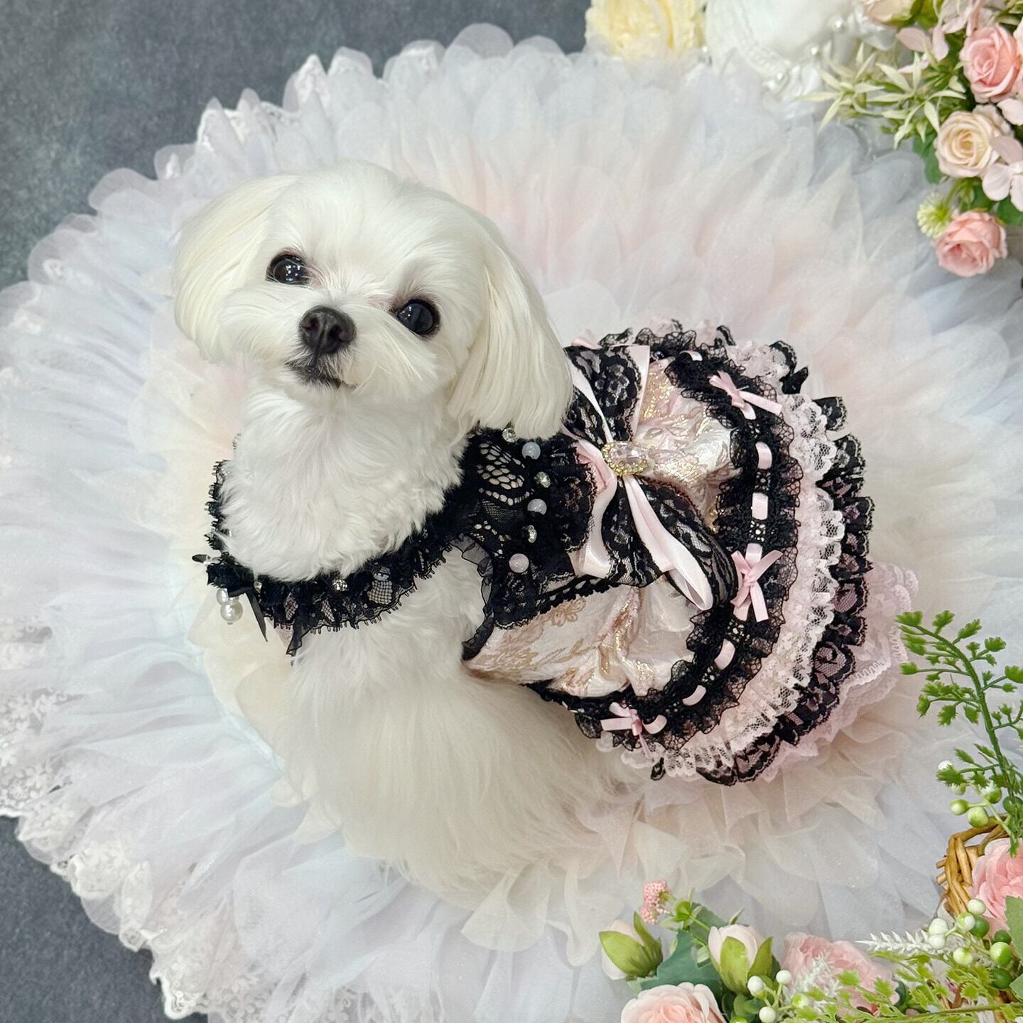 大きなレースリボンとパールチャームがアクセントとなり、