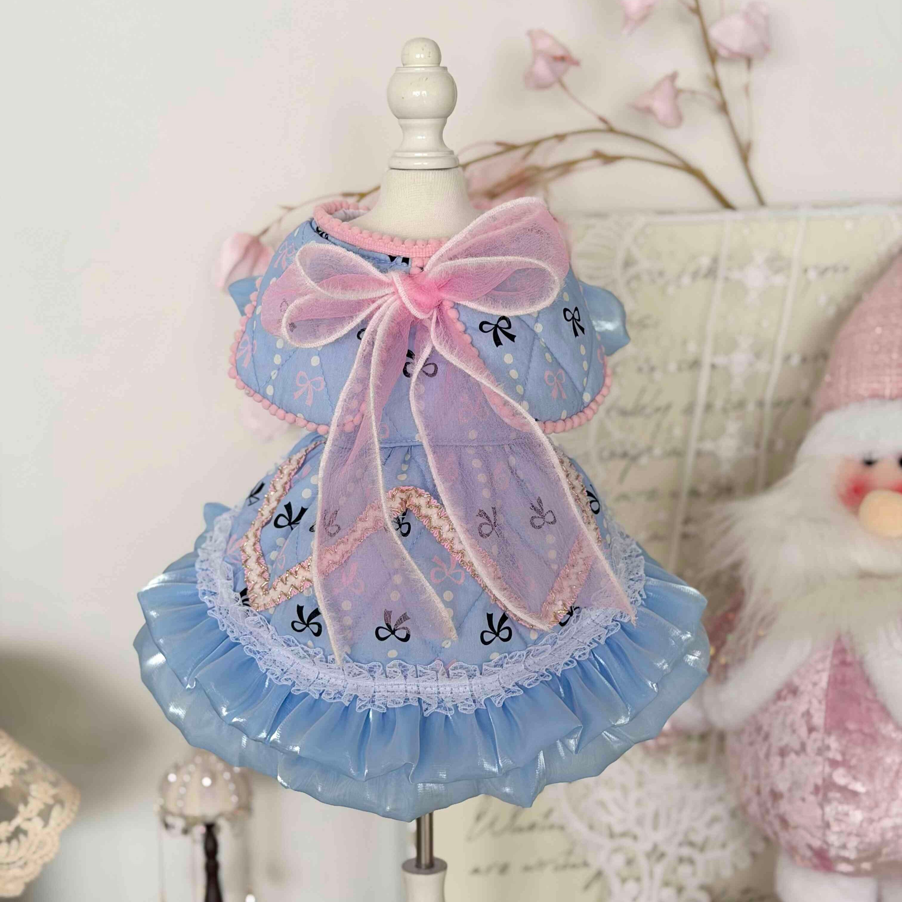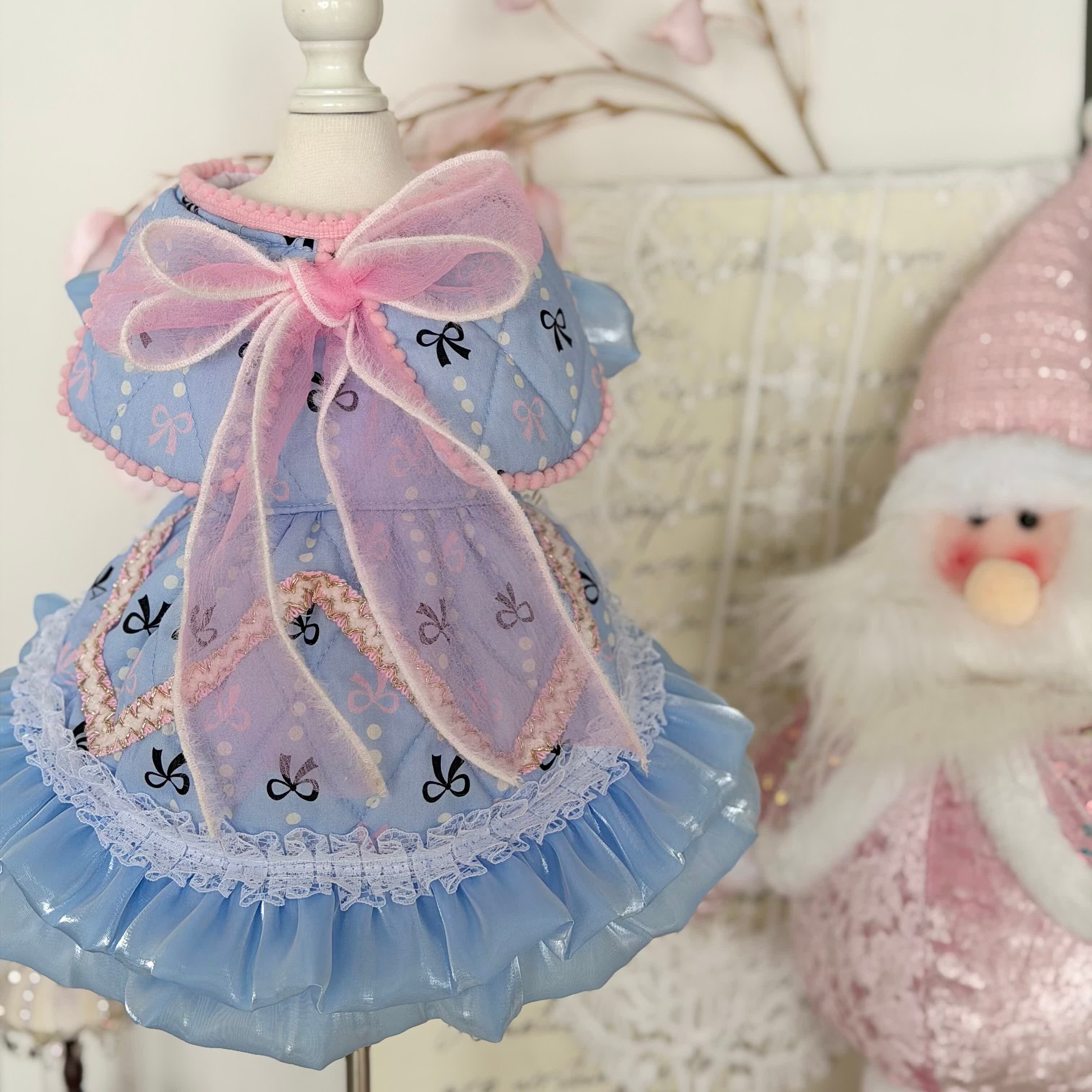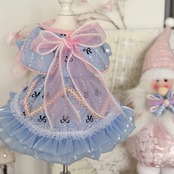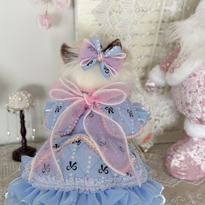 やわらかなブルーにリボン柄をあしらった、優しく甘い雰囲気のワンピース。