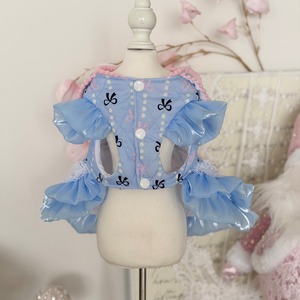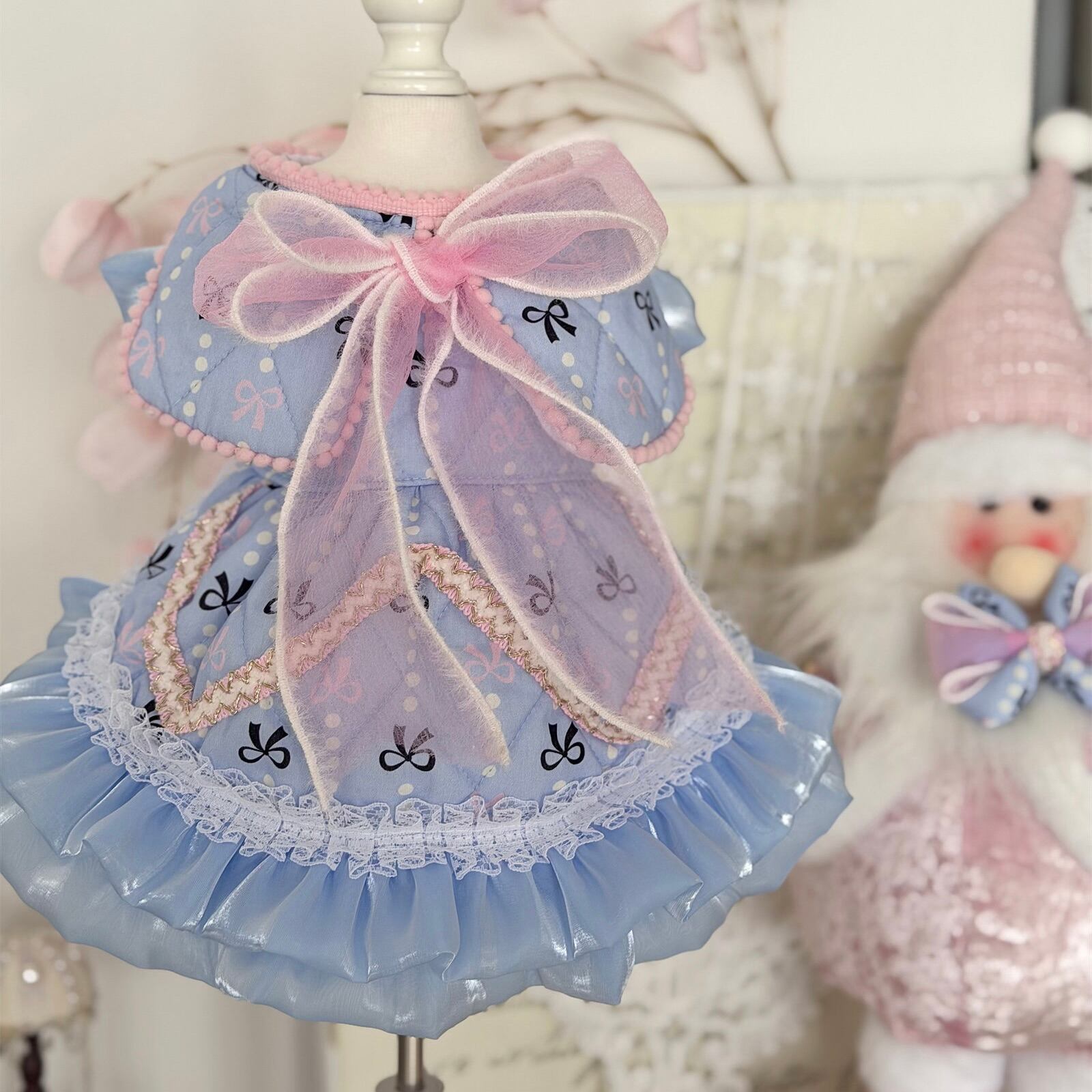 ピンクのトリミングとレース、透け感のあるフリルスカートが軽やかで華やかな印象に仕上げます。