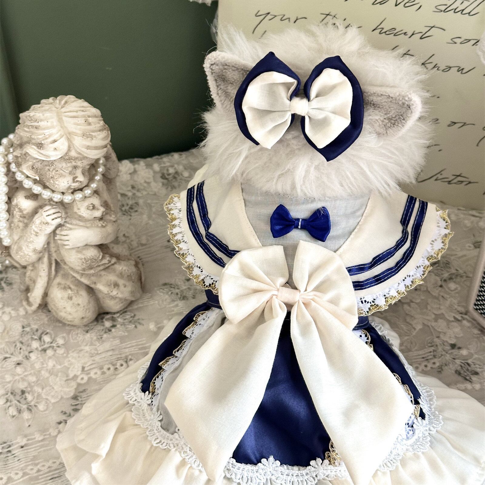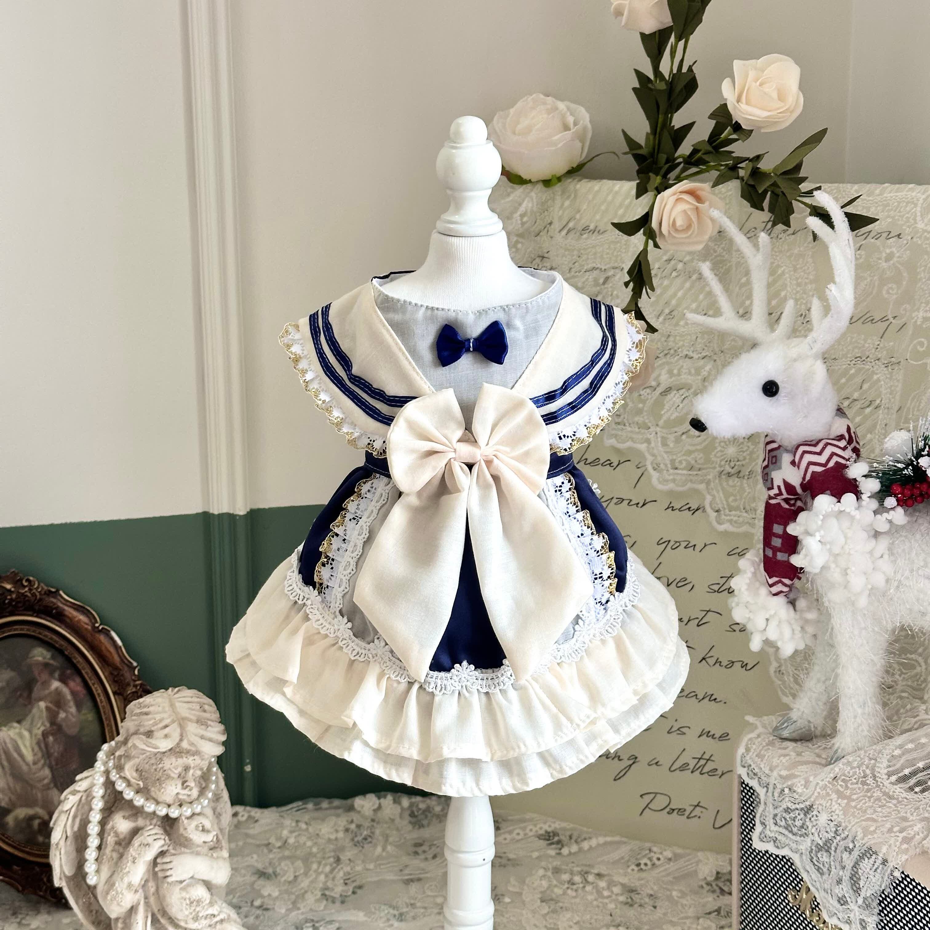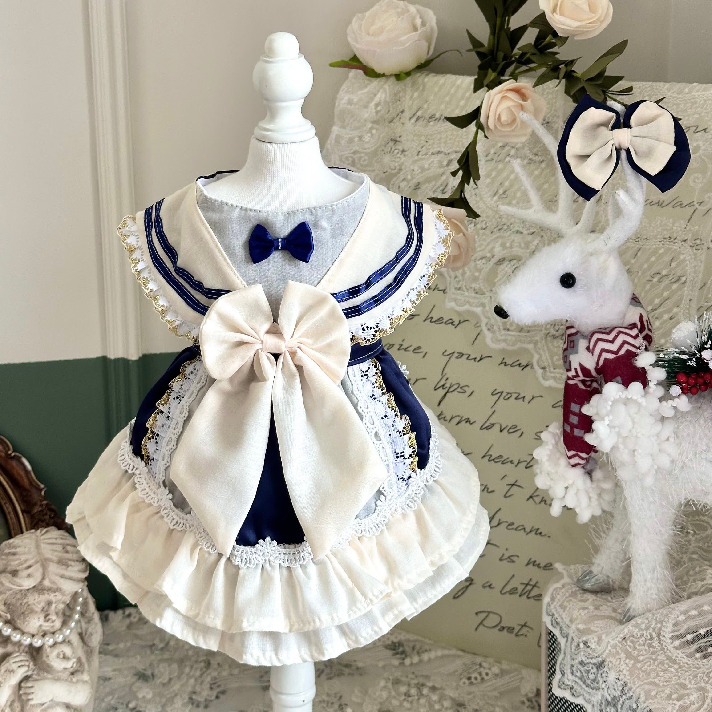 ネイビーとアイボリーの上品な配色が印象的な、クラシカルなセーラーデザインのワンピース。