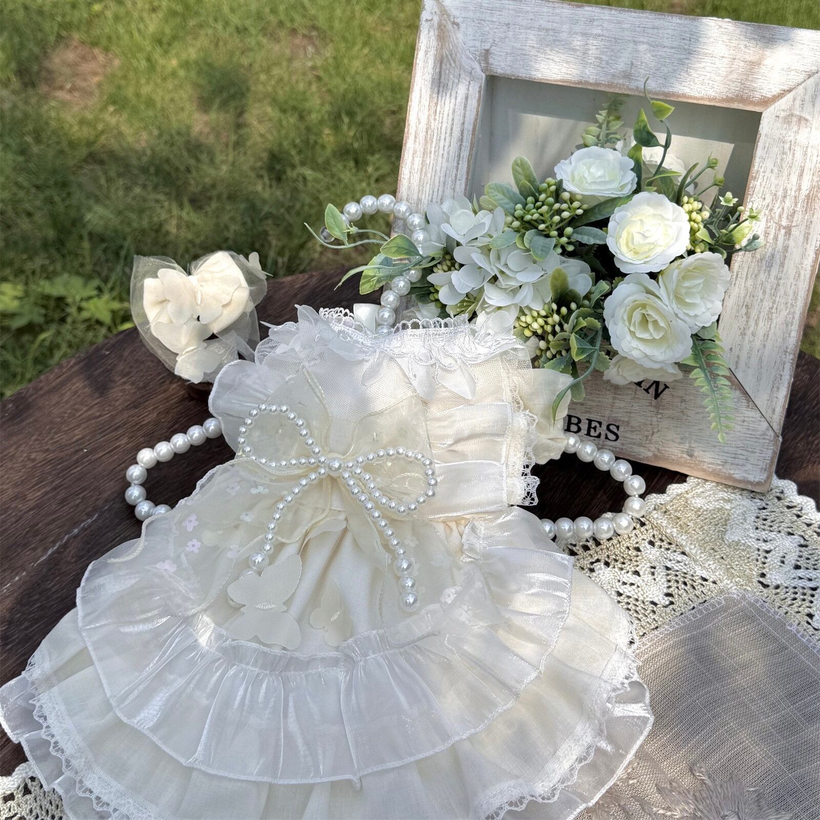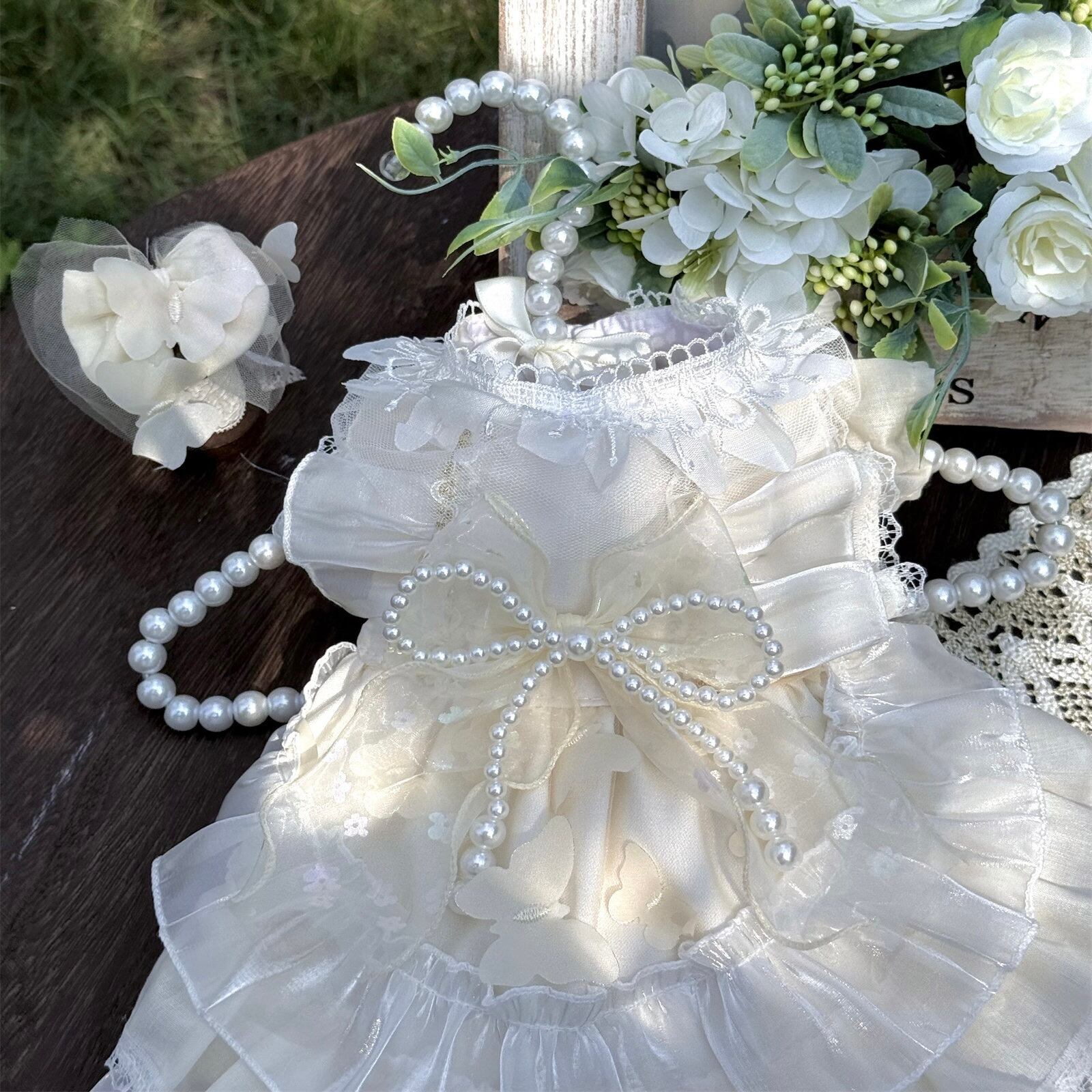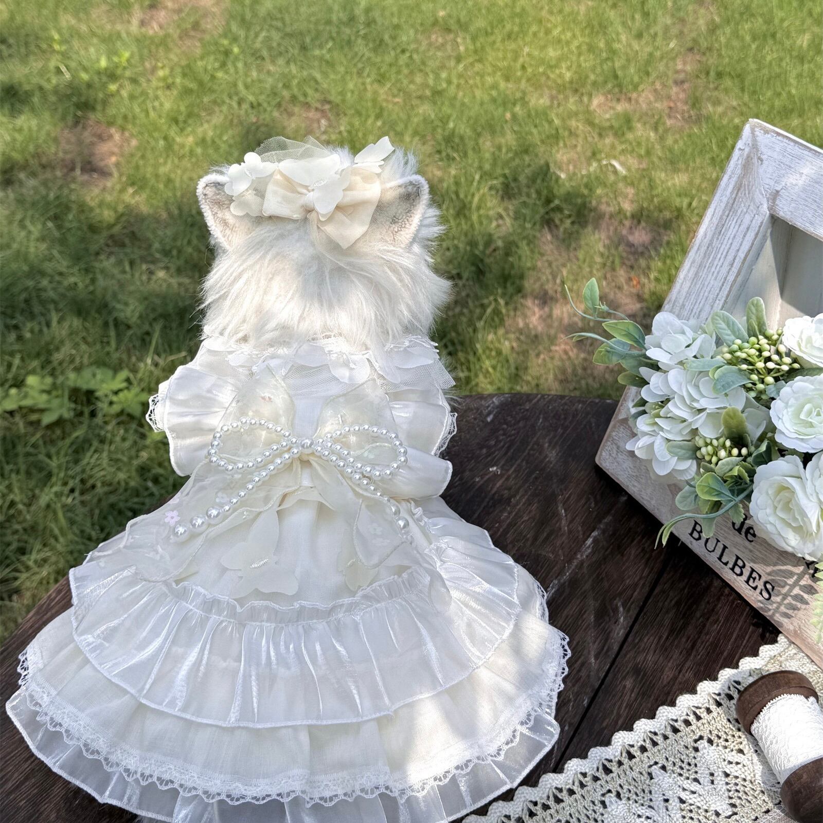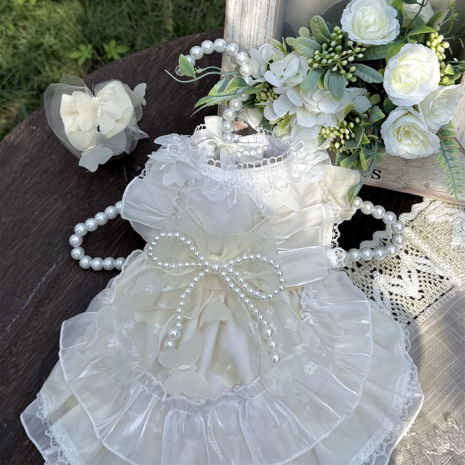繊細なレースと上品なパールリボンが、愛犬を可憐なプリンセスに包み込みます。