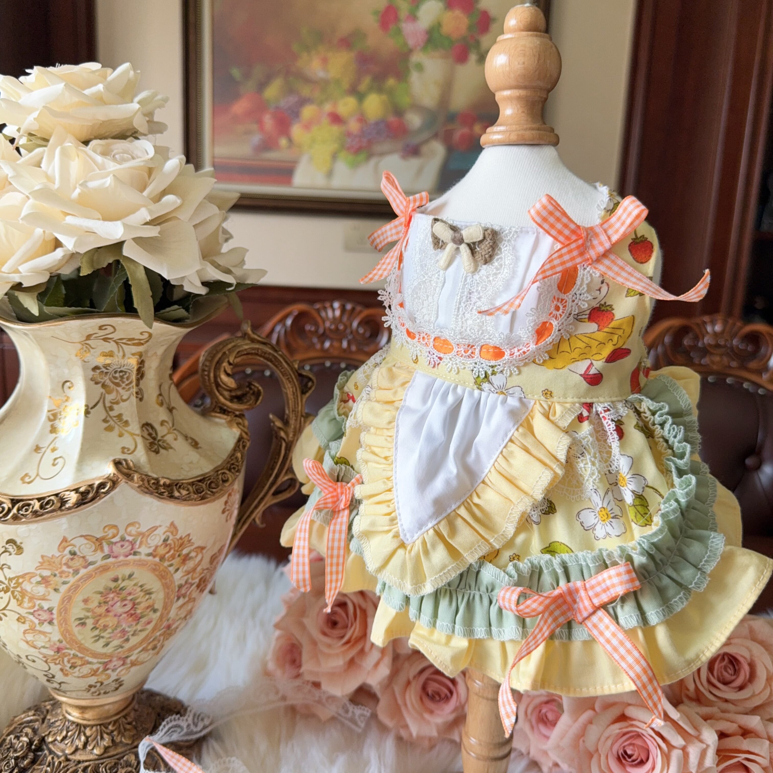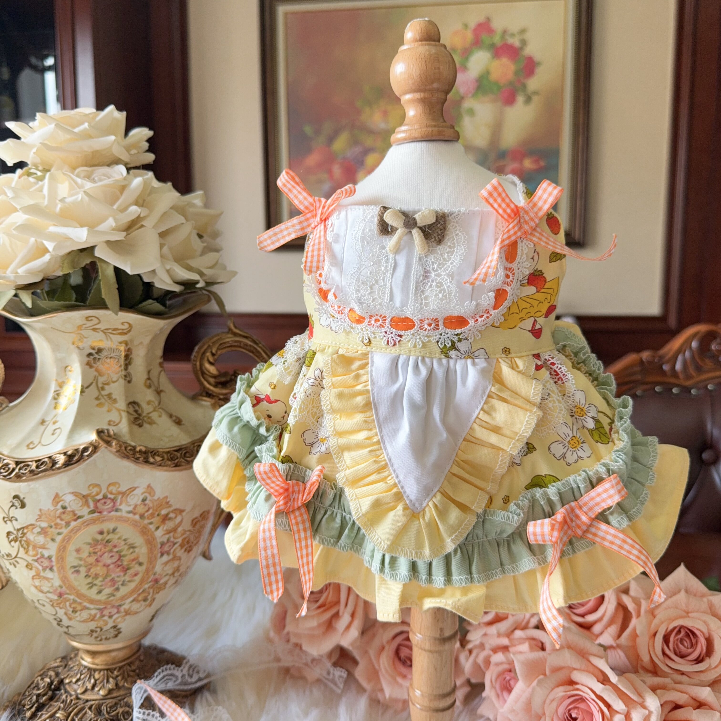 フルーツ柄とギンガムリボンが愛らしい、ガーデン風プリンセスドレス。
