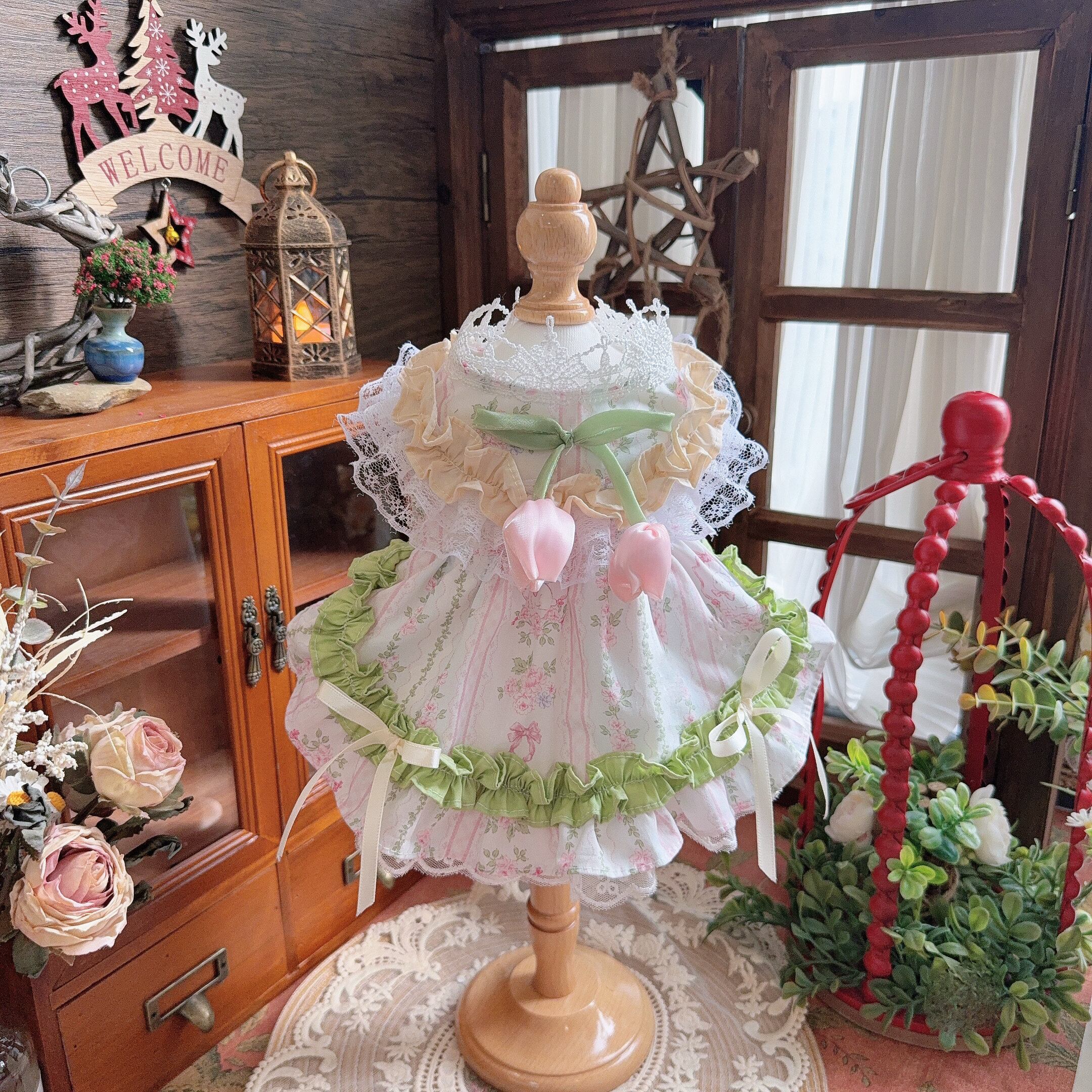ふんわり花柄にチューリップモチーフとリボンを添えた、甘くやさしい一着