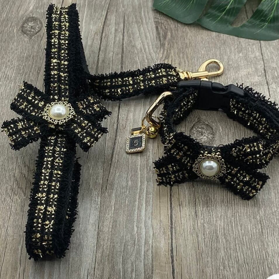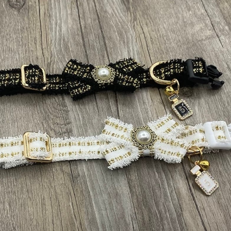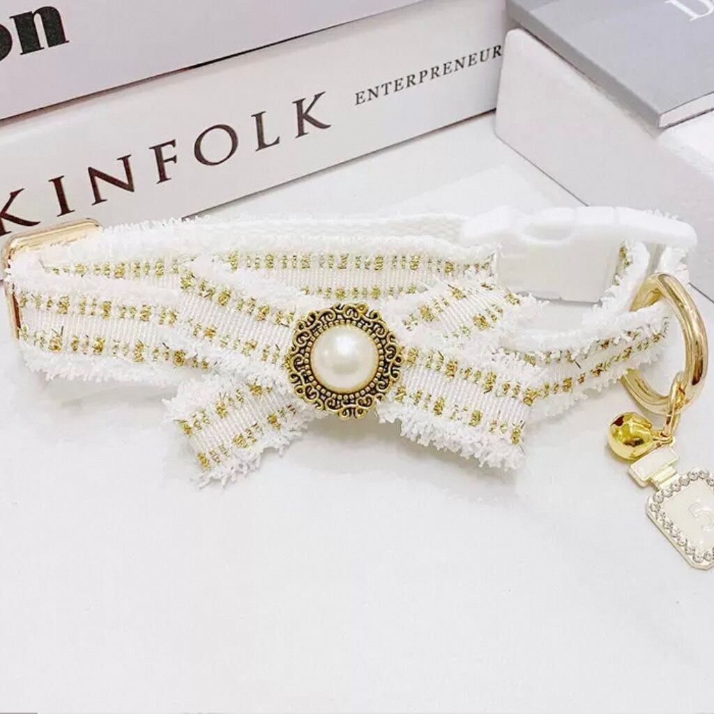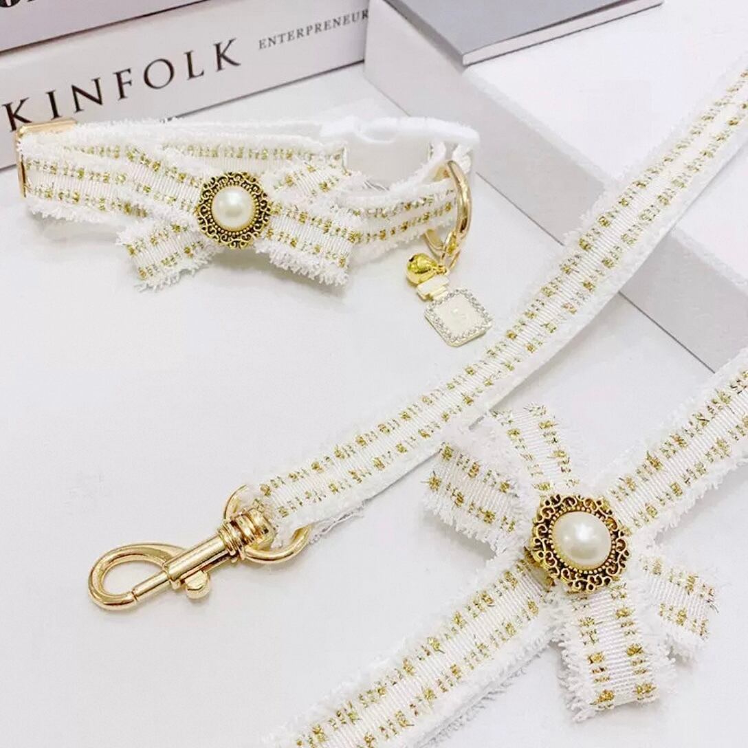 ゴールドのラインがアクセントになった、白を基調としたリードと首輪。愛らしいリボンモチーフと、Dカン付きの機能的なデザインが魅力です。お散歩が楽しくなる、おしゃれなアイテムです。