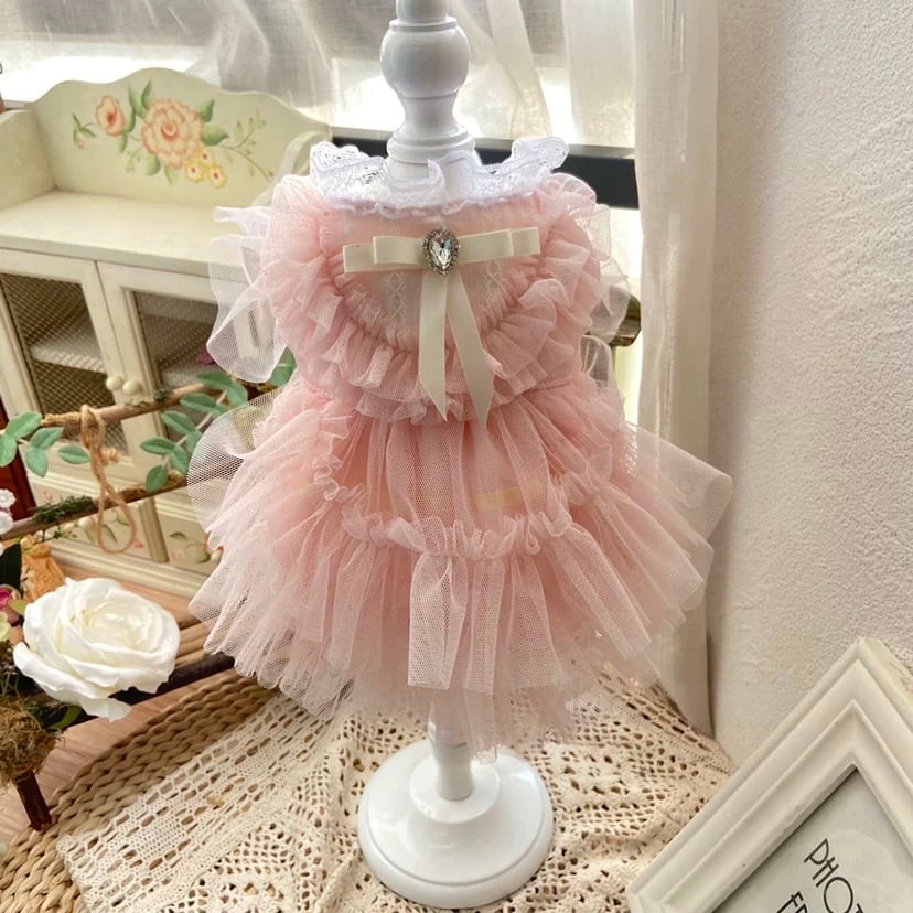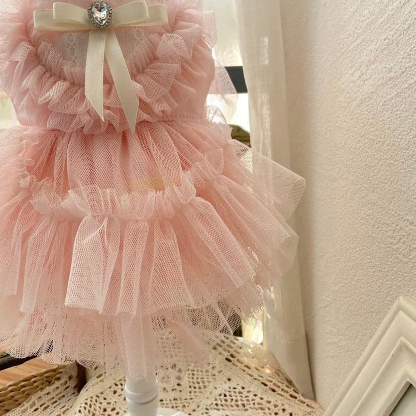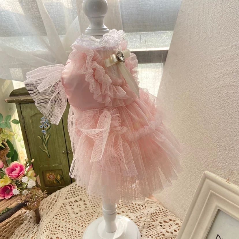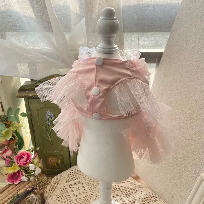 ティアードスタイルが、愛犬の動きに合わせて美しく揺れ動き、華やかでロマンチックな雰囲気を醸し出します。