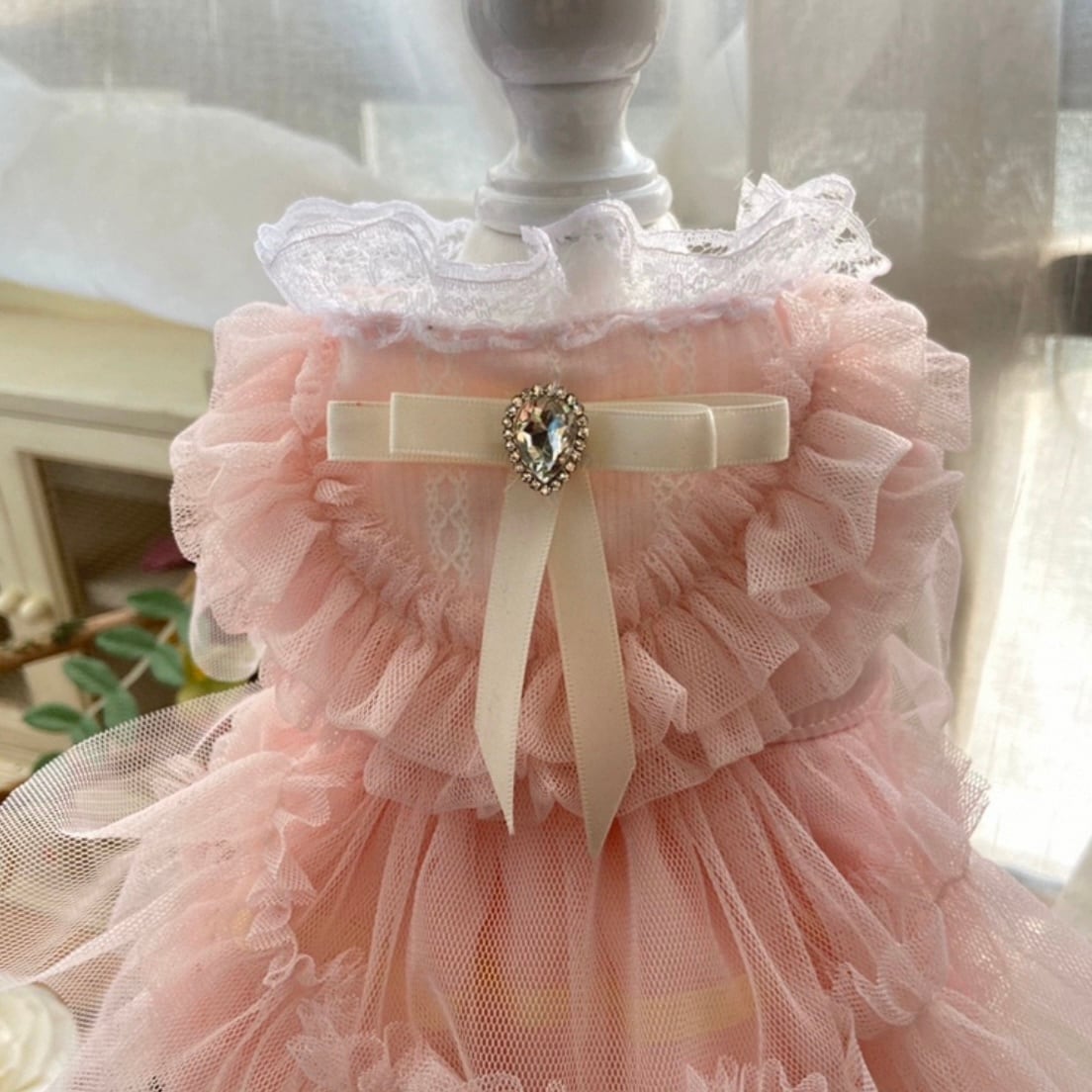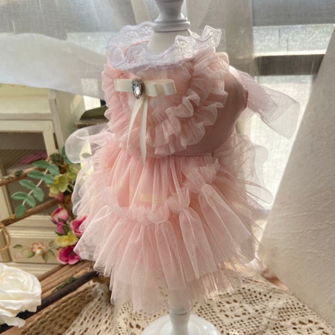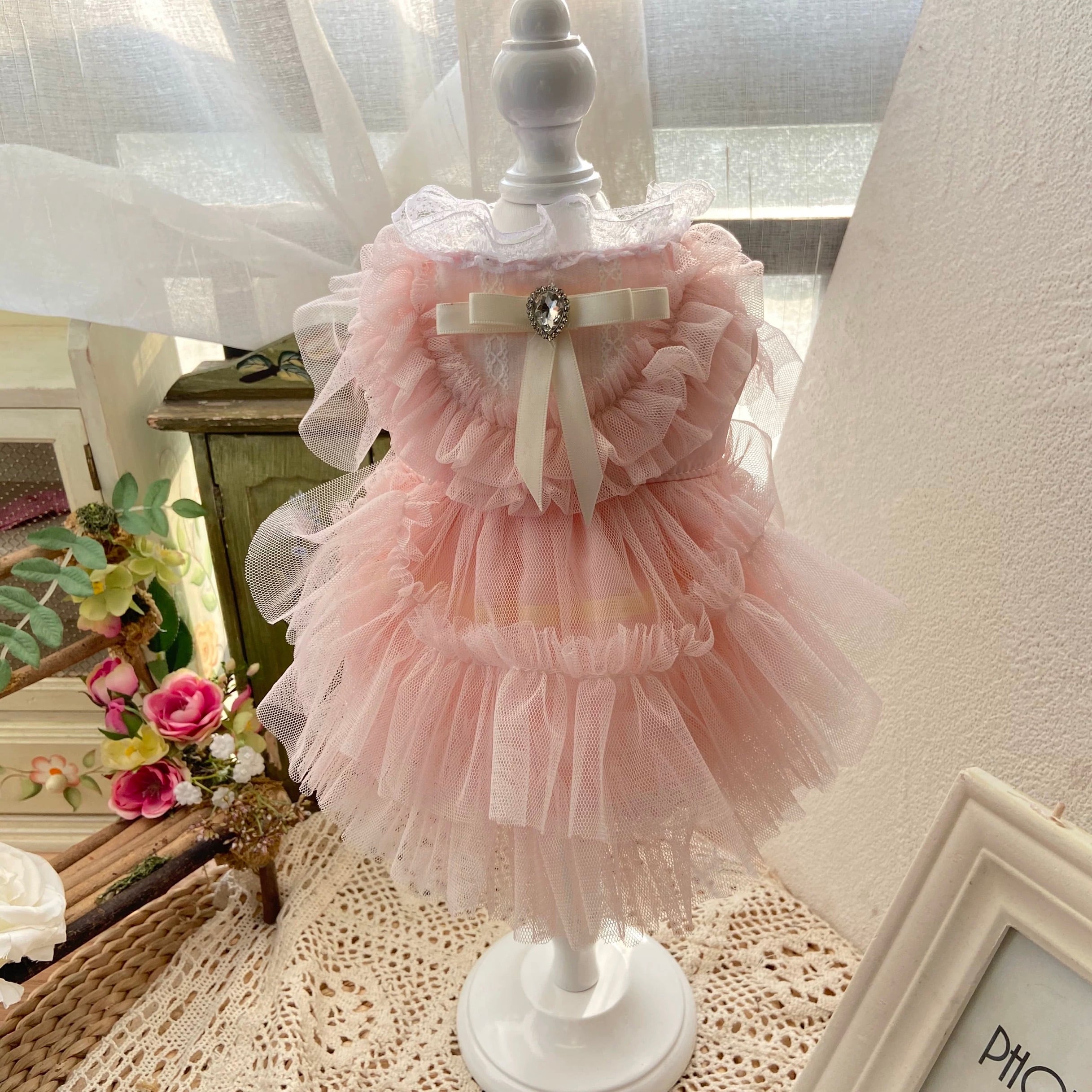 ティアードスタイルが、愛犬の動きに合わせて美しく揺れ動き、華やかでロマンチックな雰囲気を醸し出します。