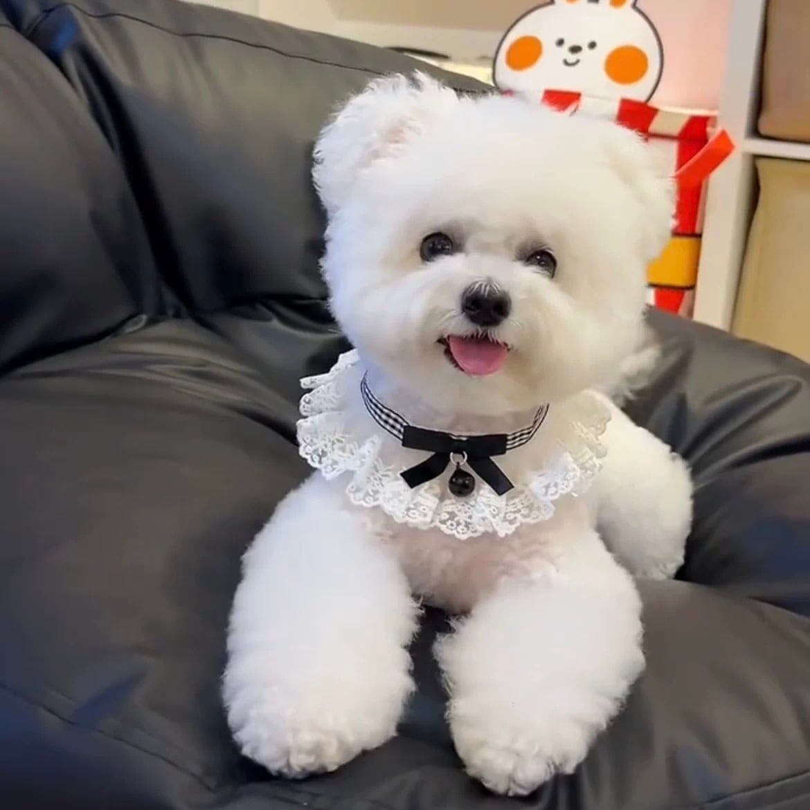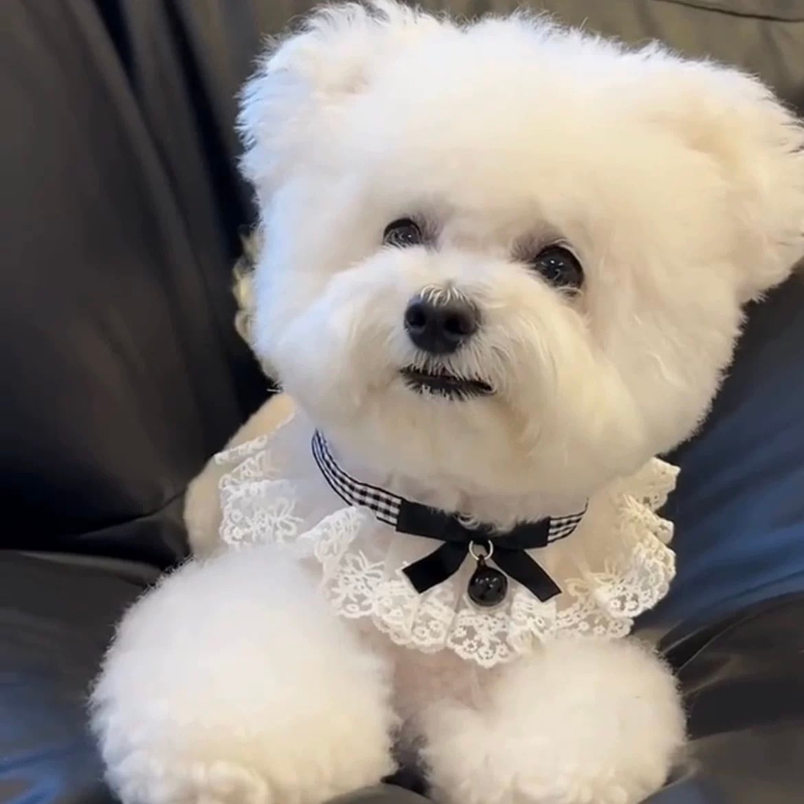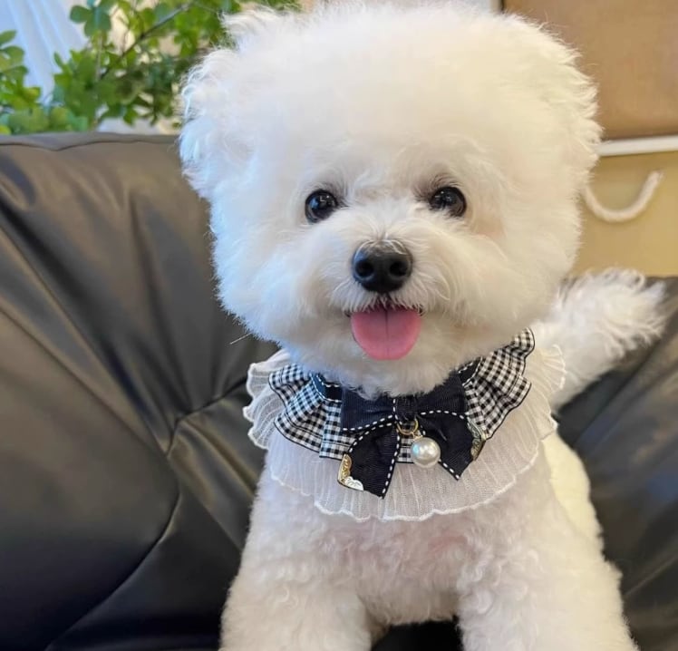 ギンガムチェックの可愛らしいリボンと、繊細なフリル、そして上品なチャームが、ワンちゃんの魅力を最大限に引き出します。