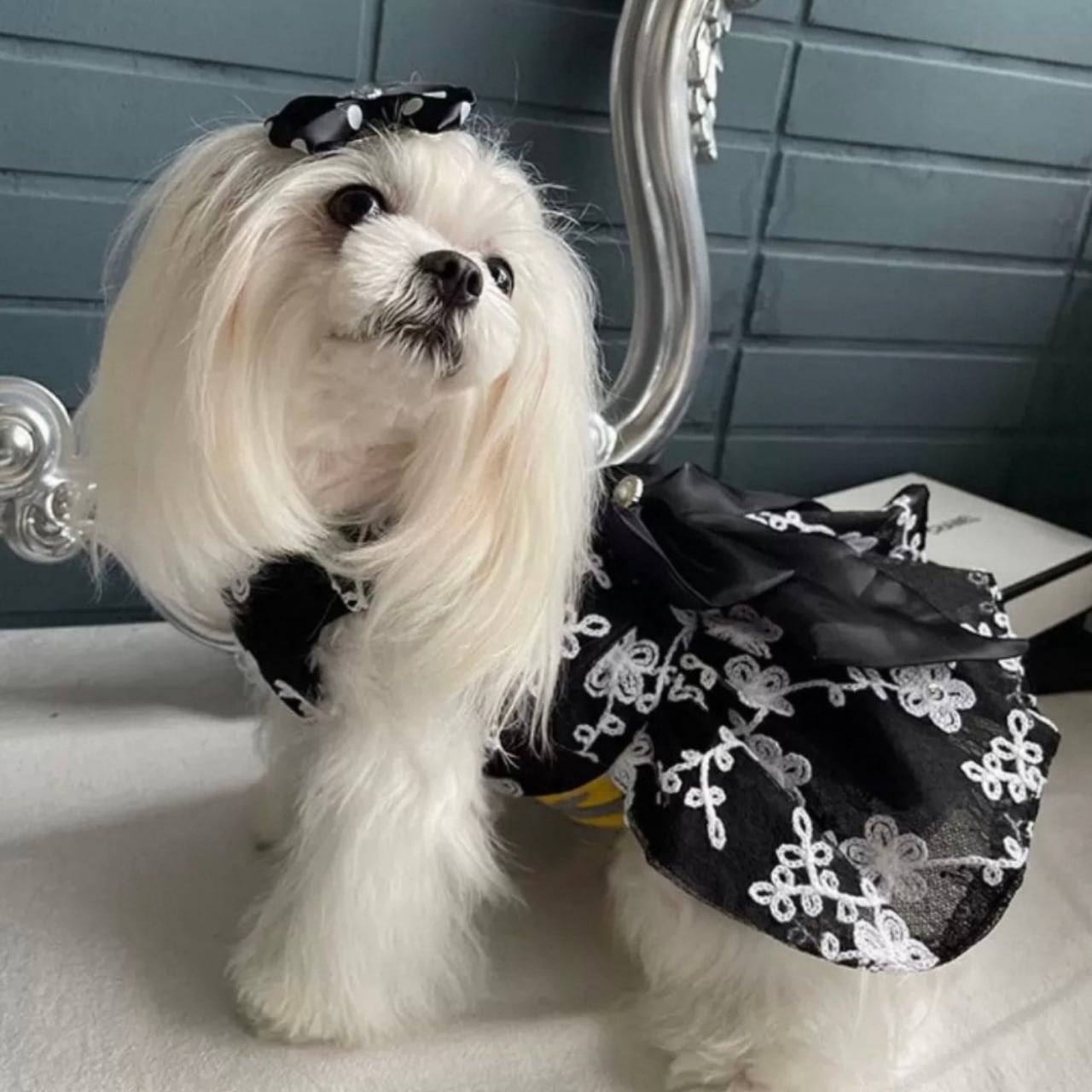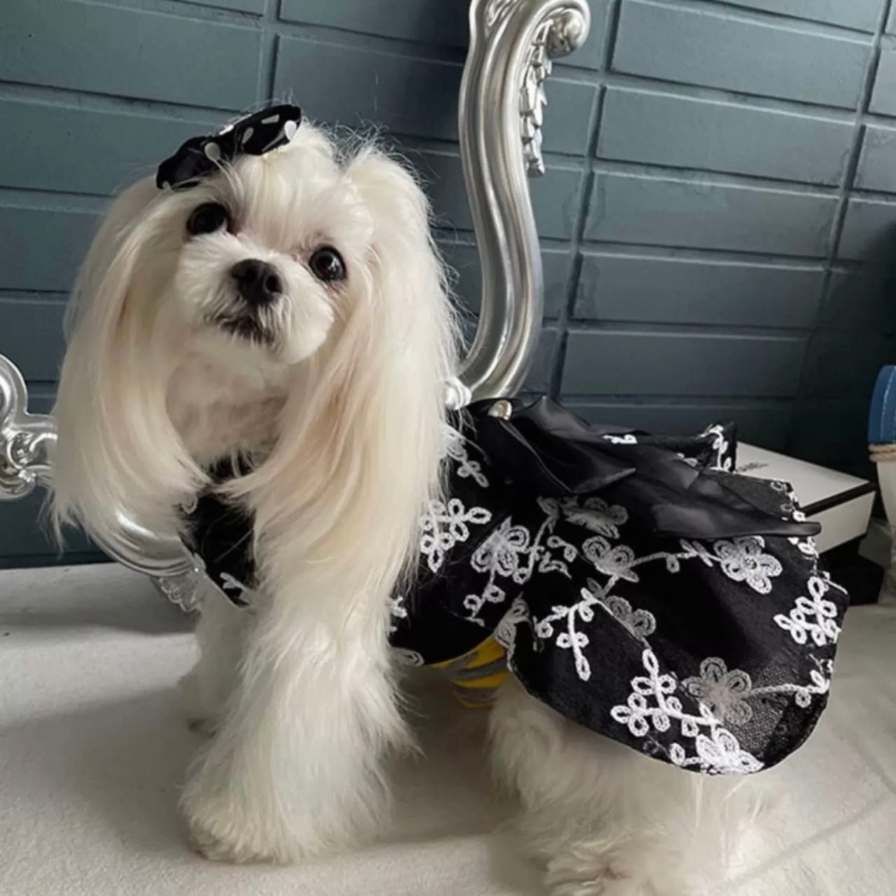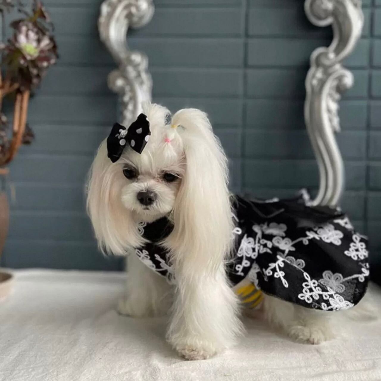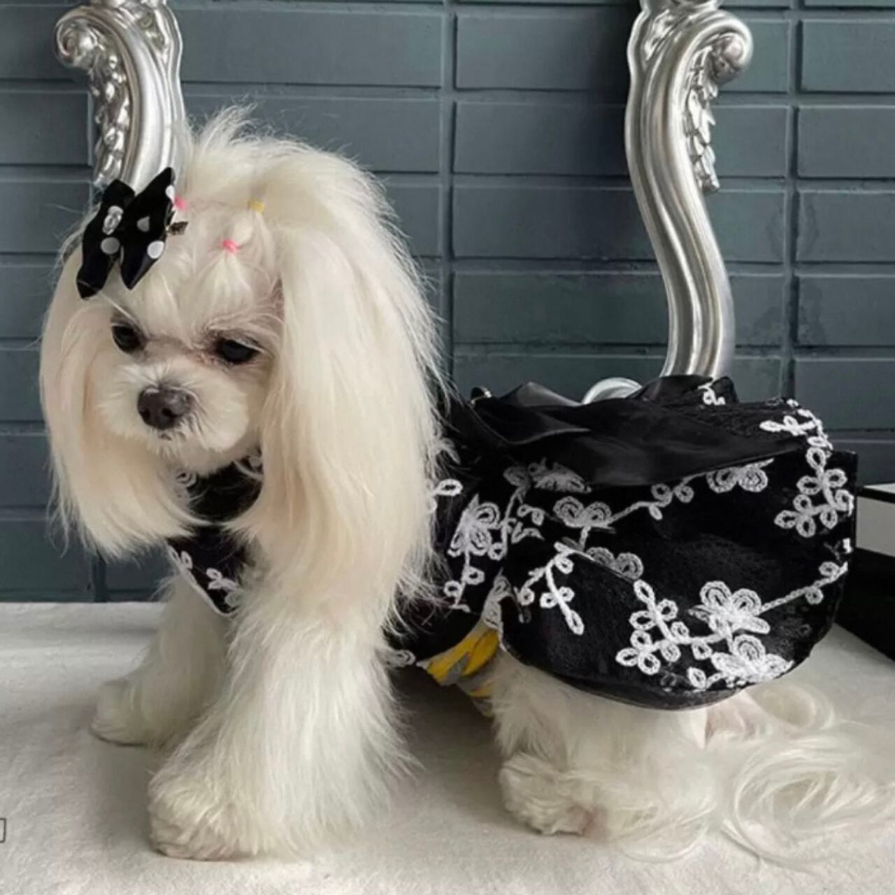 愛犬をエレガントに彩る、フレアシルエットの刺繍Aラインドッグウェア。