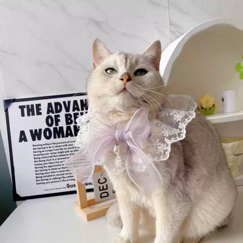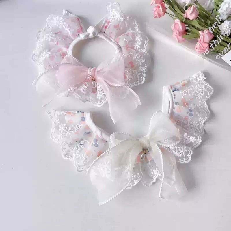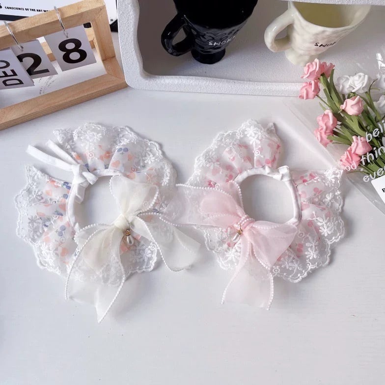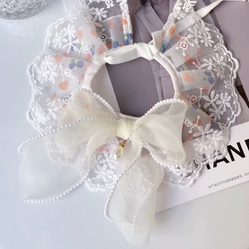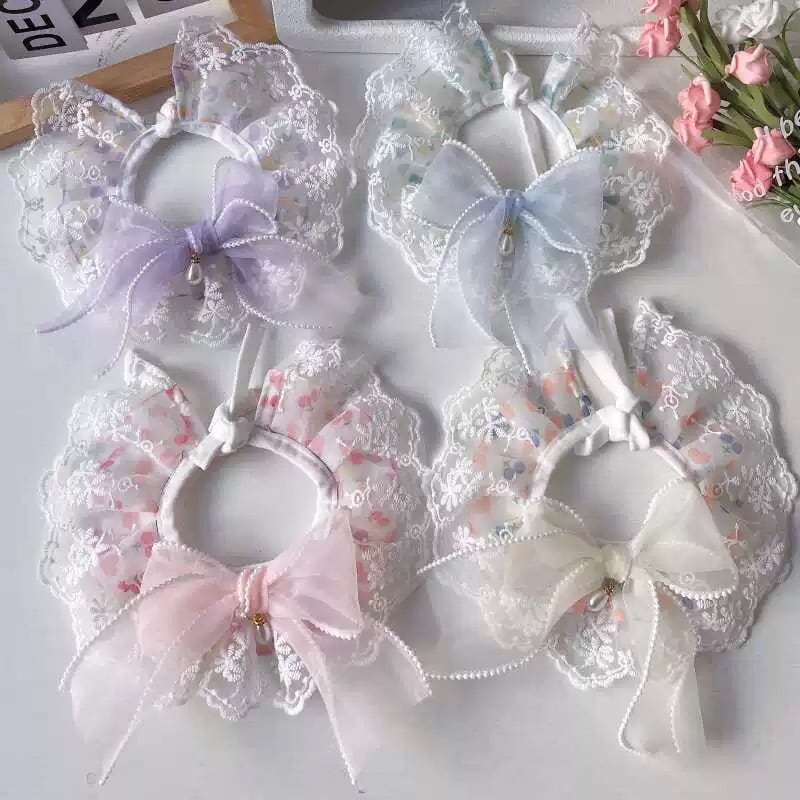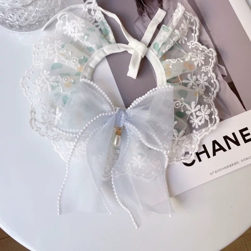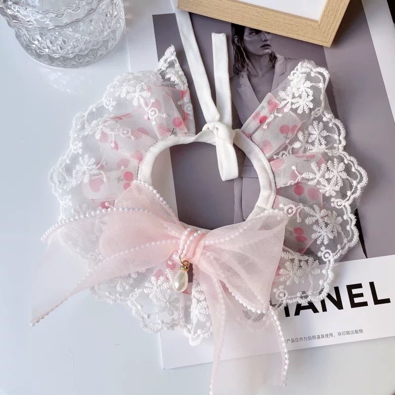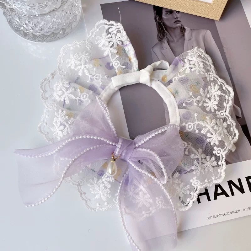 フリル襟とレースの装飾が華やかなペット用カラーです。オーガンジーリボンが上品なアクセントとなり、愛犬をより一層可愛く演出します。4種類のデザインからお選びいただけますので、お洋服や気分に合わせてコーディネートをお楽しみください。お散歩や特別なイベントにもおすすめです。